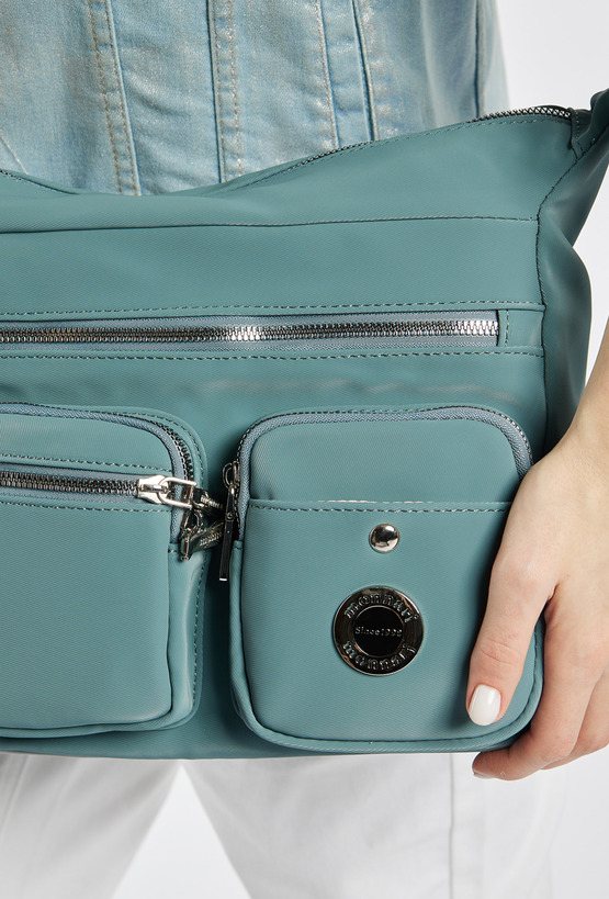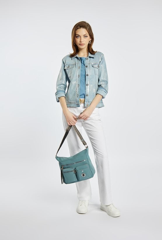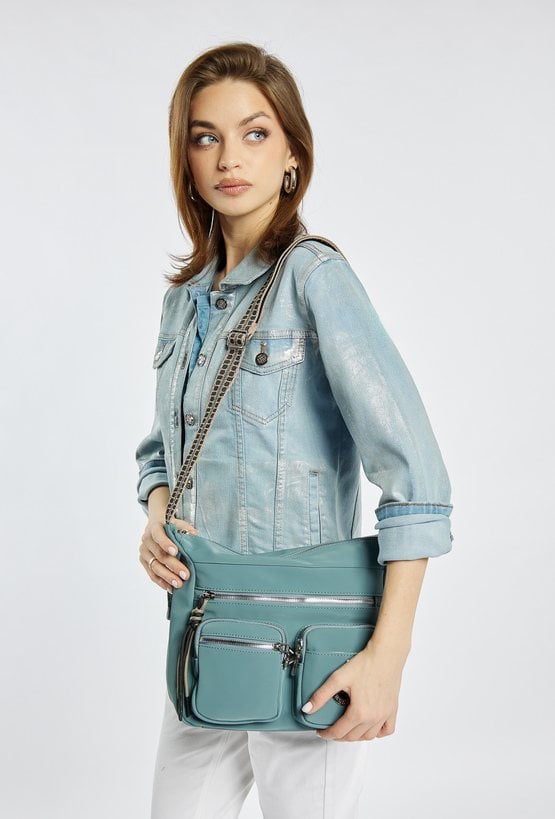 Damska torba jednokomorowa z dodatkowymi kieszonkami z przodu, idealna do przechowywania drobiazgów. Wnętrze torby zdobi jasna, logowana podszewka, a dodatkowe kieszonki zapewniają funkcjonalność. Torba zawieszona na regulowanym pasku z wzorem, który dodaje jej charakteru i wygody noszenia. Wymiary: 30 cm x 25, 5 cm x 10 cm