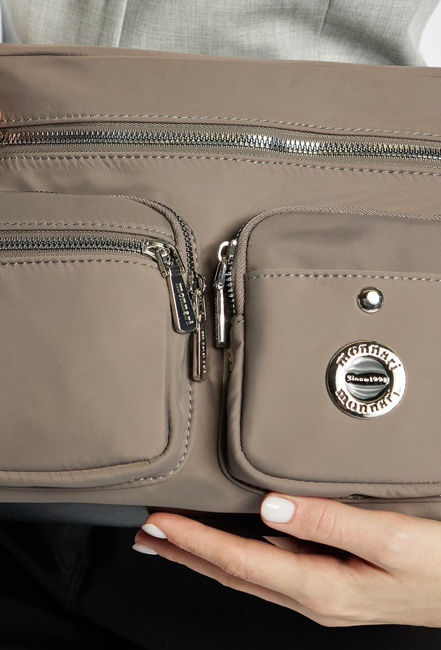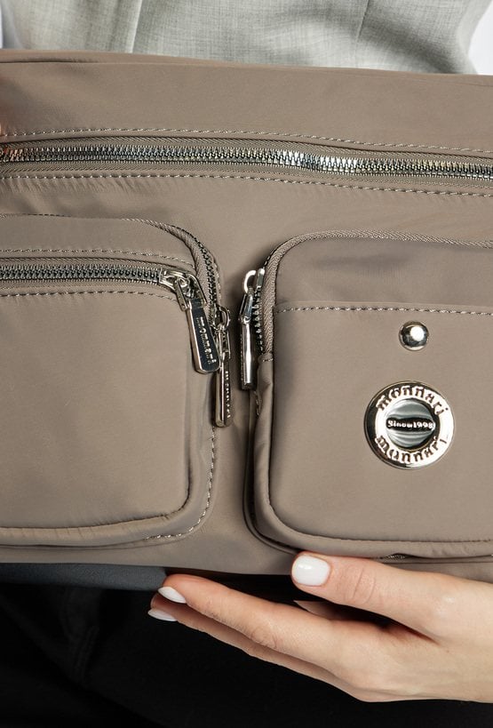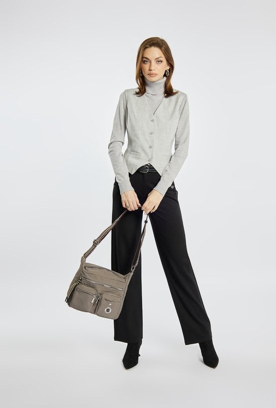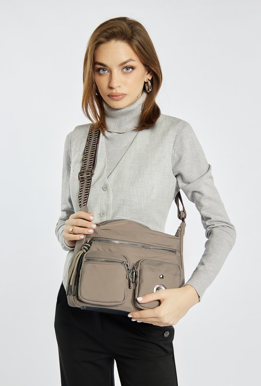 Damska torba jednokomorowa z dodatkowymi kieszonkami z przodu, idealna do przechowywania drobiazgów. Wnętrze torby zdobi jasna, logowana podszewka, a dodatkowe kieszonki zapewniają funkcjonalność. Torba zawieszona na regulowanym pasku z wzorem, który dodaje jej charakteru i wygody noszenia. Wymiary: 30 cm x 25, 5 cm x 10 cm