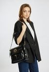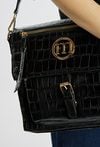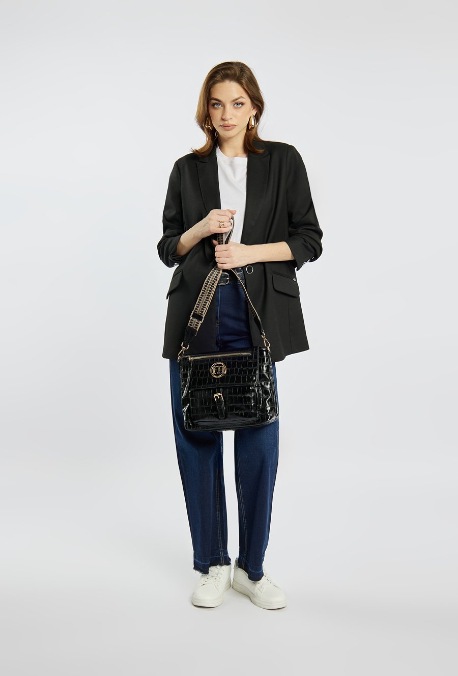 Damska torba na pasku z możliwością jego odpięcia, jednokomorowa, zapinana na suwak oraz klapę. Wewnątrz znajduje się kilka kieszonek na drobiazgi, a z przodu dodatkowe miejsce na akcesoria. Torba ozdobiona biżuteryjnym logo marki Monnari, co dodaje jej elegancji. Wymiary torby to 30 cm x 24 cm x 11 cm.