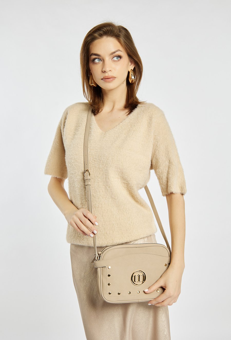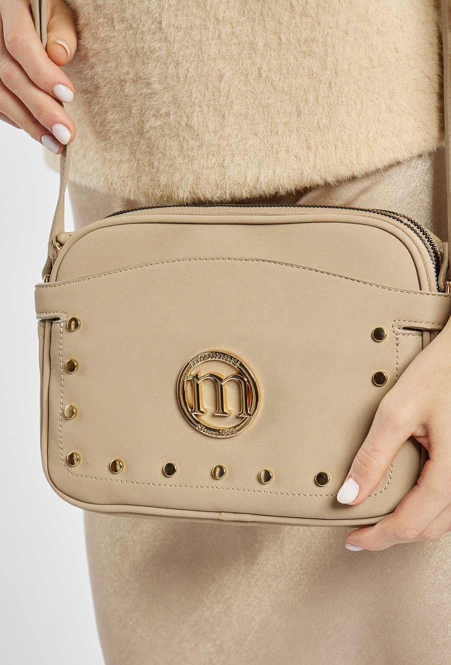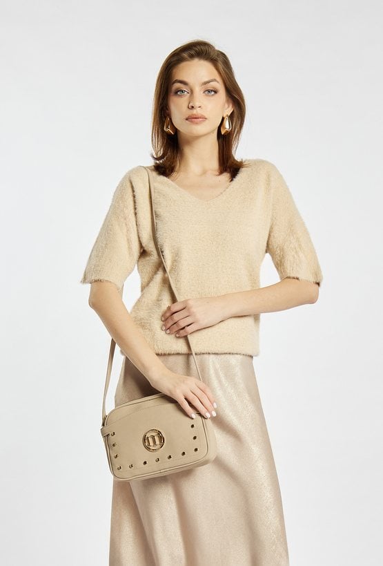 Dwukomorowa torebka damska o wymiarach 26 cm x 18 cm x 6 cm, łącząca styl i funkcjonalność. Wnętrze wykończone jasną, logowaną podszewką z praktycznymi kieszonkami zapewnia wygodę i porządek. Torebkę zdobi efektowne logo marki Monnari oraz subtelne ćwieki, które dodają jej charakteru. Idealny wybór na co dzień i wyjątkowe okazje.