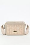 Elegancka torebka damska o sztywnej, starannie wykonanej konstrukcji. Model dwukomorowy, wykończony jasnymi, logowanymi podszewkami, z dodatkową kieszonką wewnątrz, idealną na drobne akcesoria. Torebka zapinana na solidne suwaki, zawieszona na regulowanym pasku materiałowym Torbę należy przechowywać w załączonym woreczku. Wymiary torby: 19,5 cm x 12 cm x 7 cm.