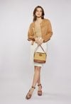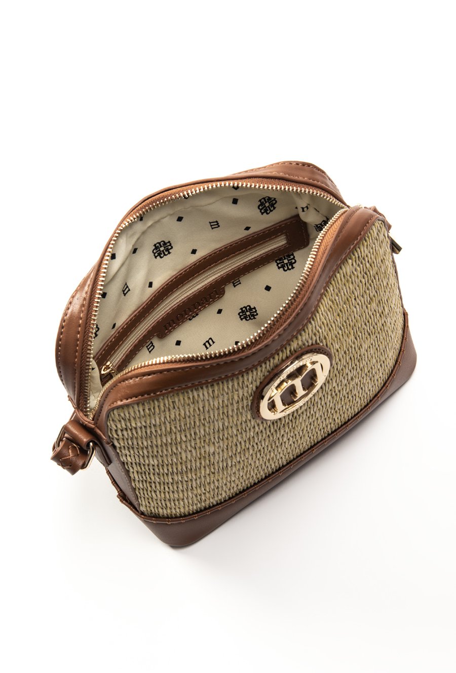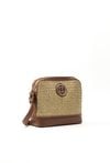 Kuferek damski z plecionym panelem. Torba jednokomorowa o jasnej, logowanej podszewce z dodatkowymi kieszonkami na drobiazgi w środku oraz z tyłu. Torba zapinana na suwak, zawieszona na regulowanym pasku. Torbę należy przechowywać w dołączonym woreczku. Wymiary Torby: 24 cm x 21 cm x 9 cm