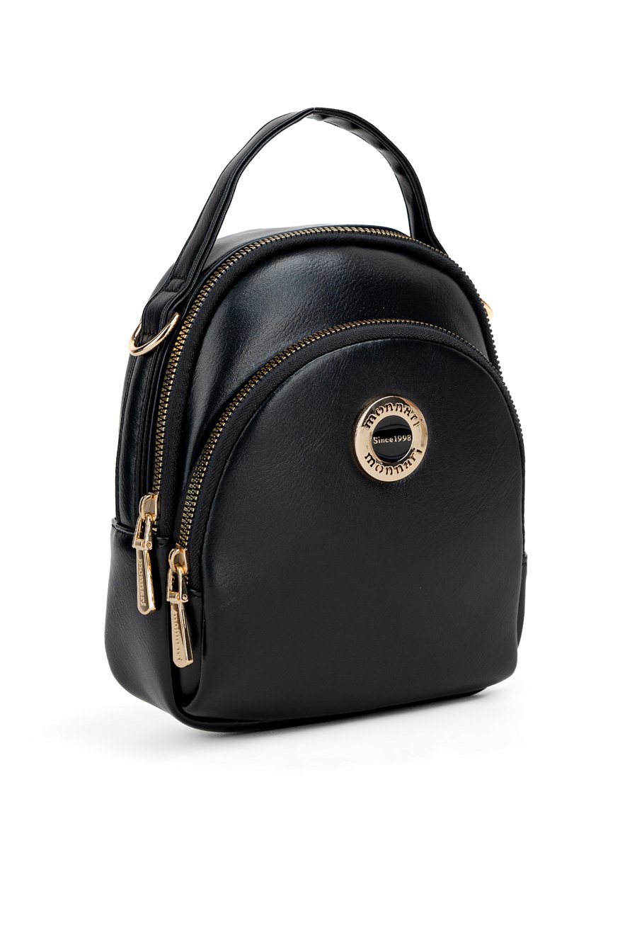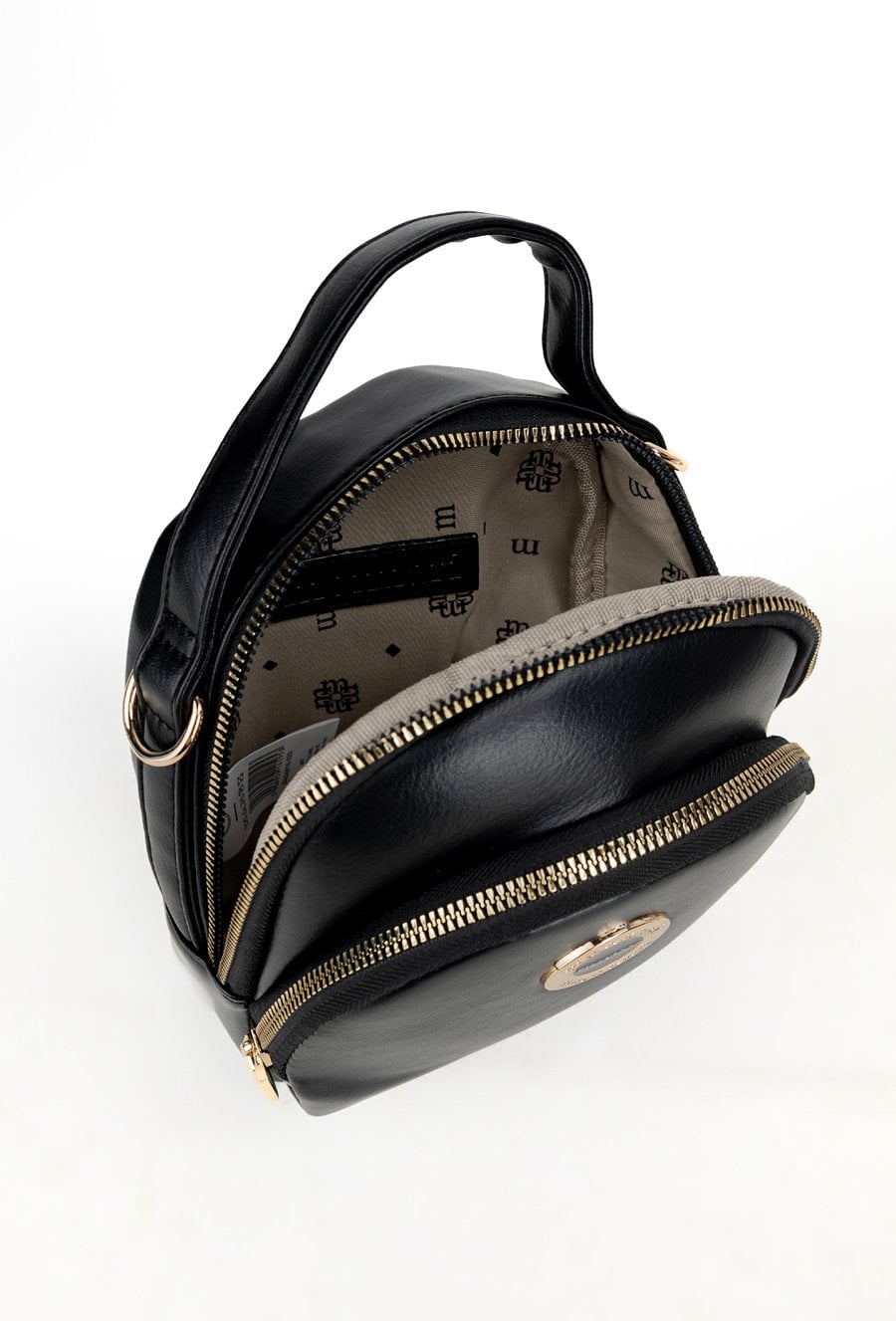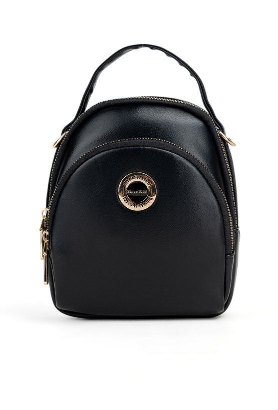 Torebka damska o wymiarach 16 × 20 × 5 cm, zdobiona złotym logo marki. Posiada dwie kieszenie zapinane na suwak. Wyposażona w odpinany i regulowany pasek. Produkt należy przechowywać w dołączonym woreczku ochronnym.