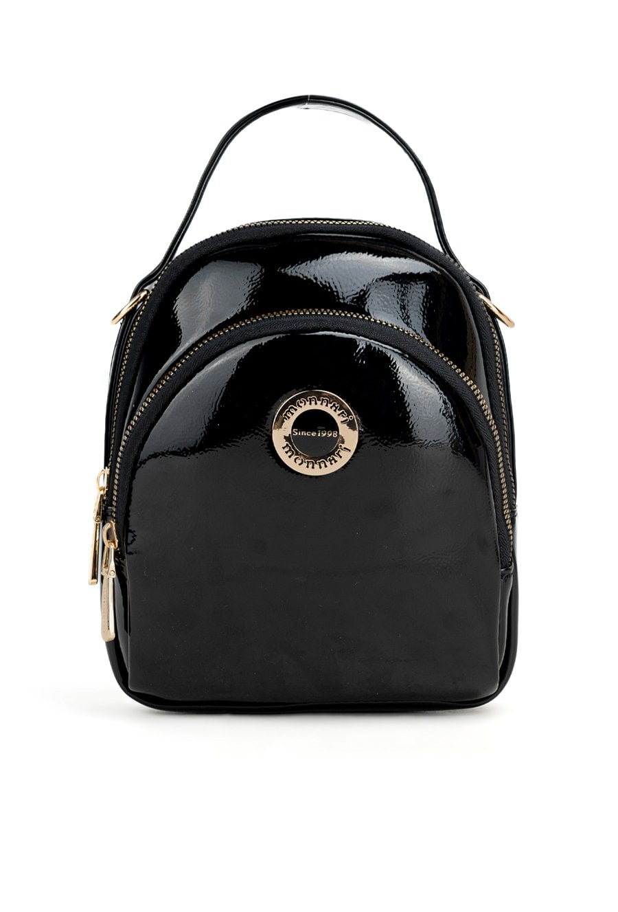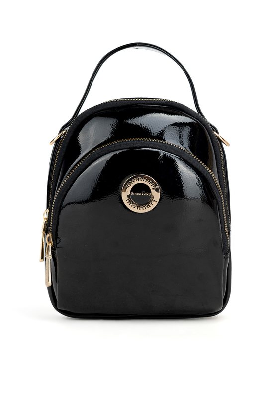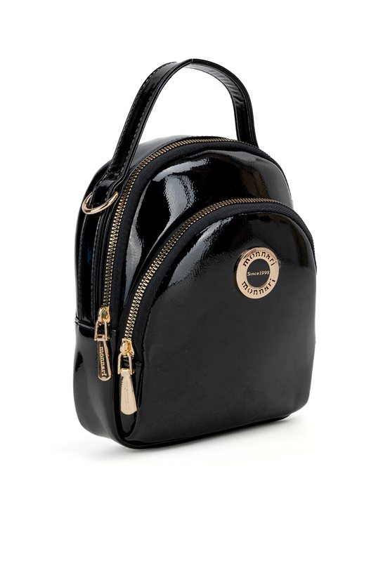 Torebka damska o wymiarach 16 × 20 × 5 cm, zdobiona złotym logo marki. Posiada dwie kieszenie zapinane na suwak. Wyposażona w odpinany i regulowany pasek. Produkt należy przechowywać w dołączonym woreczku ochronnym.