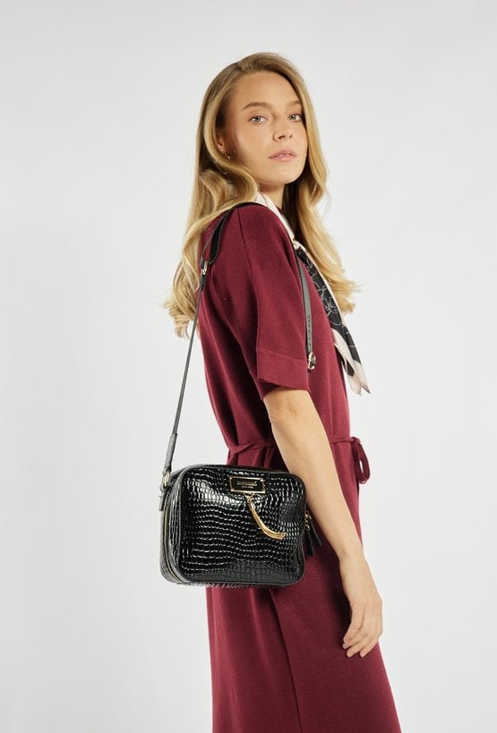 Mała damska torebka to idealny wybór na co dzień – poręczna, lekka i stylowa. Jednokomorowe wnętrze zapinane na suwak uzupełniono o praktyczne kieszonki na drobiazgi. Regulowany pasek pozwala nosić ją na różne sposoby, dopasowując do okazji. Stylowym akcentem jest złoty frędzel umieszczony w górnej części torebki. Torbę należy przechowywać w dołączonym woreczku. Wymiary: 21 cm x 19 cm x 7 cm.