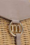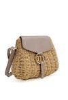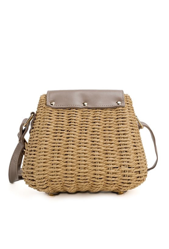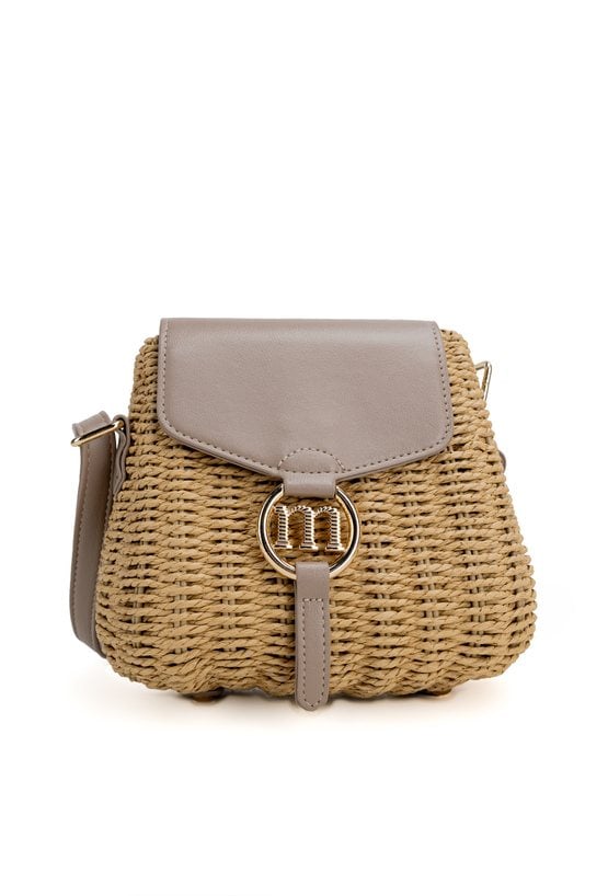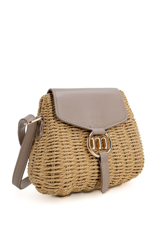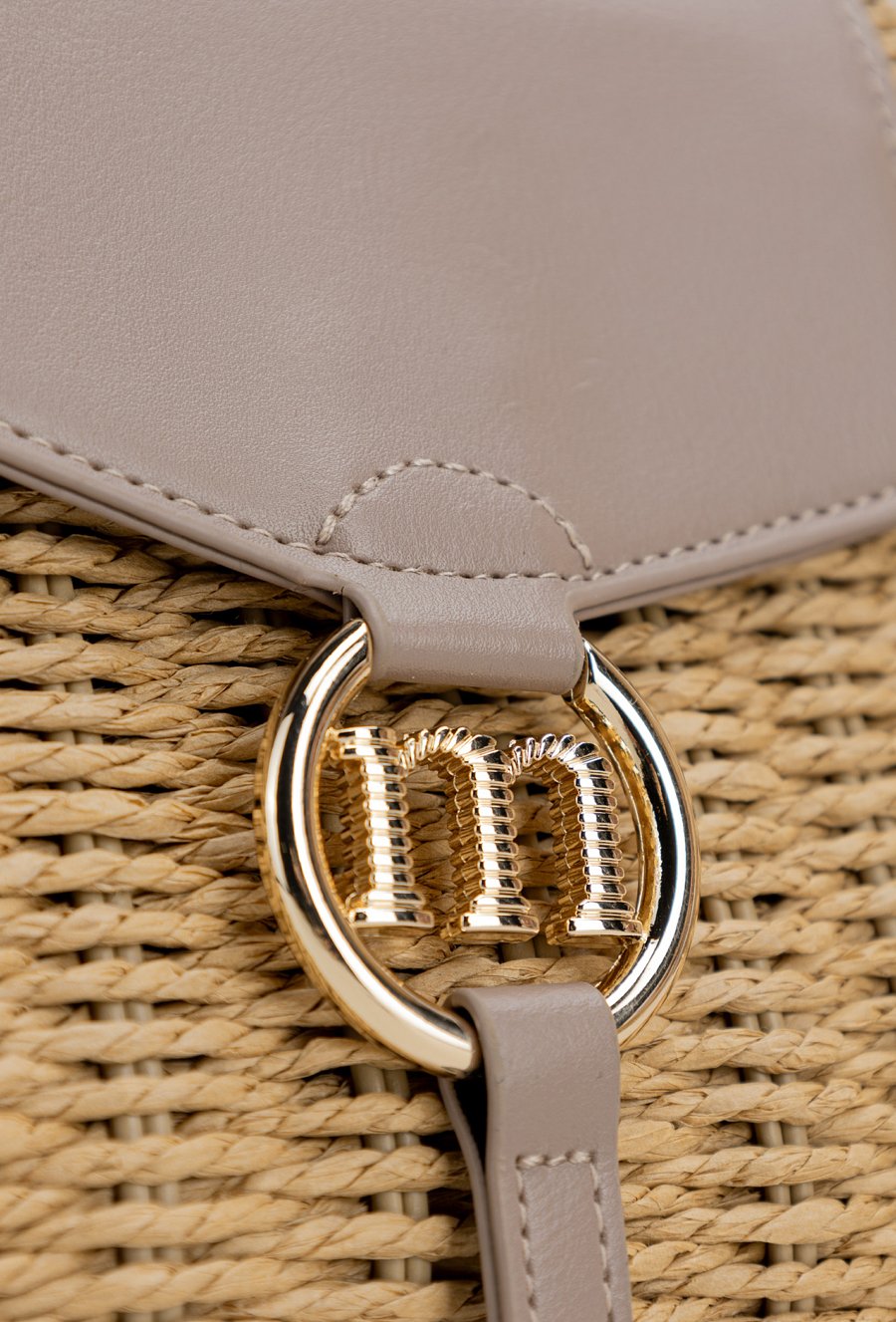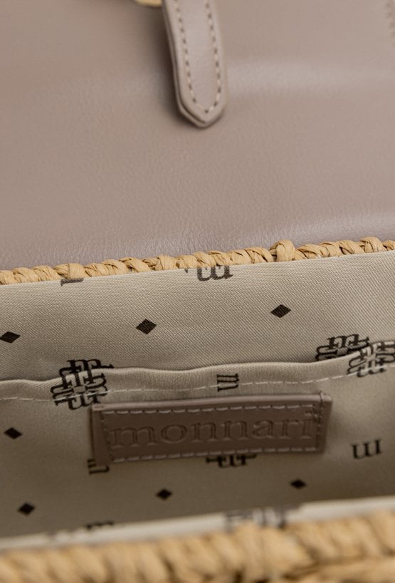 Mały koszyk damski z plecionką. Jednokomorowy model z jasną, logowaną podszewką oraz dodatkową kieszonką na drobiazgi. Torebka zawieszona na regulowanym pasku, zapinana na klapę z napą. Torbę należy przechowywać w dołączonym woreczku. Wymiary: 23 cm x 17 cm x 13 cm