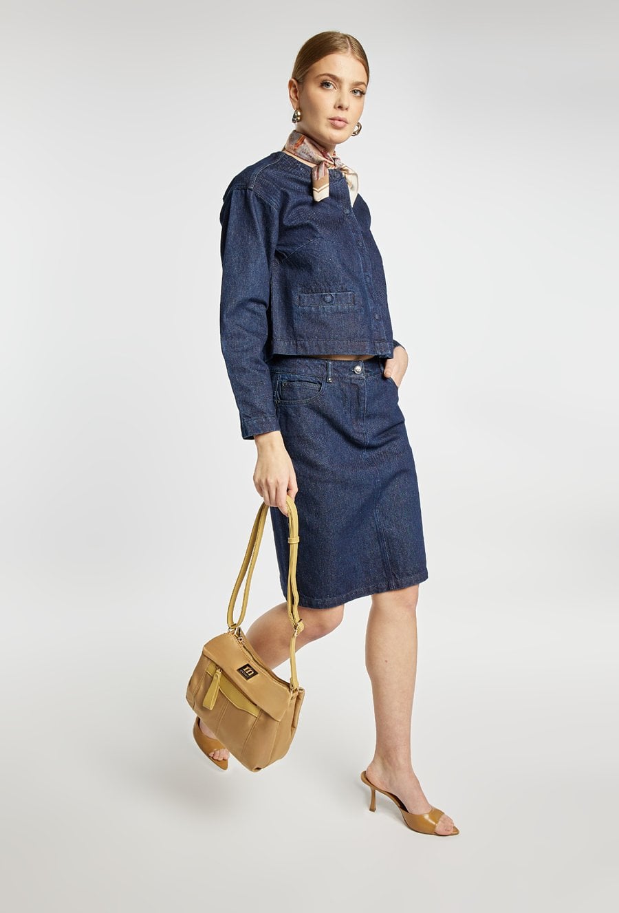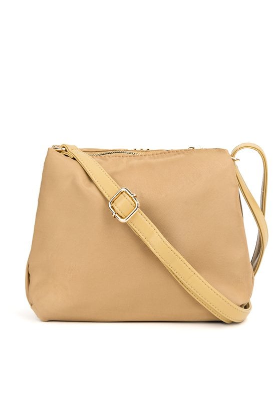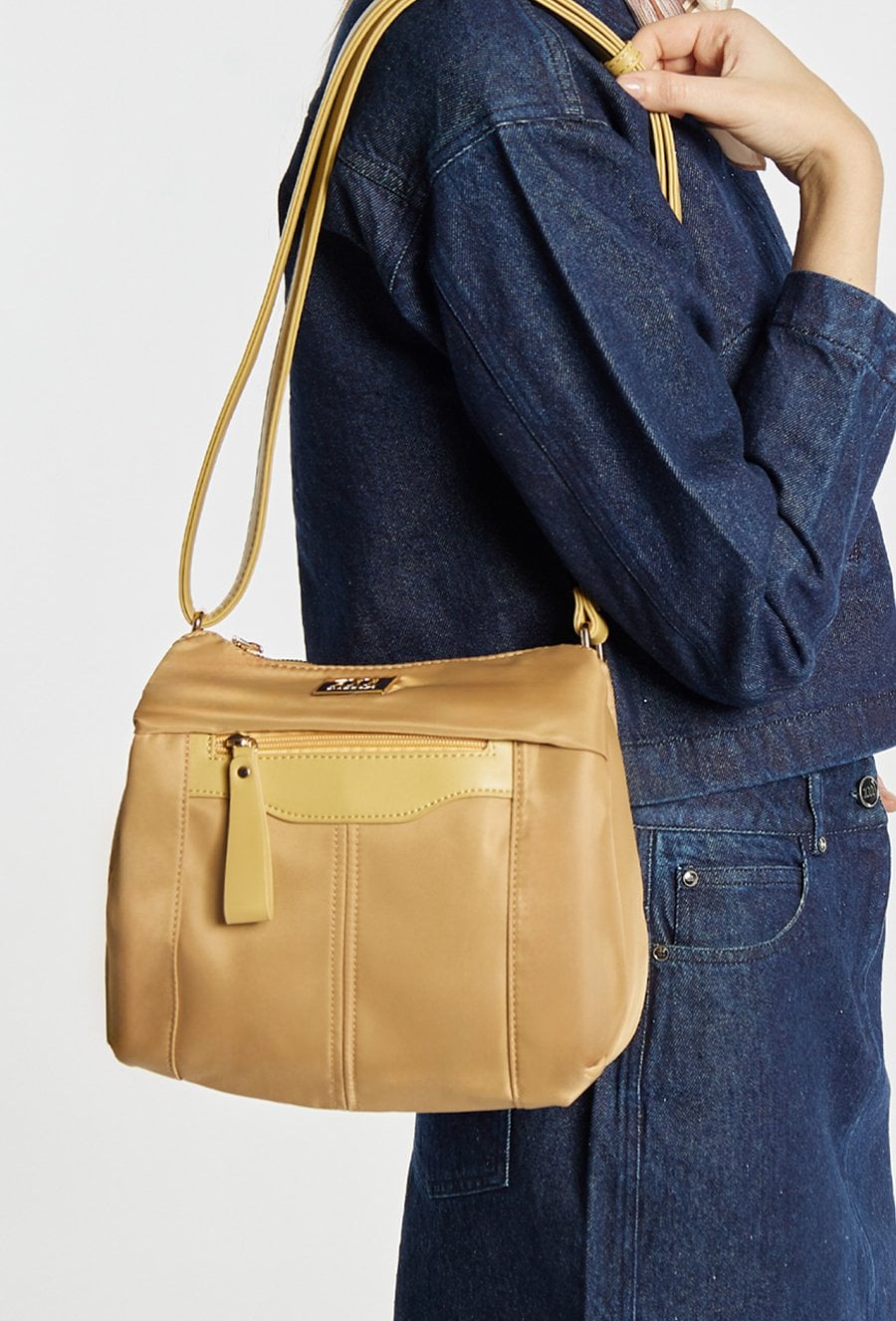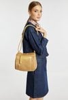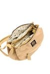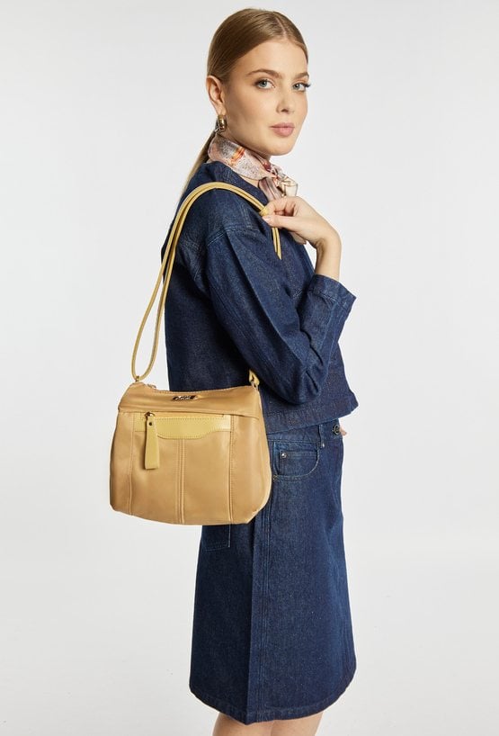 Tekstylna torebka damska o wymiarach 27 × 26 × 9 cm. Jednokomorowe wnętrze podzielono na trzy praktyczne przegródki w jasnych odcieniach, wzbogacone o dodatkowe kieszonki ułatwiające organizację drobiazgów. Model zawieszono na regulowanym pasku, który pozwala idealnie dopasować sposób noszenia do własnych preferencji. Torbę należy przechowywać w dołączonym woreczku.