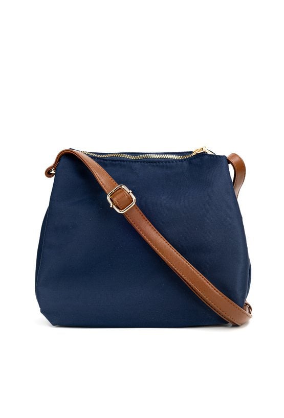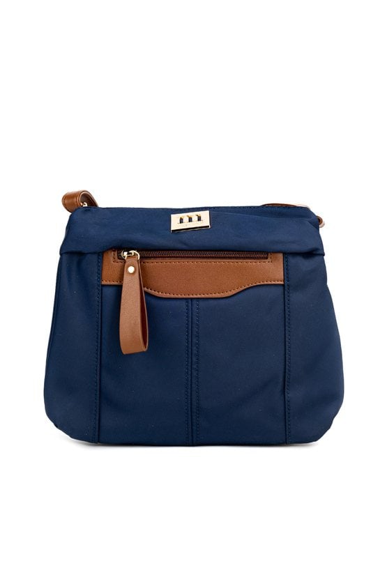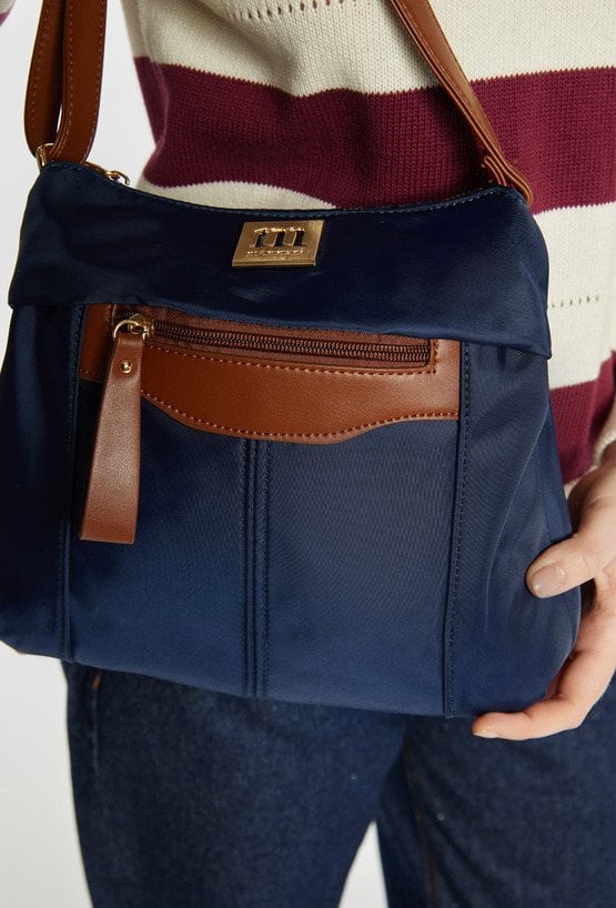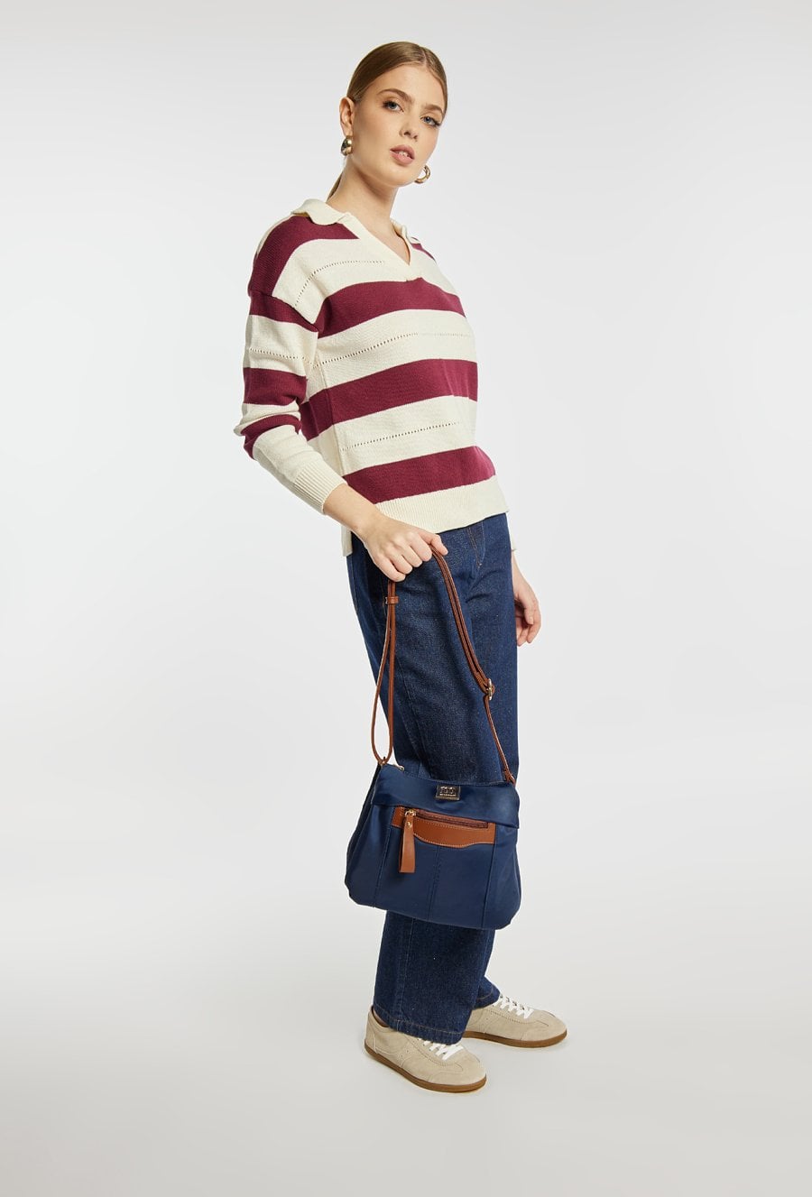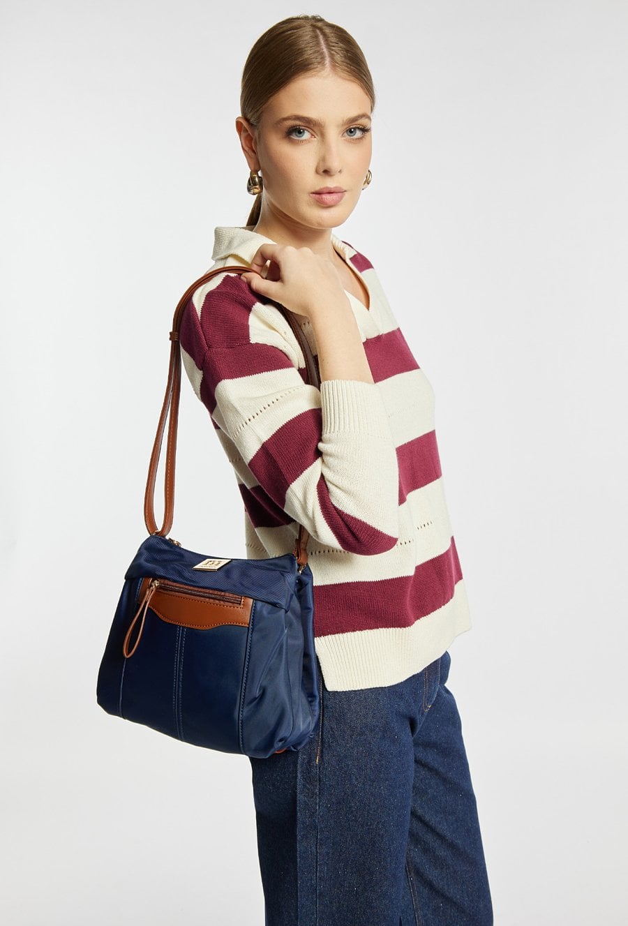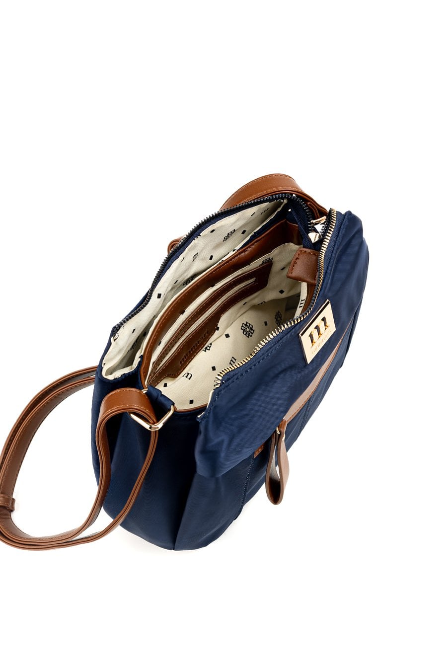 Tekstylna torebka damska o wymiarach 27 × 26 × 9 cm. Jednokomorowe wnętrze podzielono na trzy praktyczne przegródki w jasnych odcieniach, wzbogacone o dodatkowe kieszonki ułatwiające organizację drobiazgów. Model zawieszono na regulowanym pasku, który pozwala idealnie dopasować sposób noszenia do własnych preferencji. Torbę należy przechowywać w dołączonym woreczku.
