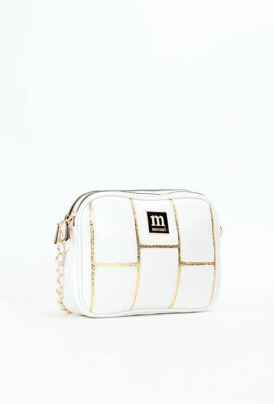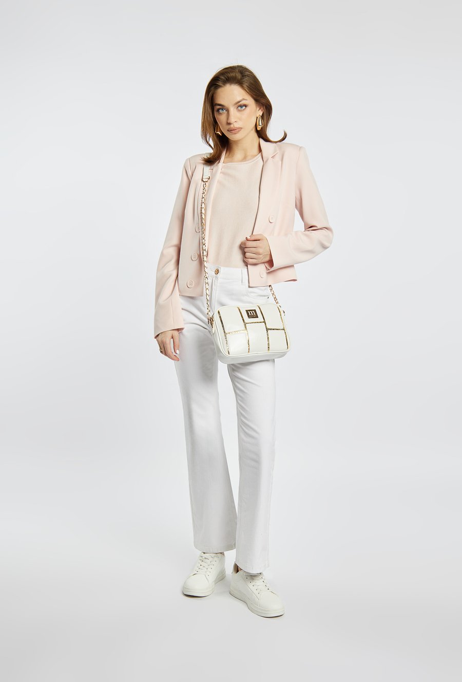 Torba damska typu crossbody zawieszona na pasku z łańcuszkiem. Model dwukomorowy, wyposażony w jasne, logowane podszewki, zapewnia wygodę organizacji dzięki dodatkowym kieszonkom idealnym na drobiazgi. Delikatne połyskujące detale podkreślają jej wyjątkowy charakter. Torbę należy przechowywać w załączonym woreczku. Wymiary: 25 cm x 18 cm x 5 cm.