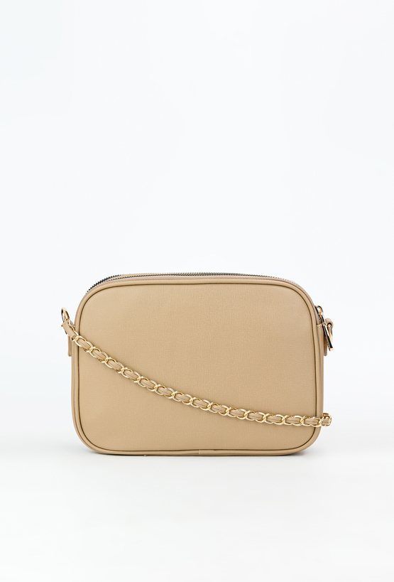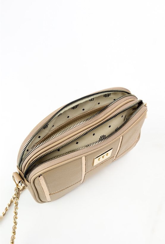 Torba damska typu crossbody zawieszona na pasku z łańcuszkiem. Model dwukomorowy, wyposażony w jasne, logowane podszewki, zapewnia wygodę organizacji dzięki dodatkowym kieszonkom idealnym na drobiazgi. Delikatne połyskujące detale podkreślają jej wyjątkowy charakter. Torbę należy przechowywać w załączonym woreczku. Wymiary: 25 cm x 18 cm x 5 cm.