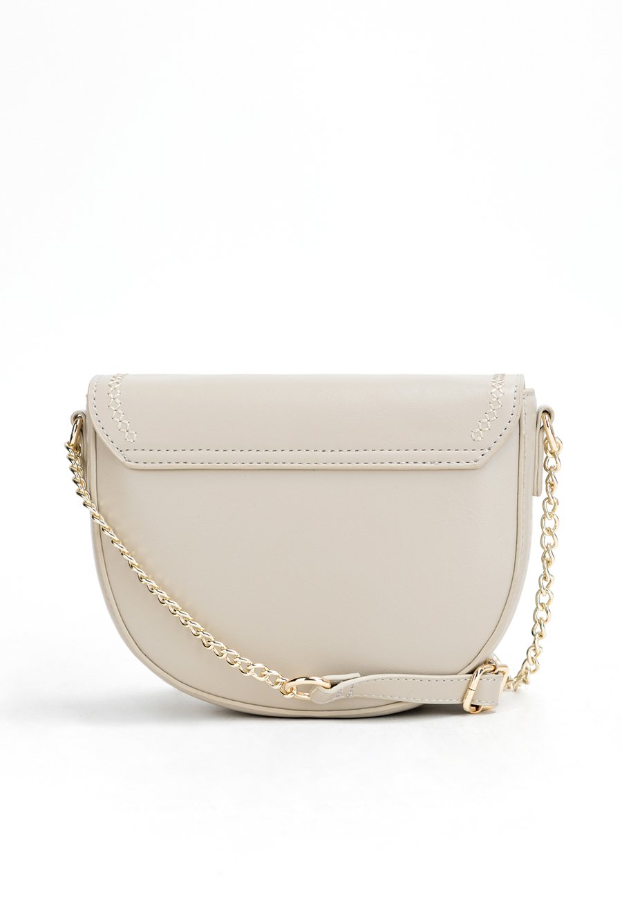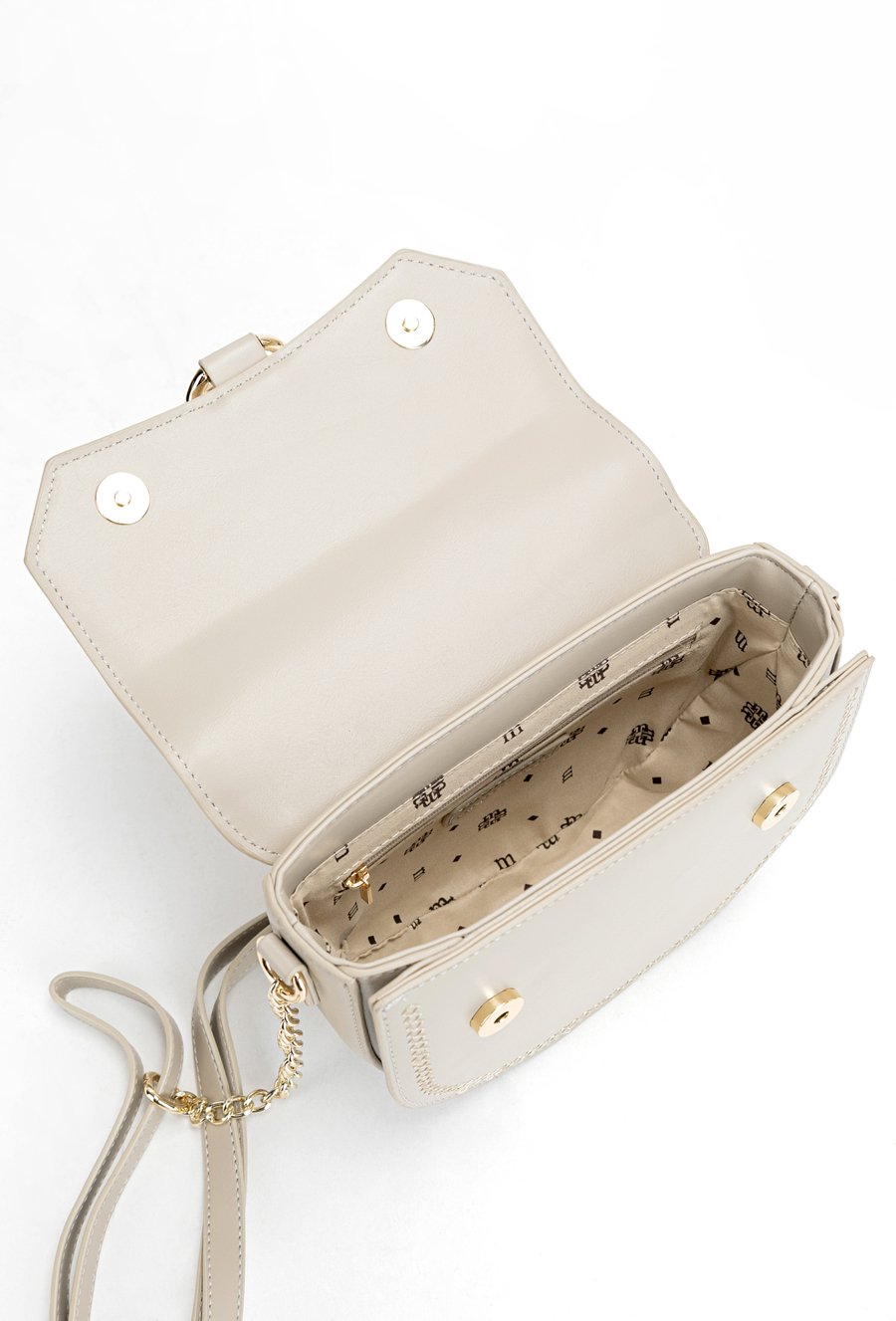Torba damska typu crossbody z biżuteryjnym logo marki Monnari. Torebka jednokomorowa o jasnym wnętrzu z dodatkowymi kieszonkami na drobiazgi. Torba zapinana na klapę z napami, zawieszona na regulowanym pasku z łańcuszkiem. Torbę należy przechowywać w dołączonym woreczku. Wymiary Torby: 20,5 cm x 16,5 cm x 5,5 cm.