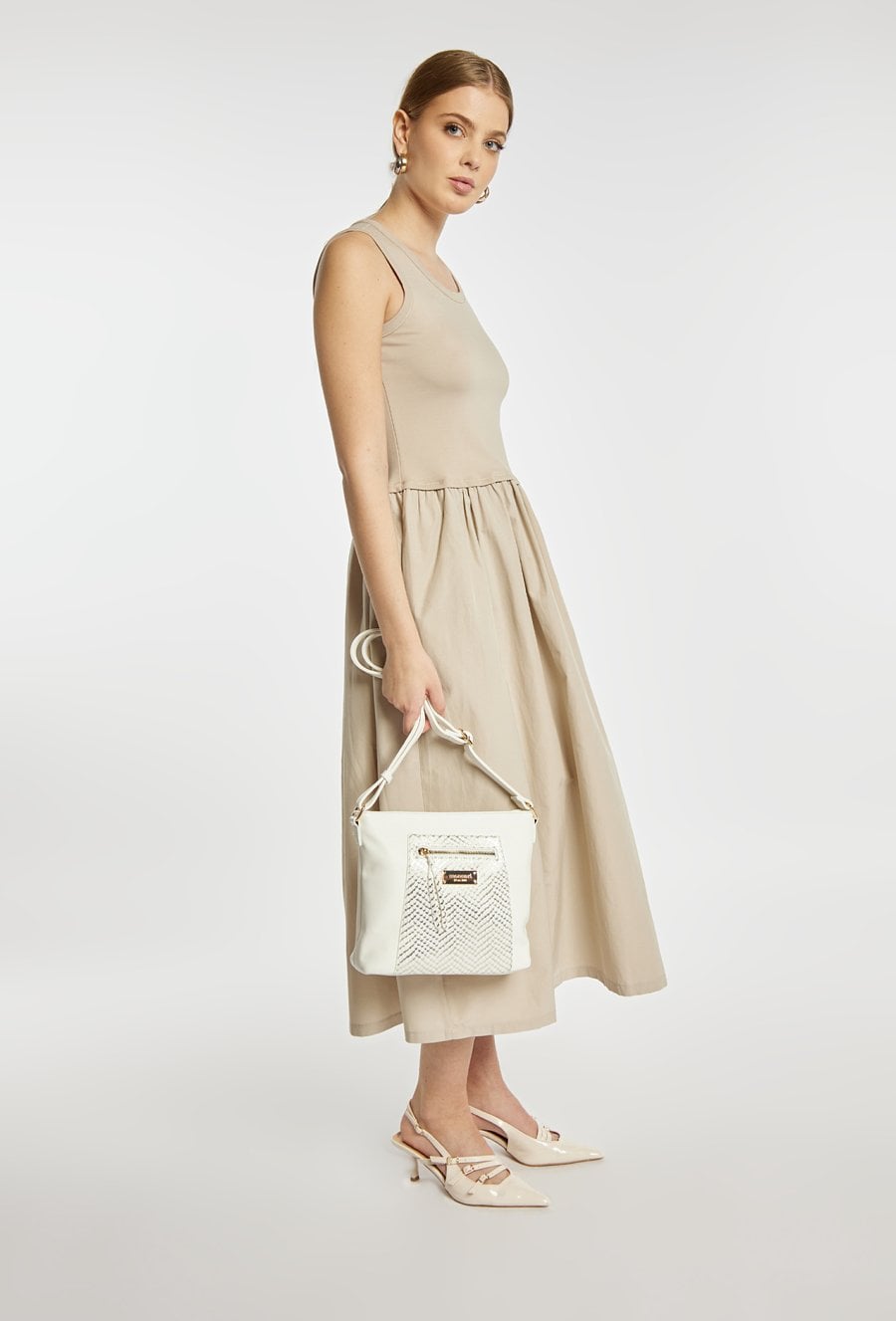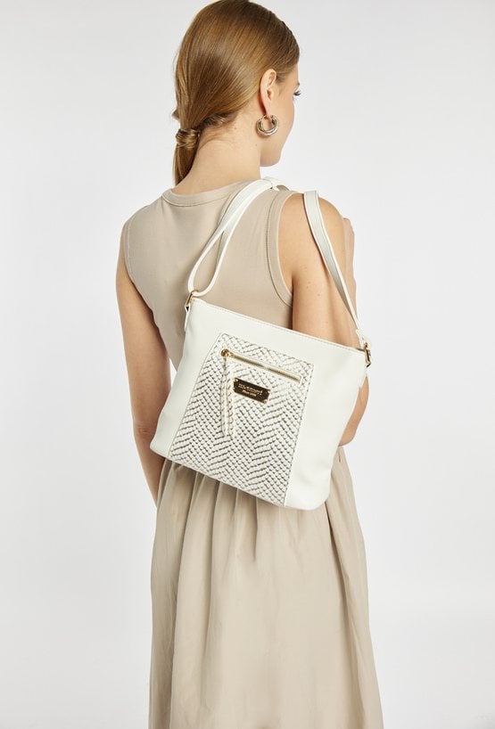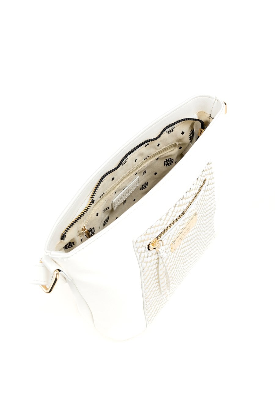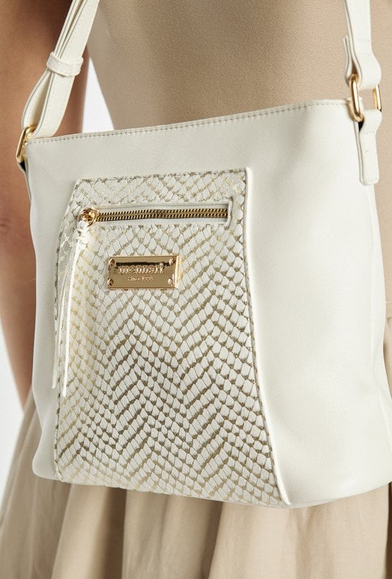 Torebka damska o wymiarach 28 cm x 24 cm x 8 cm. Torba jednokomorowa, z jasną, logowaną podszewką oraz dodatkowymi kieszonkami na drobiazgi, które ułatwiają organizację. Torba zawieszona na regulowanym pasku, zapewniającym wygodę noszenia. Z przodu zdobi ją kieszonka z efektownym wzorem, dodająca całości wyjątkowego charakteru. Torbę należy przechowywać w załączonym woreczku.