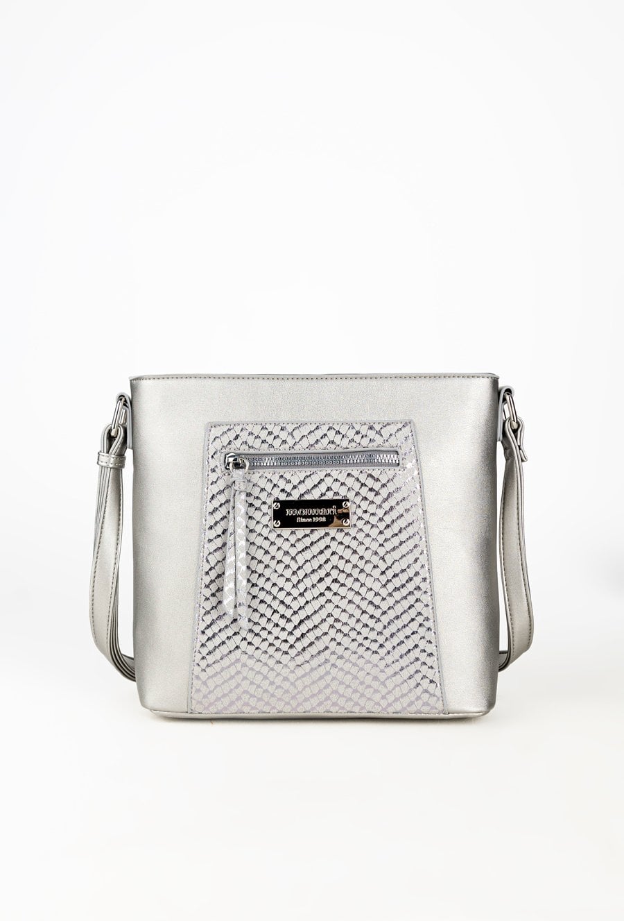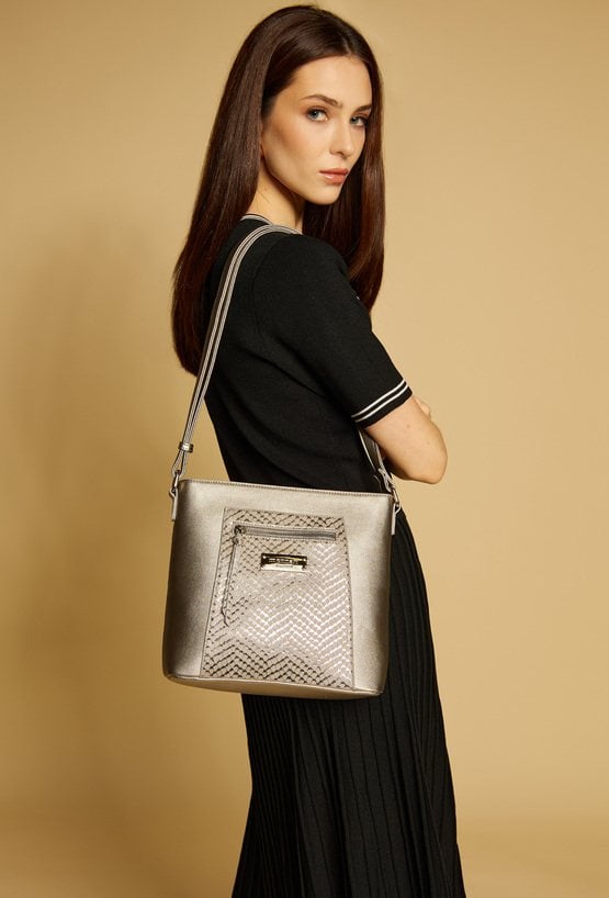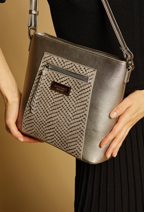 Torebka damska o wymiarach 28 cm x 24 cm x 8 cm. Torba jednokomorowa, z jasną, logowaną podszewką oraz dodatkowymi kieszonkami na drobiazgi, które ułatwiają organizację. Torba zawieszona na regulowanym pasku, zapewniającym wygodę noszenia. Z przodu zdobi ją kieszonka z efektownym wzorem, dodająca całości wyjątkowego charakteru. Torbę należy przechowywać w załączonym woreczku.