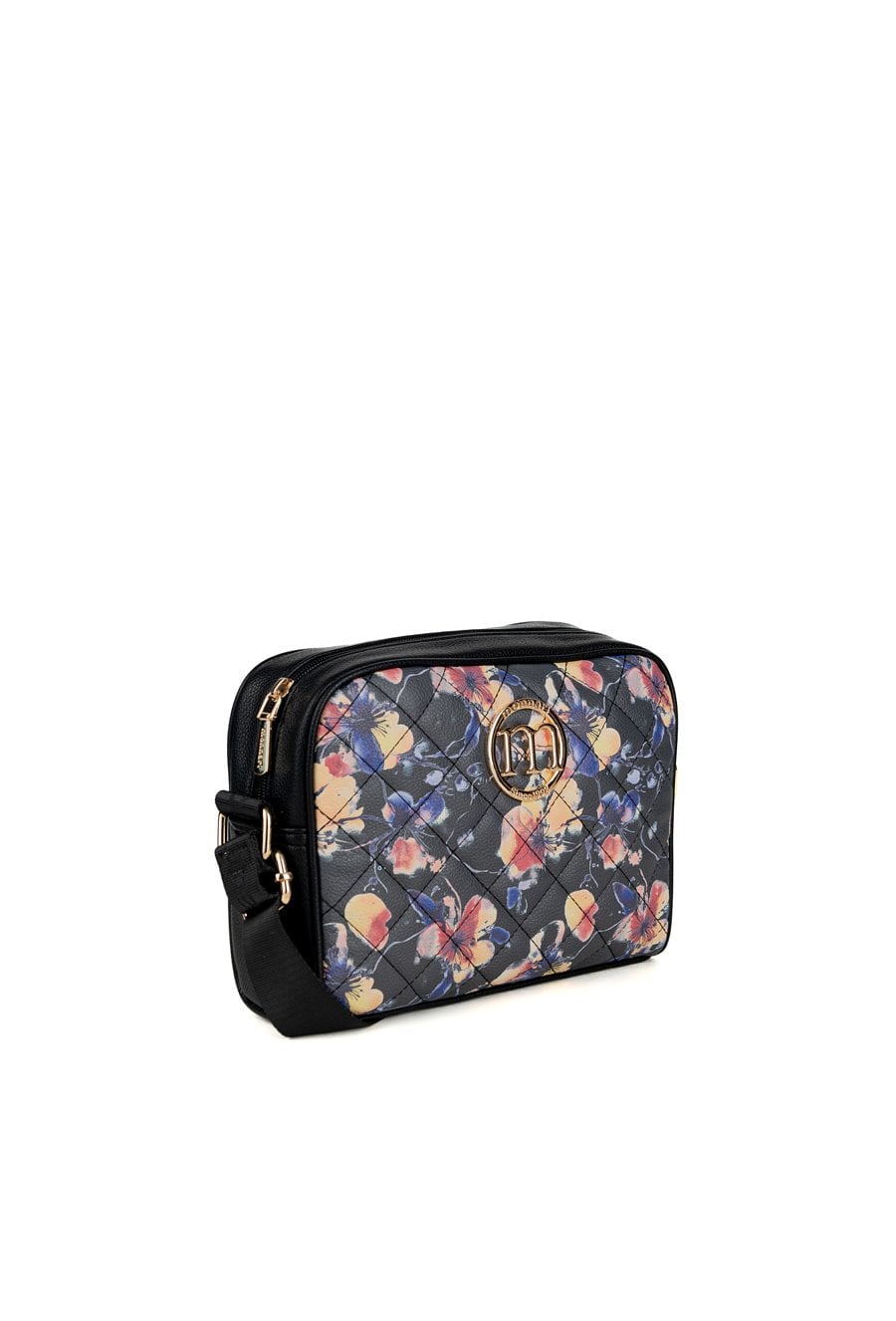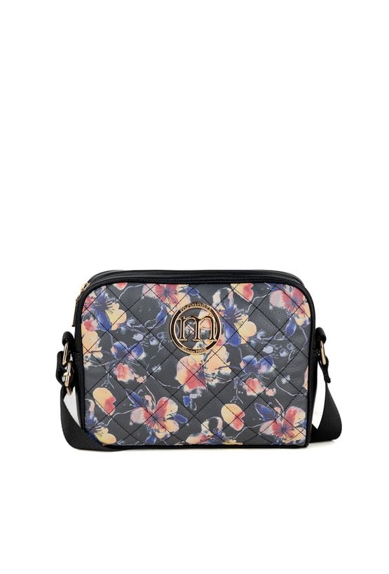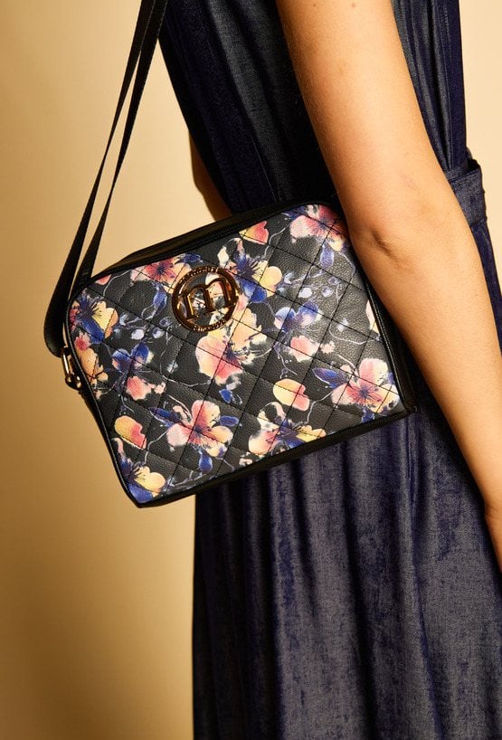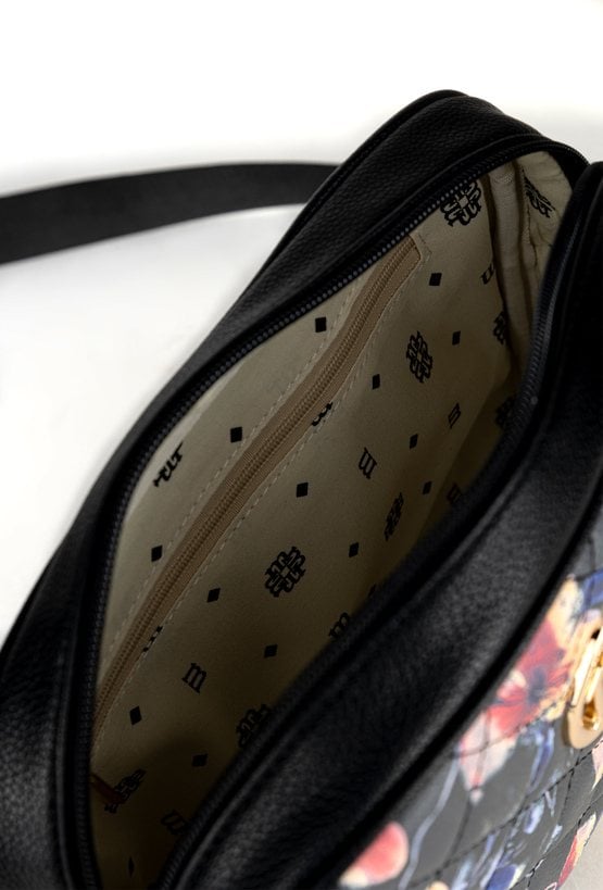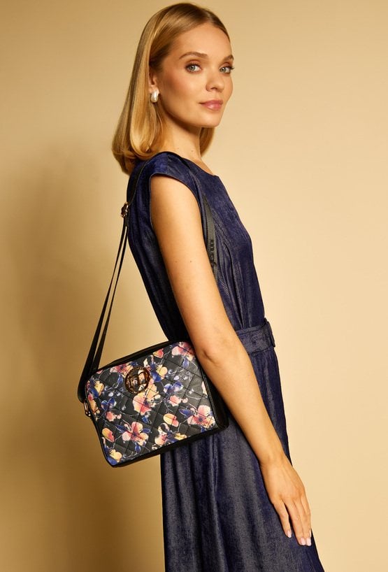 Damska torba z kwiatowym wzorem, doskonała do wiosennych stylizacji. Torba jednokomorowa o jasnej logowanej podszewce z dodatkowymi kieszonkami na drobiazgi. Torba zawieszona na regulowanym pasku. Torbę należy przechowywać w załączonym woreczku. Wymiary: 24 cm x 18 cm x 8,5 cm.