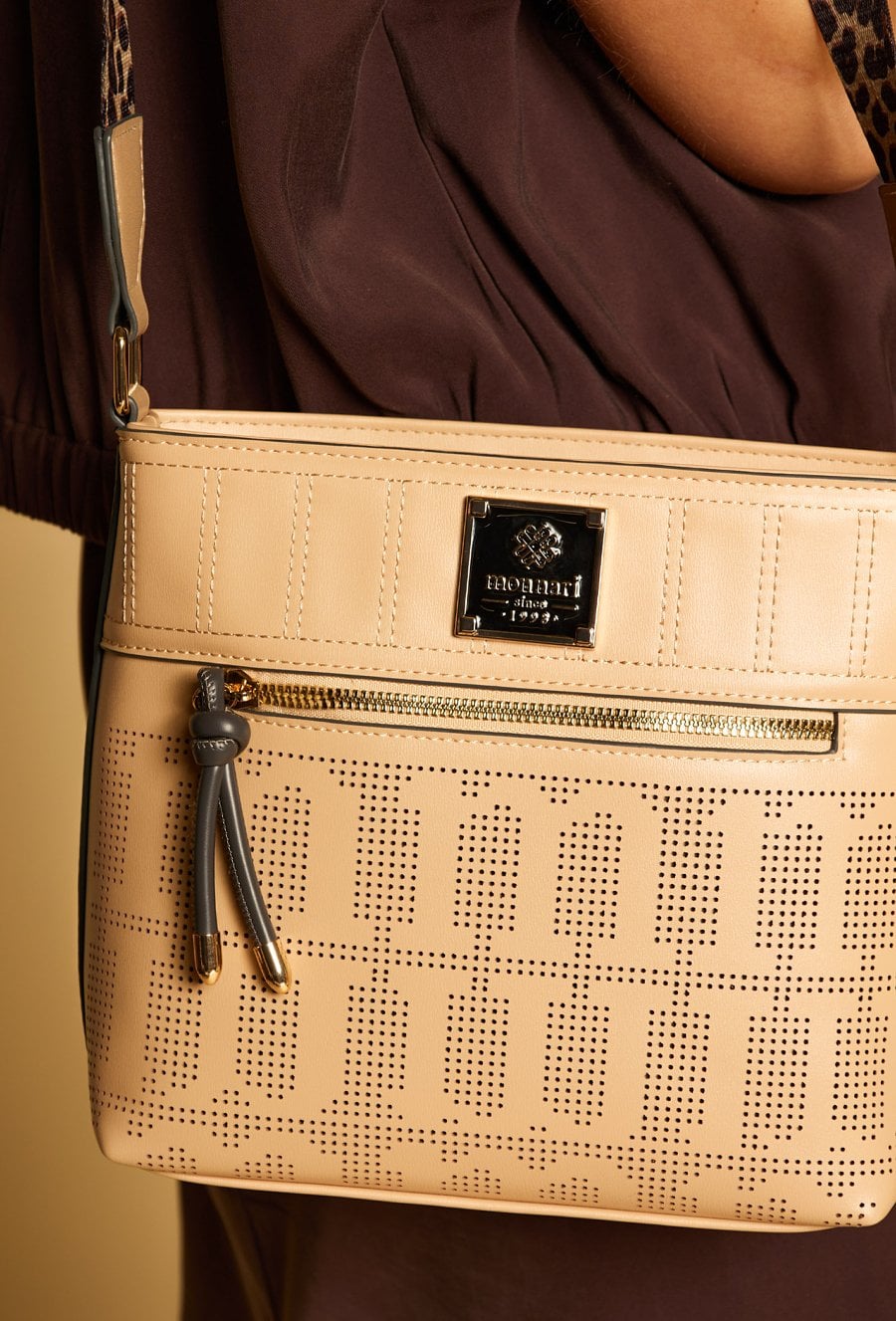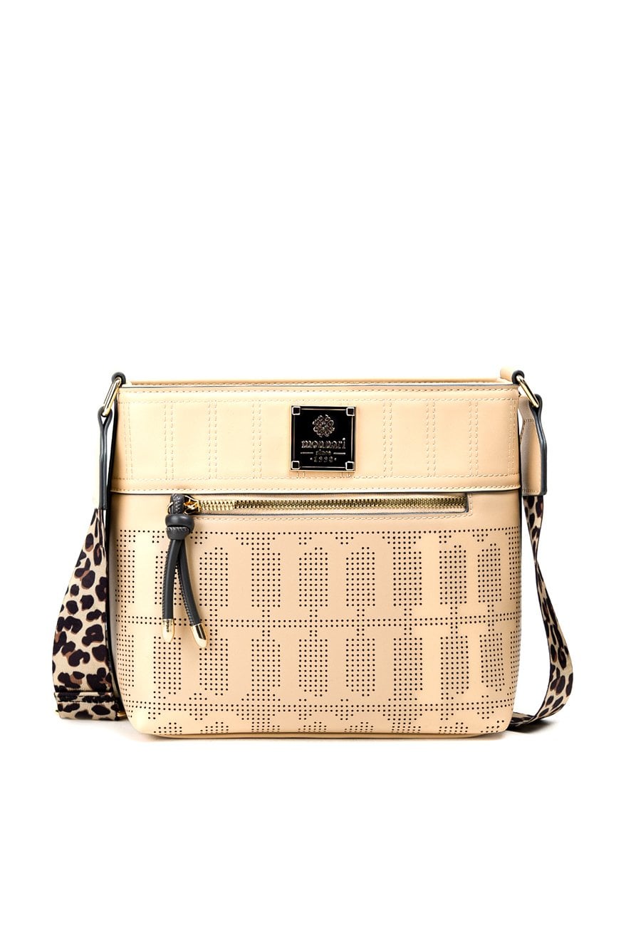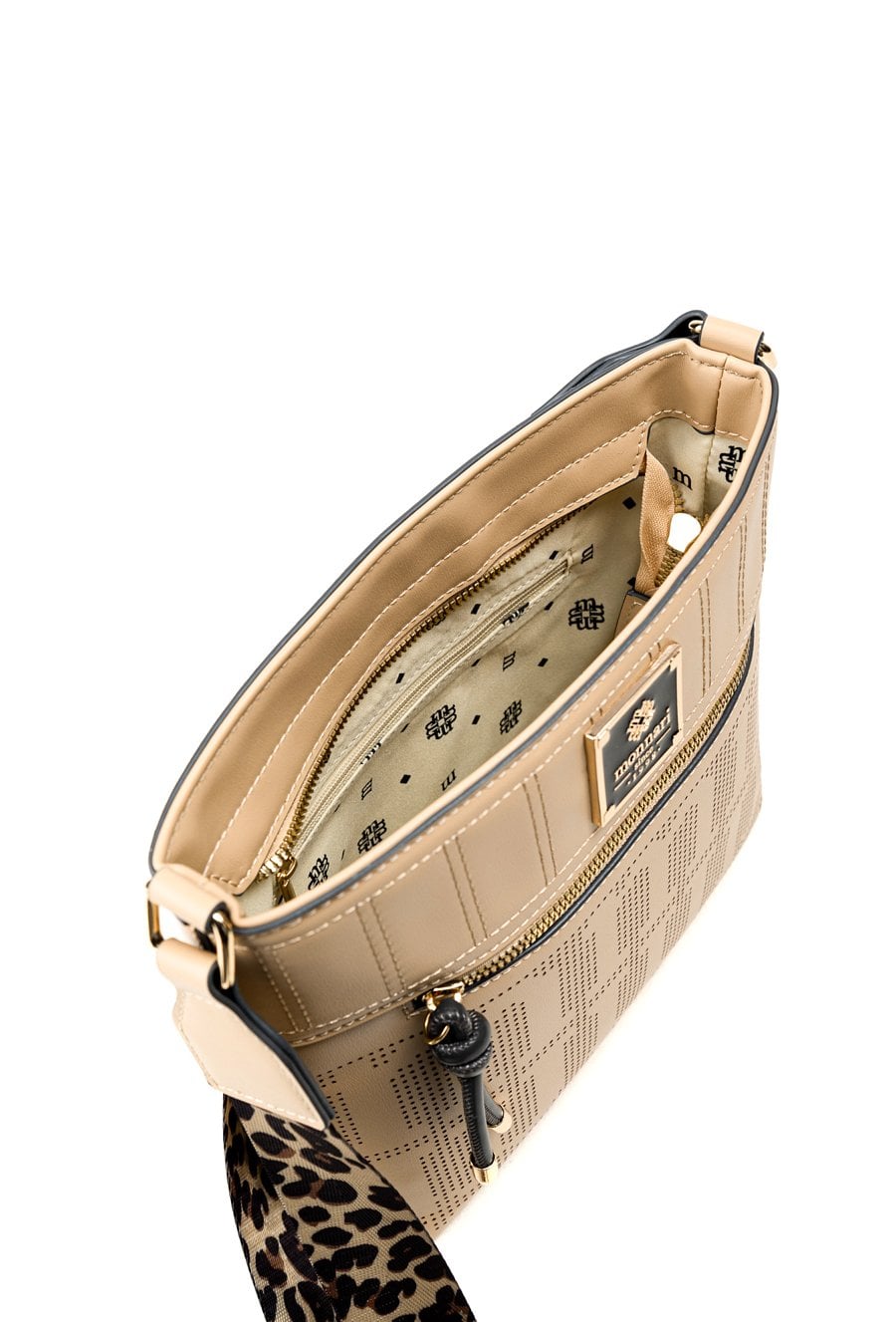 Torba damska o wymiarach 27 cm x 22 cm x 9 cm. Torba jednokomorowa, z jasną, logowaną podszewką oraz dodatkowymi kieszonkami na drobiazgi, które ułatwiają organizację. Torba zawieszona na wzorzystym, regulowanym pasku, który nadaje jej oryginalnego charakteru i zapewnia wygodę noszenia. Torbę należy przechowywać w załączonym woreczku.
