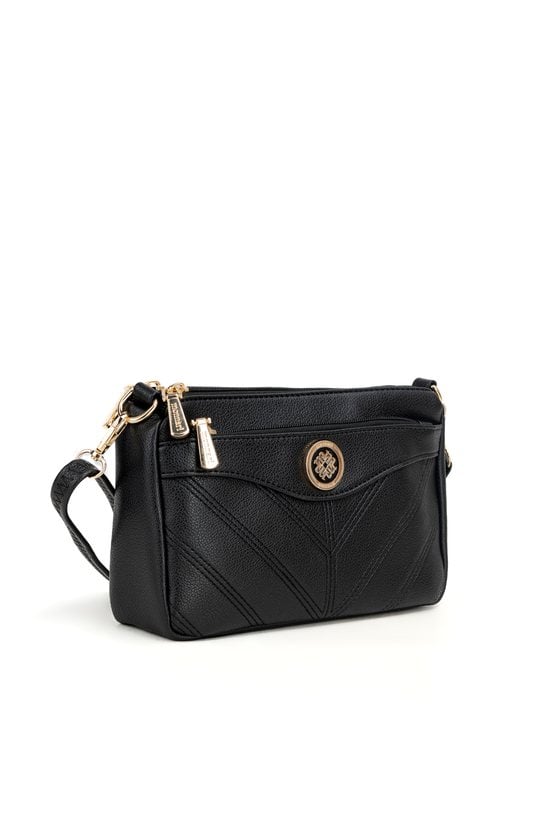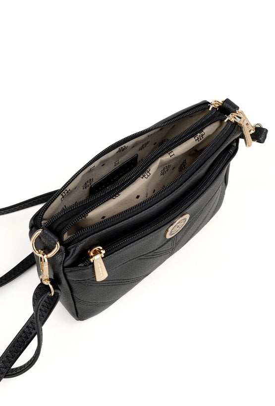 Elegancka torba damska z subtelnym akcentem w postaci logowanego detalu. Zawieszona na regulowanym pasku. Dwukomorowy model o wymiarach 24 × 14 × 6 cm wyposażono w dodatkową, kompaktową kieszonkę zapinaną na suwak, idealną na drobiazgi. Torbę należy przechowywać w załączonym woreczku.