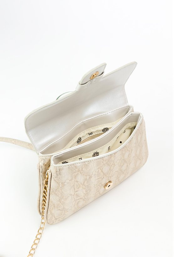 Elegancka torebka damska z delikatnym zwierzęcym wzorem z połyskiem. Dwukomorowy model z jasną, logowaną podszewką posiada dodatkowe kieszonki na drobiazgi. Torebka zapinana jest na klapę i zawieszona na regulowanym pasku z elementem łańcuszka. Torbę należy przechowywać w załączonym woreczku. Wymiary torby: 26 cm x 17 cm x 2 cm.