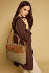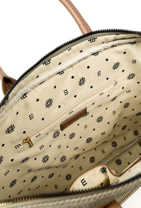 Aktówka damska o wymiarach 39 cm x 31 cm x 6 cm. Torba jednokomorowa, z jasną, logowaną podszewką oraz dodatkowymi kieszonkami na drobiazgi, które ułatwiają organizację. Torba zawieszona na rączkach, a w zestawie znajduje się regulowany pasek, umożliwiający noszenie jej na ramieniu. Praktyczna, pojemna i stylowa – doskonale sprawdzi się zarówno w pracy, jak i na co dzień. Torbę należy przechowywać w dołączonym woreczku.