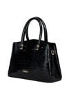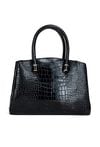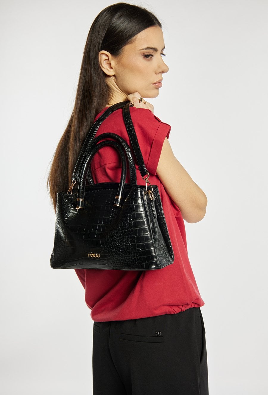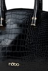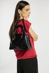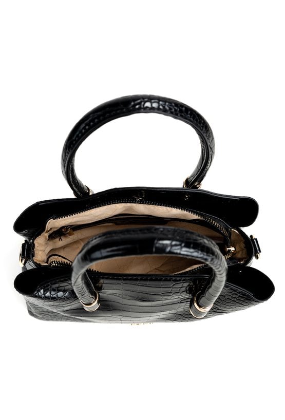 Damska torba o wymiarach 26 × 20 × 10 cm. Model trzykomorowy — jedna komora zapinana na suwak oraz dwie na napy. Torba zawieszona na rączkach, a w zestawie znajduje się regulowany pasek do noszenia na ramieniu. Torbę należy przechowywać w dołączonym woreczku.