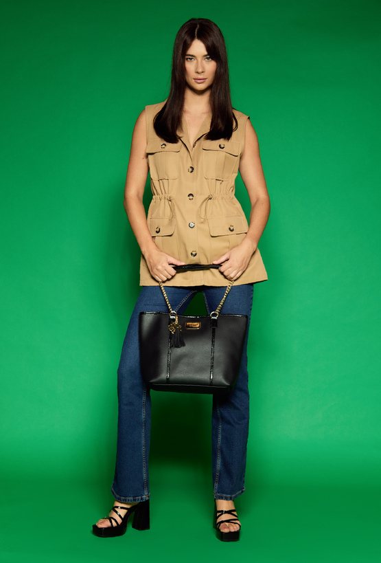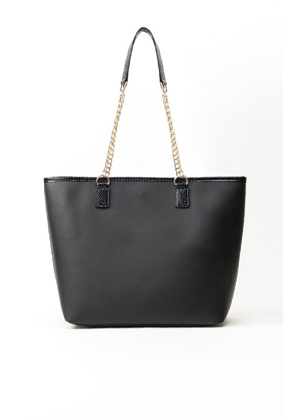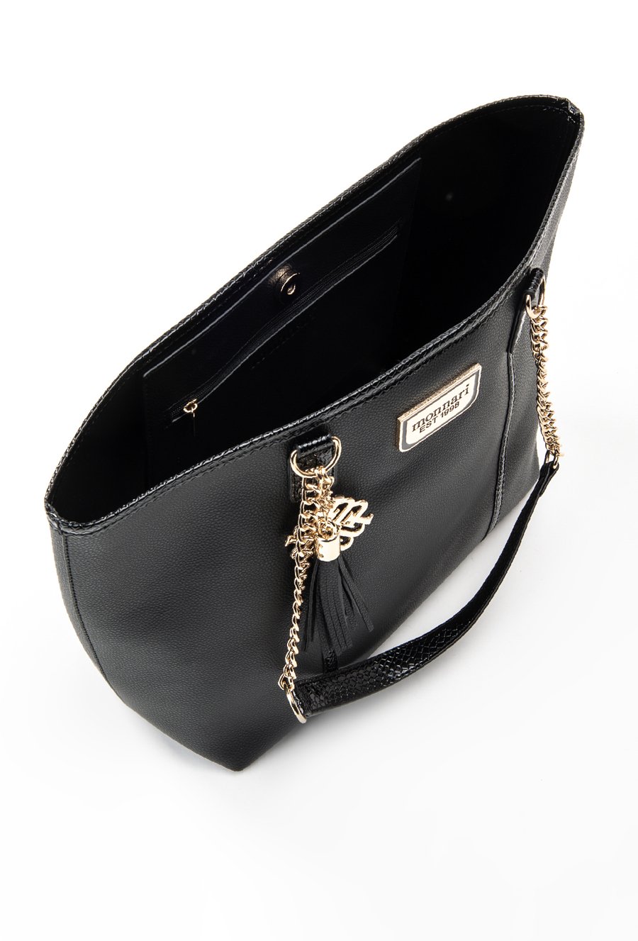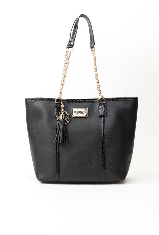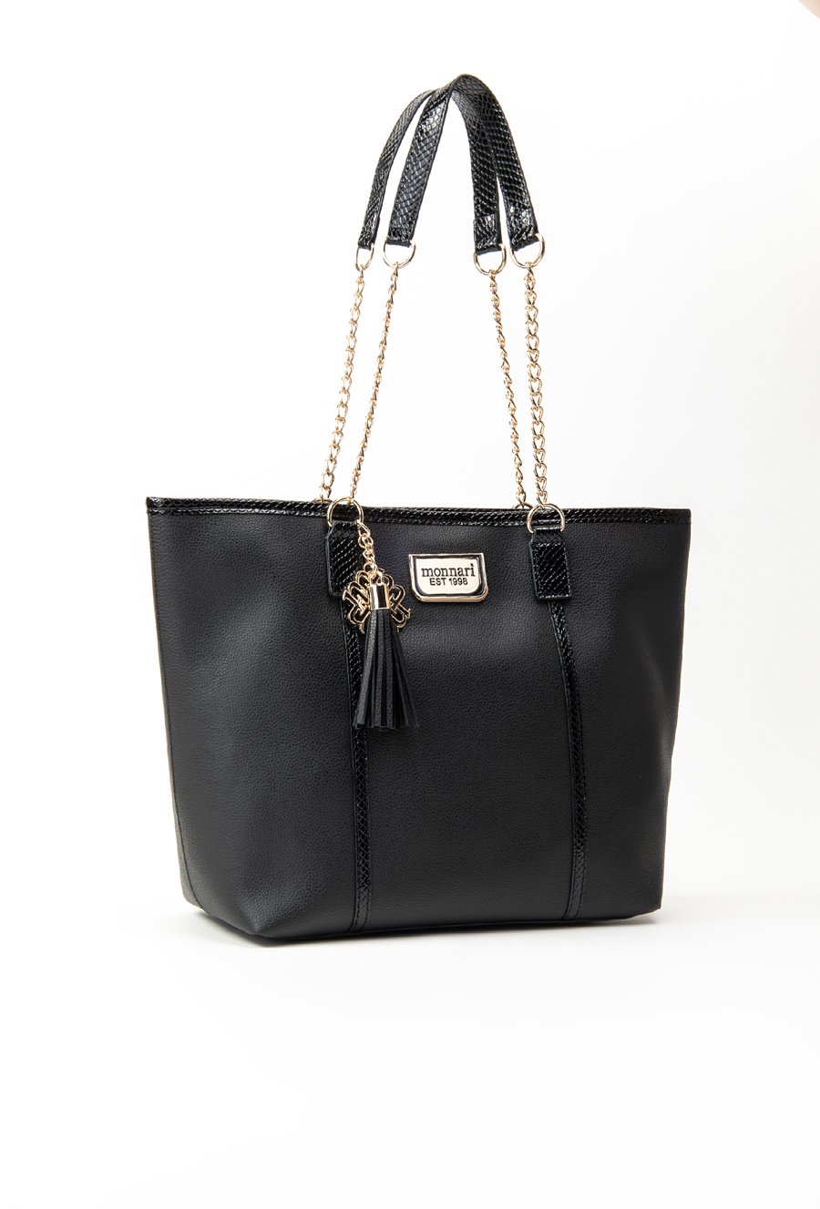 Shopper z ozdobną przywieszką z logo marki Monnari oraz wężowymi wstawkami. Torba jednokomorowa o ciemnym wnętrzu z dodatkową zasuwaną kieszonką w środku. Torba zapinana na napę. Torba zawieszona na rączkach z łańcuszkiem. Torbę należy przechowywać w dołączonym woreczku. Wymiary Torby: 40,5 cm x 29 cm x 13,5 cm