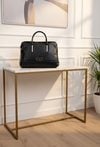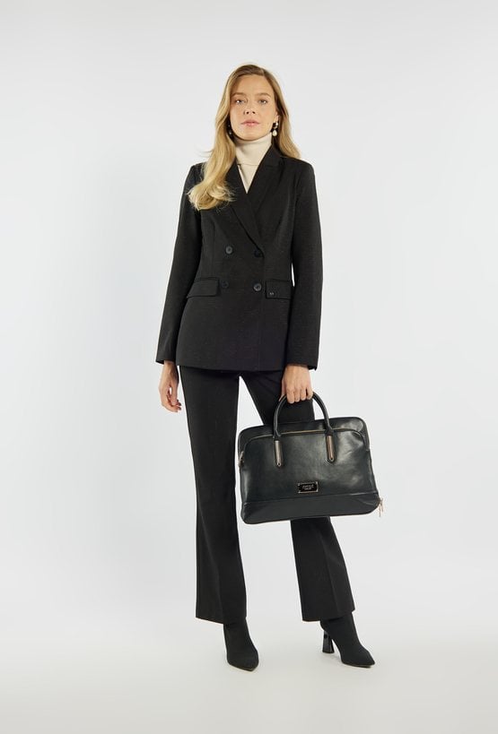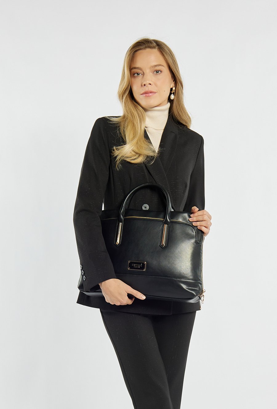 Torba damska na laptopa, zawieszona na wygodnych rączkach. Jednokomorowy model z jasną, logowaną podszewką został wyposażony w dodatkowe kieszonki na drobiazgi oraz wydzielone miejsce na laptopa. W zestawie znajduje się również regulowany pasek, który umożliwia noszenie torby na ramieniu. Wymiary: 41 cm x 30 cm 10 cm.