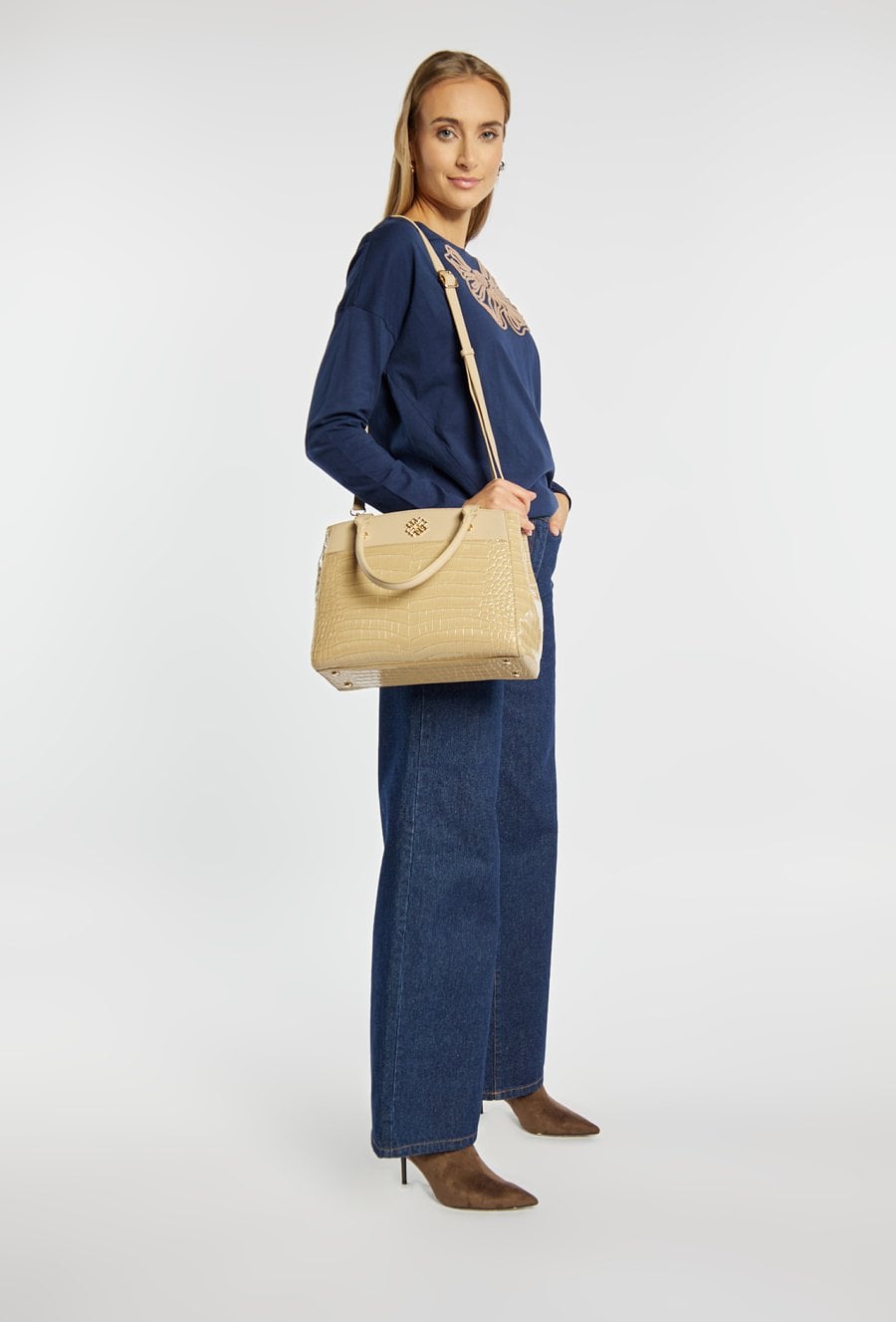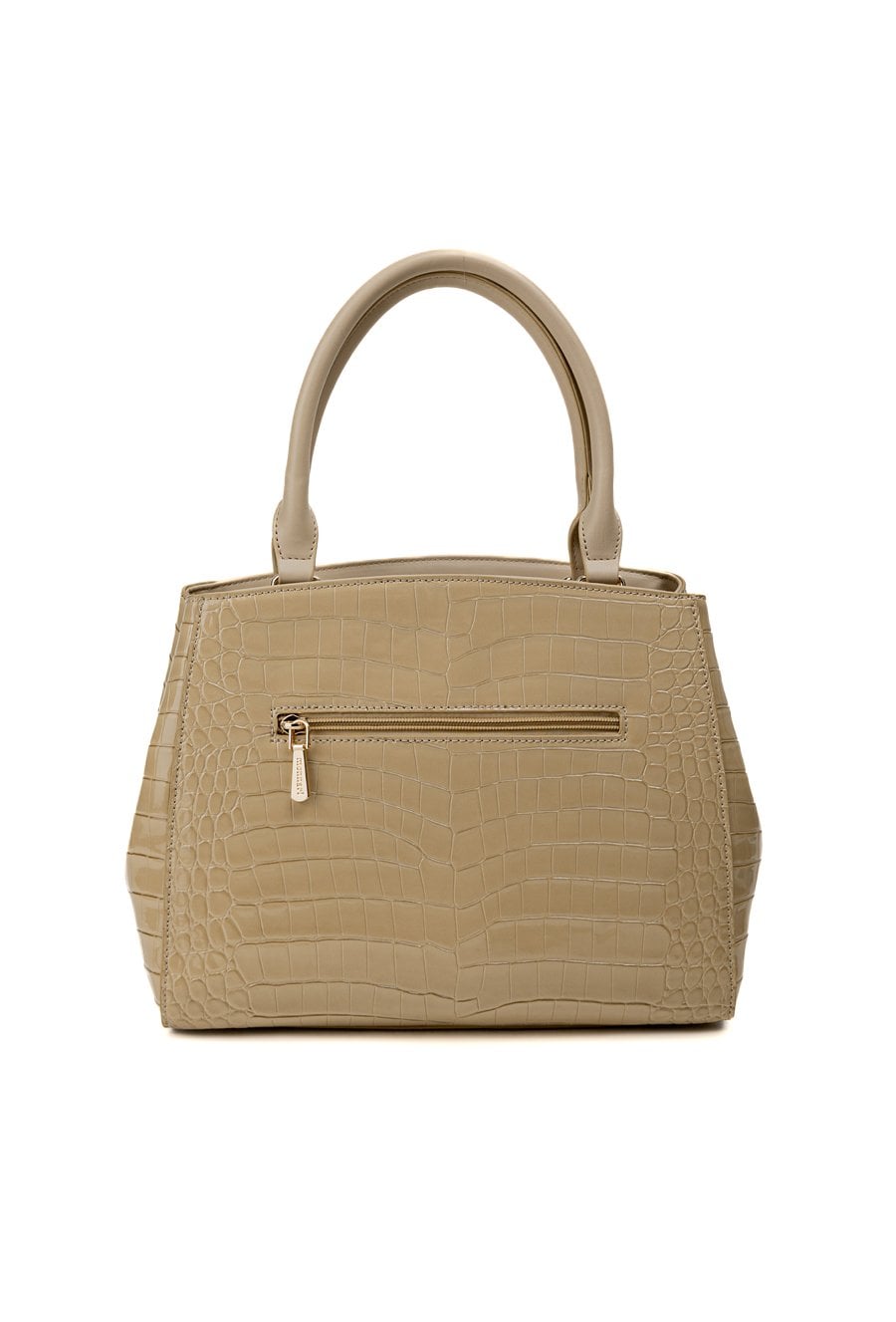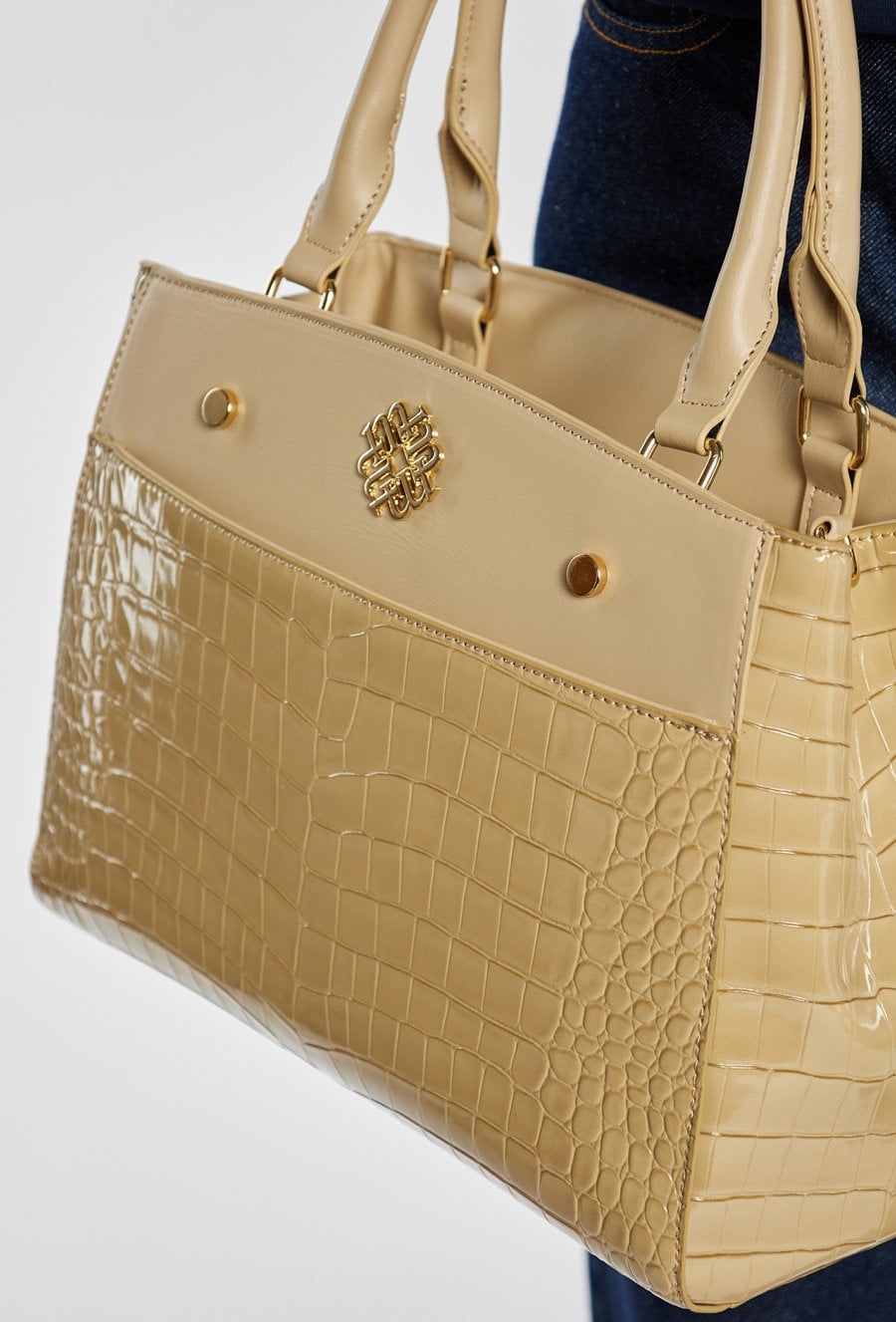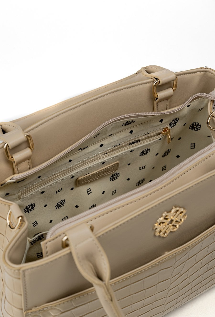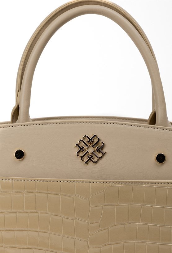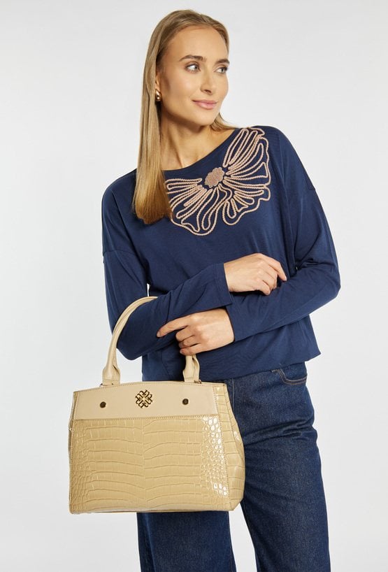 Torba damska z kolekcji biurowej o wymiarach 30 cm x 24 cm x 14 cm. Model jednokomorowy z przegrodą wewnętrzną oraz jasną, logowaną podszewką, która dodaje elegancji i ułatwia organizację. Zawieszona na rączkach, a w zestawie znajduje się regulowany pasek, umożliwiający wygodne noszenie torby na ramieniu. Torbę należy przechowywać w załączonym woreczku.