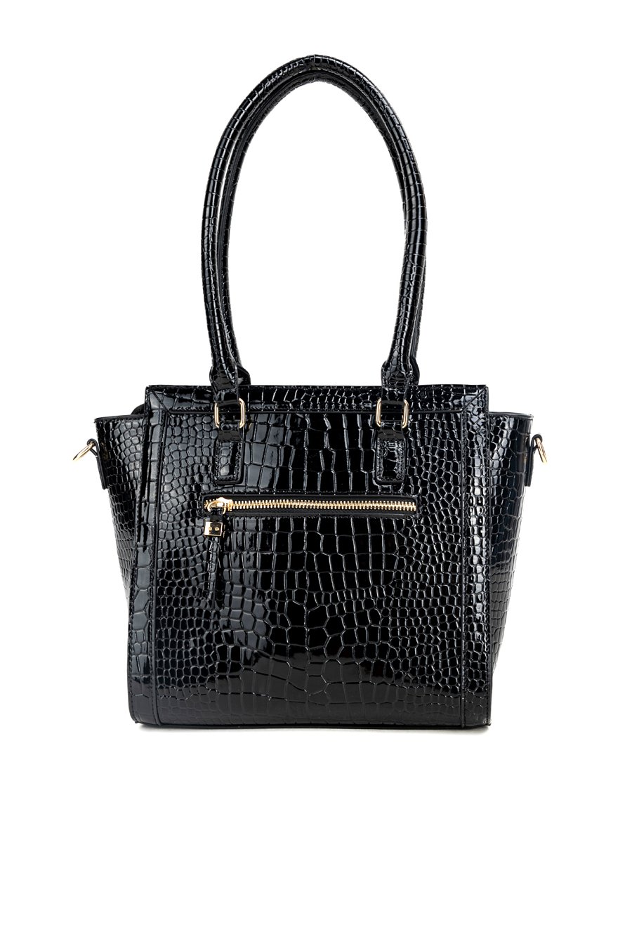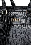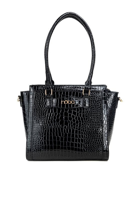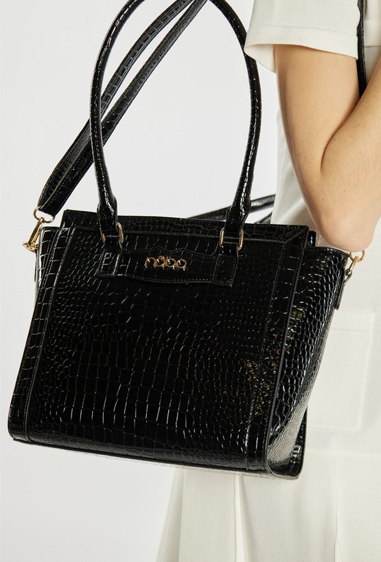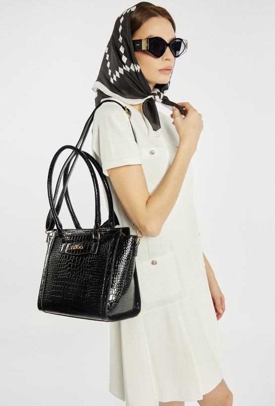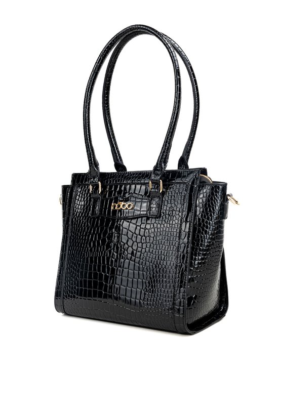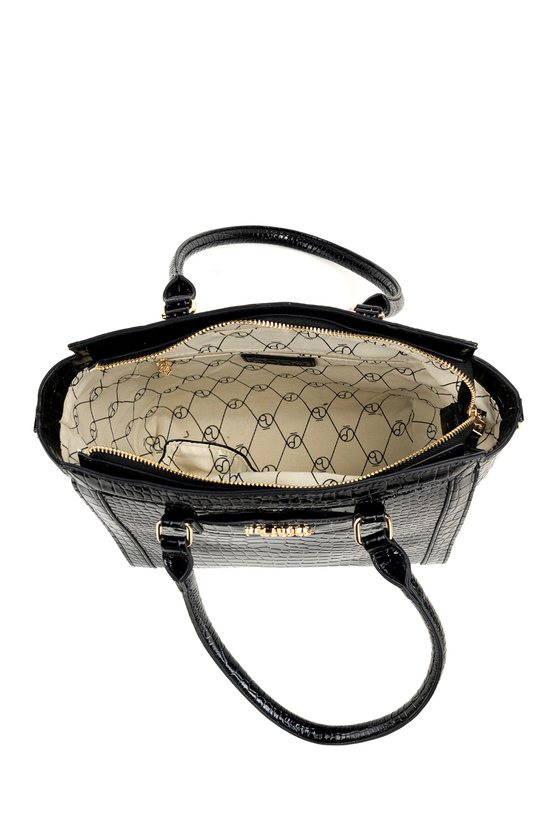 Damska torba o wymiarach 31 × 25,5 × 14,5 cm. Jednokomorowe wnętrze z jasną, logowaną podszewką wyposażono w dodatkowe kieszonki na drobiazgi. Torba zawieszona na rączkach, a w zestawie znajduje się regulowany, odpinany pasek, który umożliwia noszenie jej również na ramieniu. Torbę należy przechowywać w dołączonym woreczku.