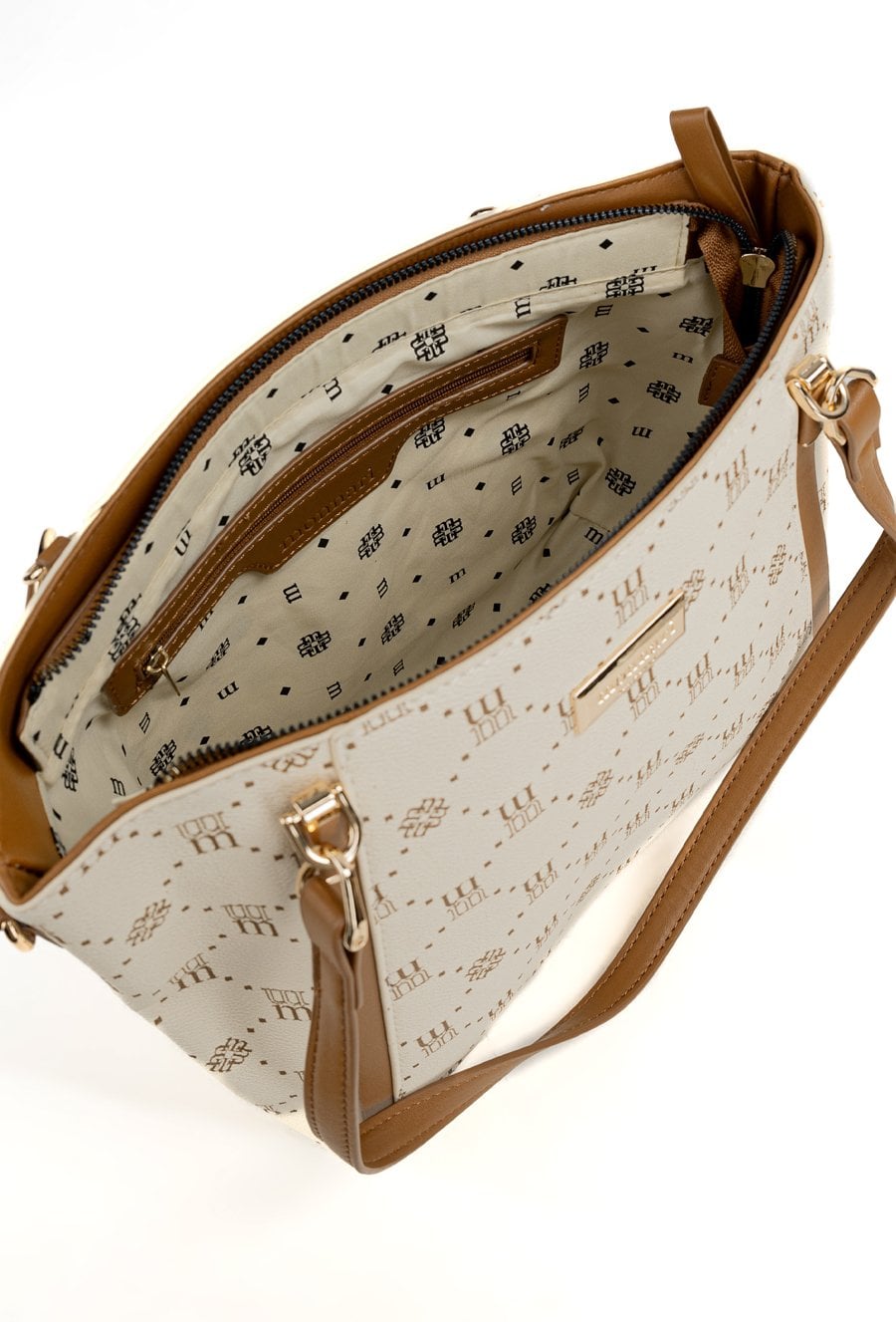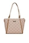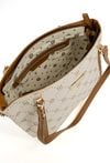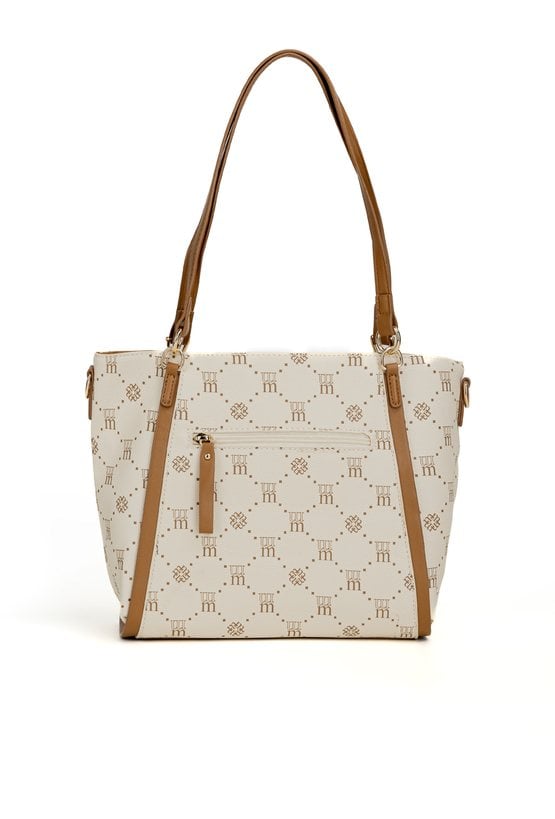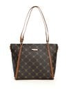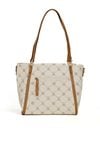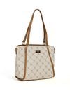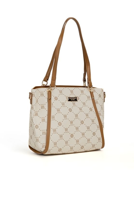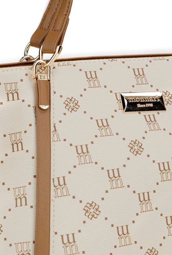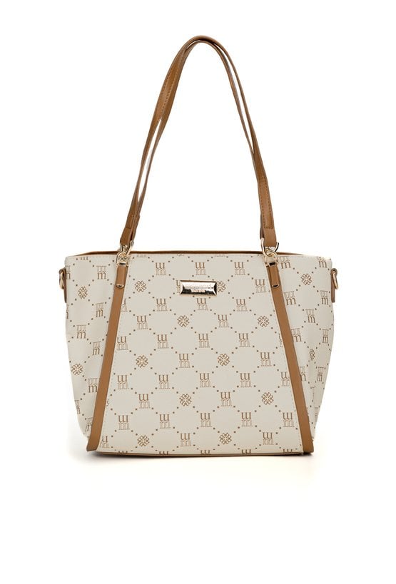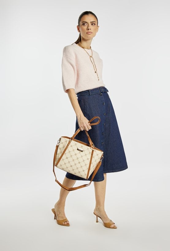 Torba damska z logowanym wzorem z kolekcji Premium to elegancki i praktyczny wybór na co dzień. Torba jest jednokomorowa, ma jasną, logowaną podszewkę oraz dodatkowe kieszonki na drobiazgi, które ułatwiają organizację. Torba zawieszona na rączkach, w zestawie ma odpinany, regulowany pasek. Torbę należy przechowywać w dołączonym woreczku. Wymiary: 36 cm x 24 cm x 13 cm.