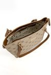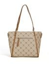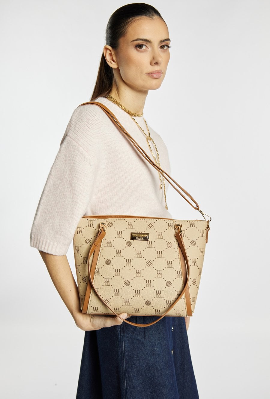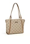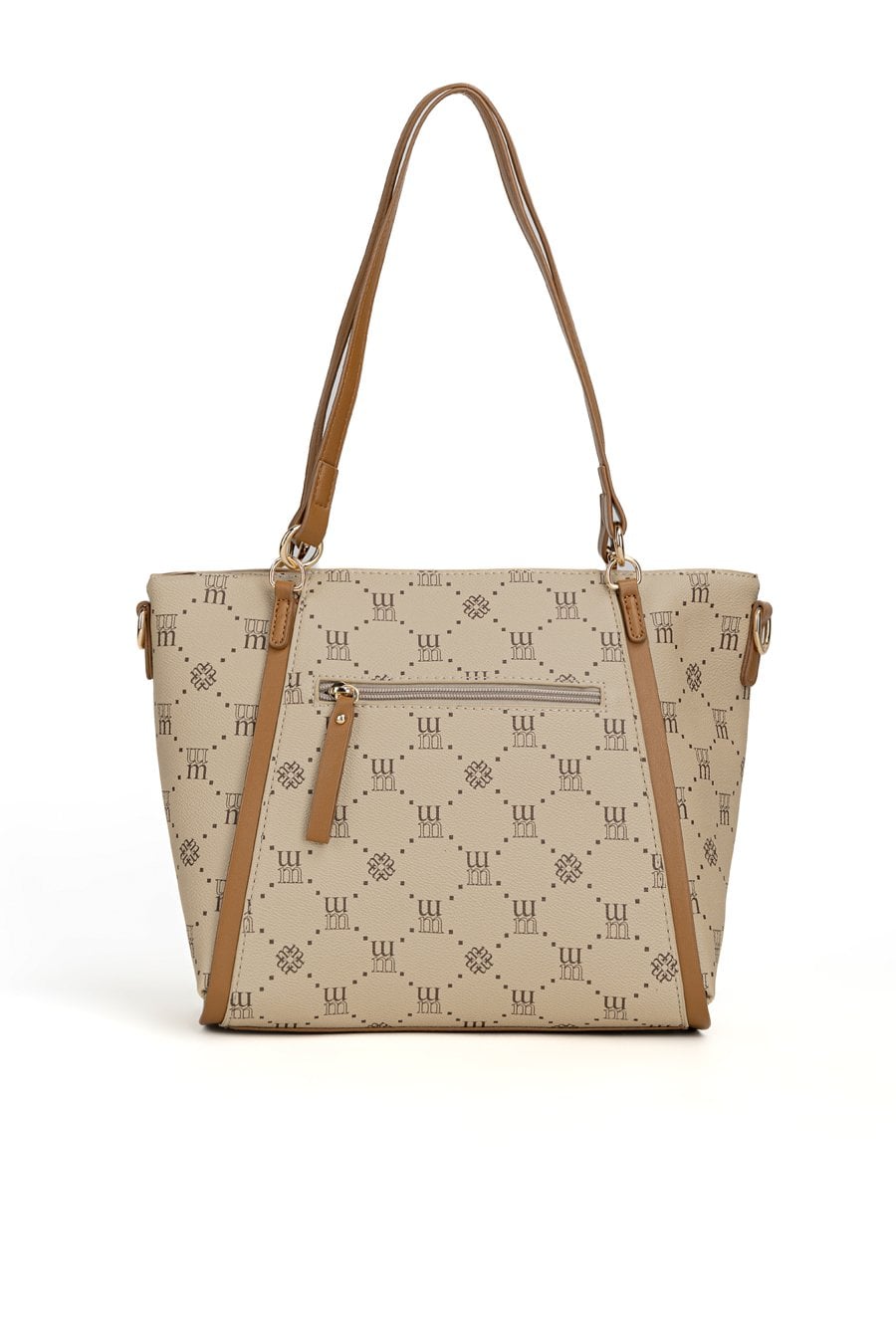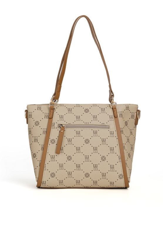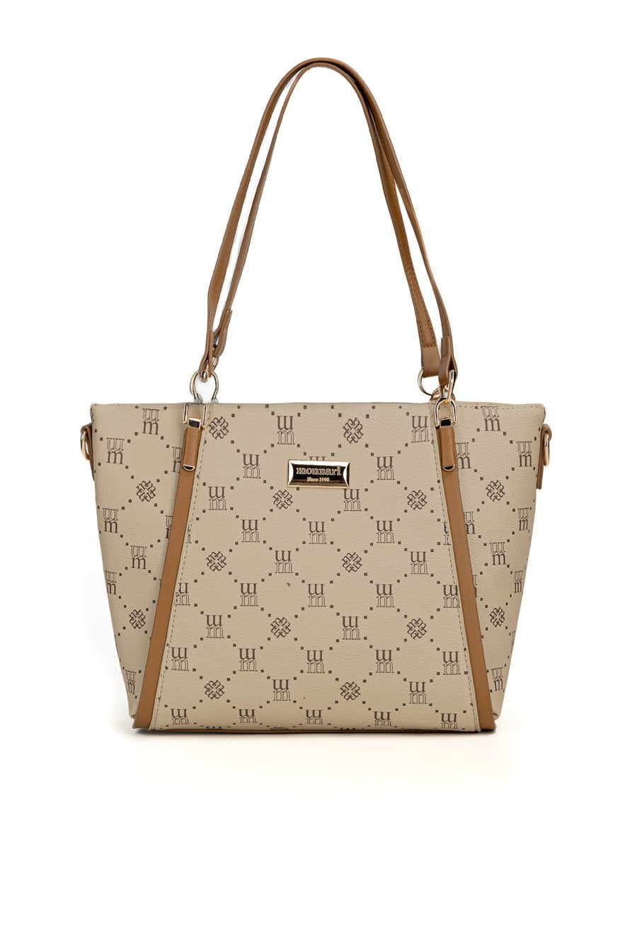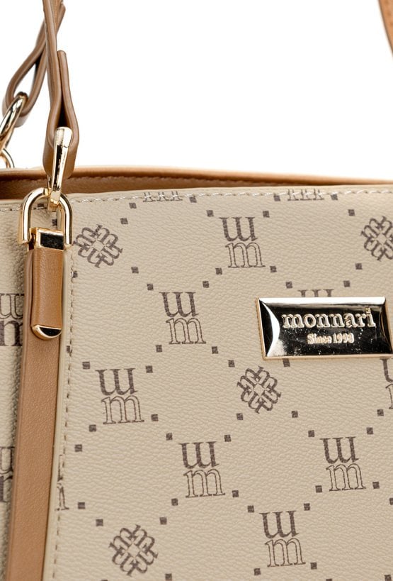 Torba damska z logowanym wzorem z kolekcji Premium to elegancki i praktyczny wybór na co dzień. Torba jest jednokomorowa, ma jasną, logowaną podszewkę oraz dodatkowe kieszonki na drobiazgi, które ułatwiają organizację. Torba zawieszona na rączkach, w zestawie ma odpinany, regulowany pasek. Torbę należy przechowywać w dołączonym woreczku. Wymiary: 36 cm x 24 cm x 13 cm.