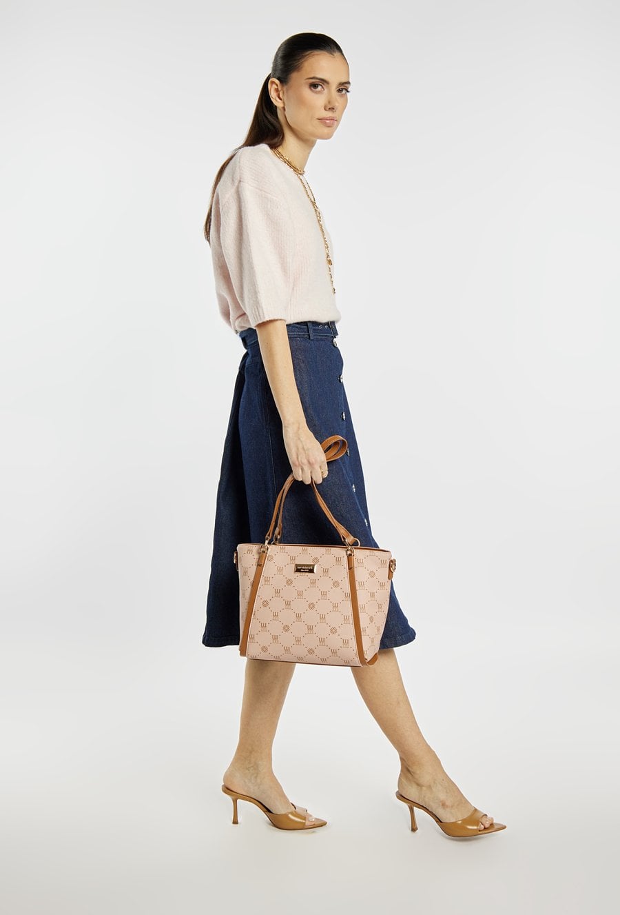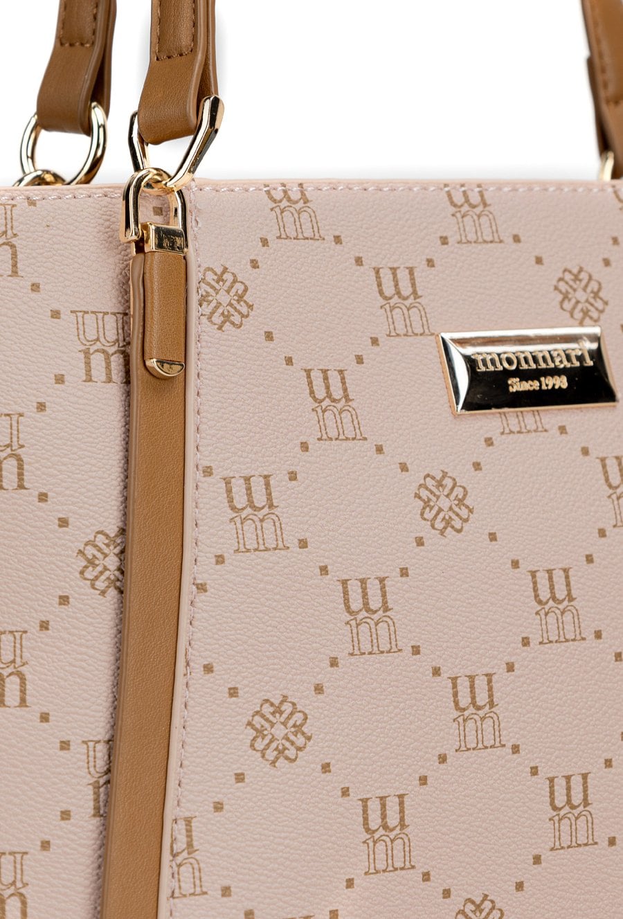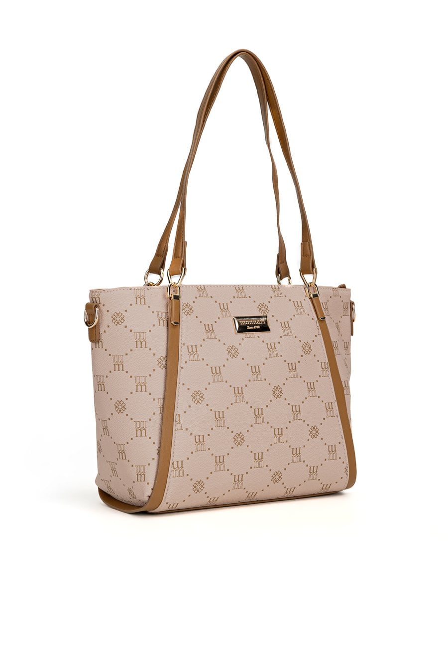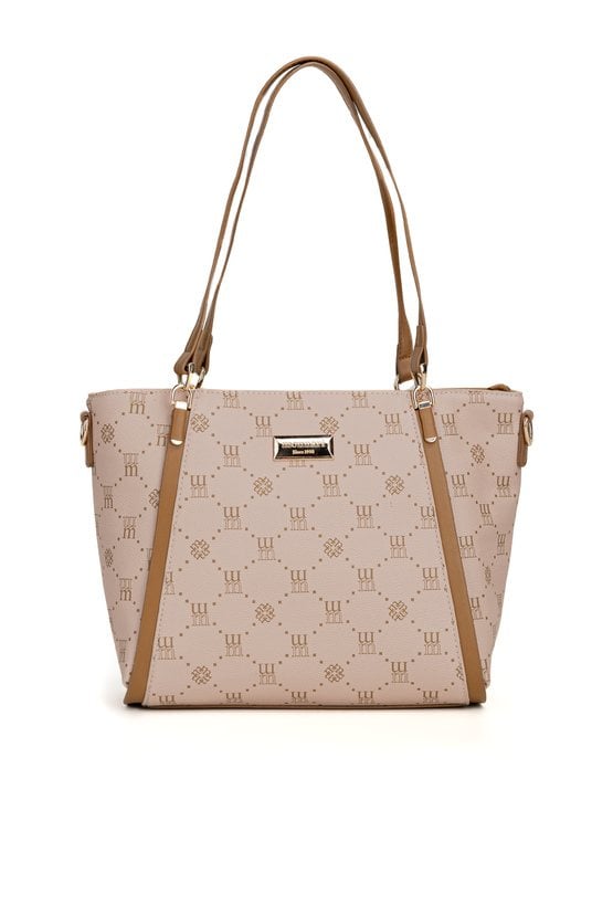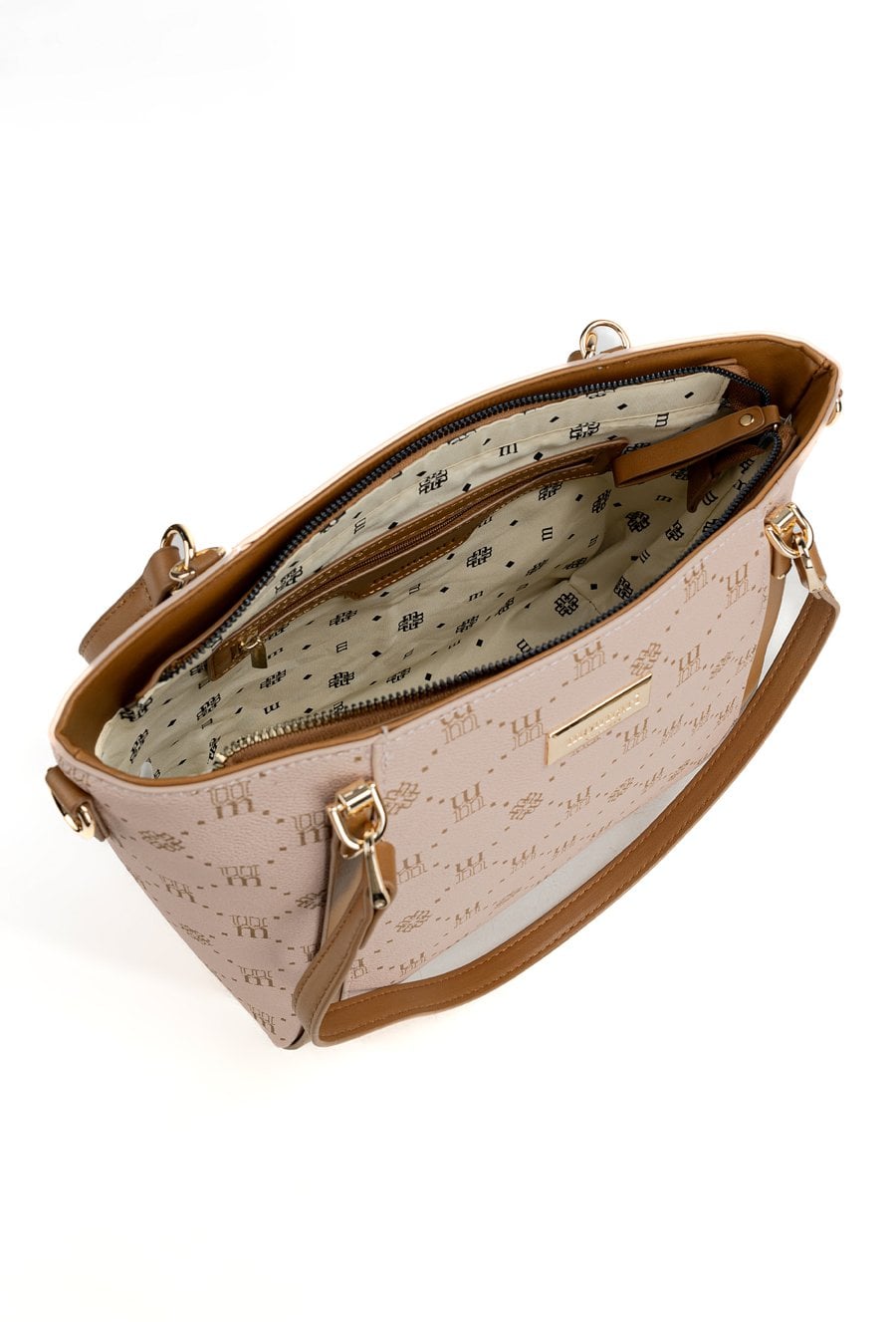 Torba damska z logowanym wzorem z kolekcji Premium to elegancki i praktyczny wybór na co dzień. Torba jest jednokomorowa, ma jasną, logowaną podszewkę oraz dodatkowe kieszonki na drobiazgi, które ułatwiają organizację. Torba zawieszona na rączkach, w zestawie ma odpinany, regulowany pasek. Torbę należy przechowywać w dołączonym woreczku. Wymiary: 36 cm x 24 cm x 13 cm.