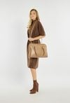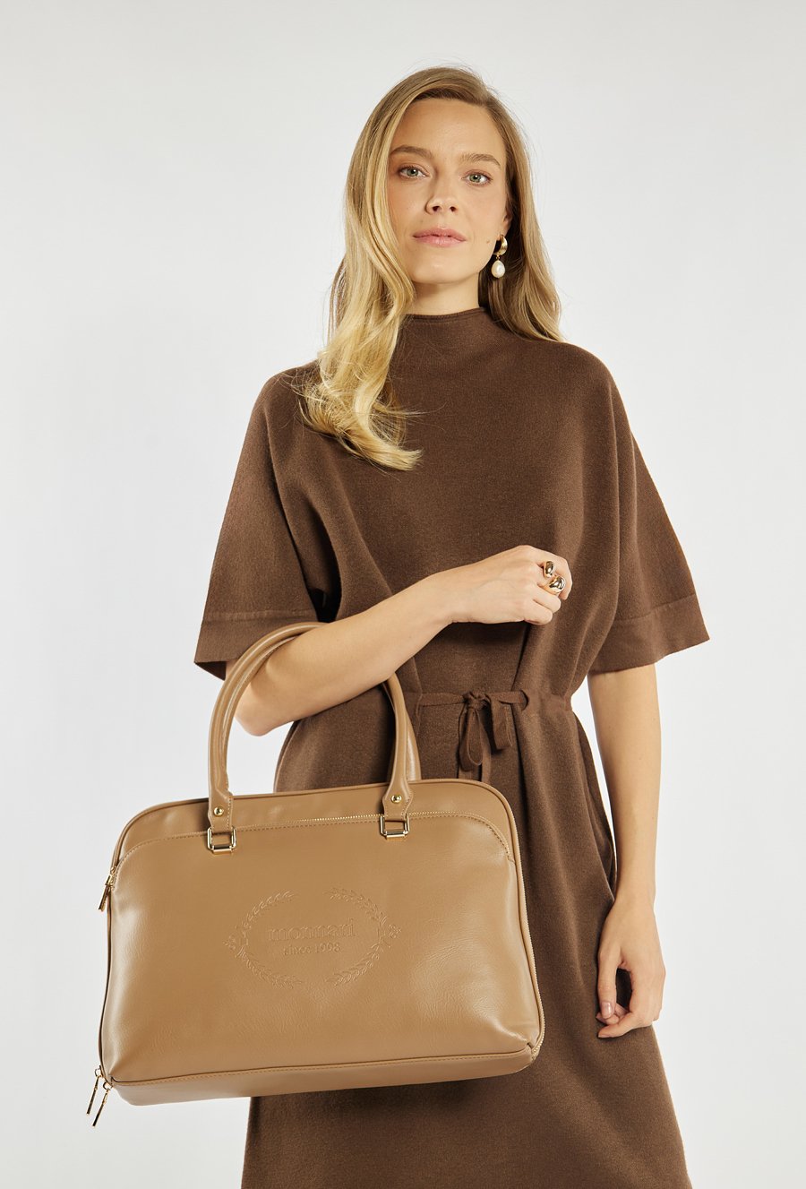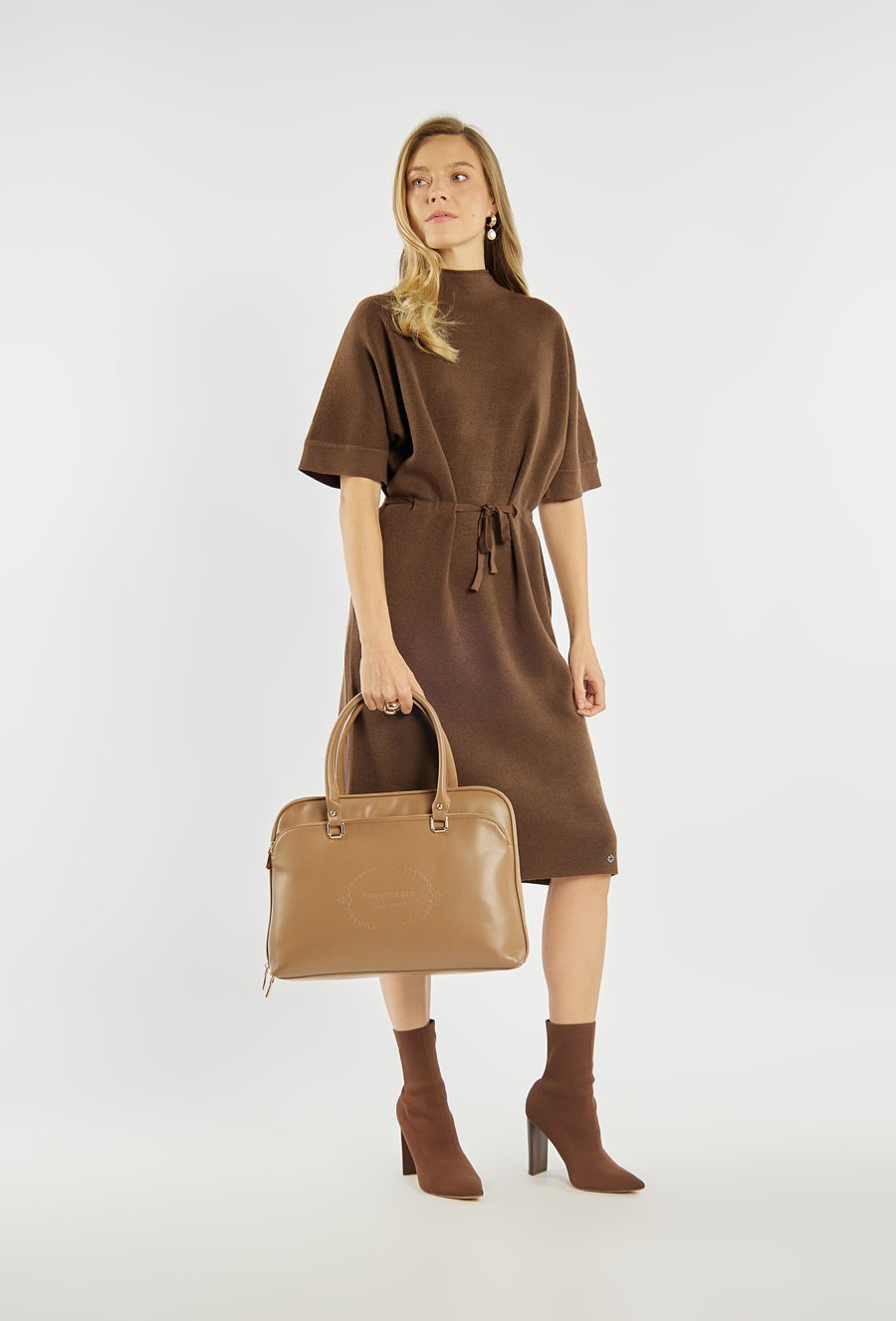 Pojemna torba damska o wymiarach 42 × 32 × 10 cm, idealna do pracy i na co dzień. Jednokomorowy model z jasną, logowaną podszewką wyposażony jest w środkową kieszonkę na suwak, która dzieli wnętrze na dwie przegródki. W środku znajduje się również specjalne miejsce na laptopa. Torba zawieszona jest na rączkach, a w zestawie znajduje się dodatkowy pasek do noszenia na ramieniu. Torbę należy przechowywać w dołączonym woreczku.