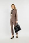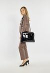 Pojemna torba damska o wymiarach 42 × 32 × 10 cm, idealna do pracy i na co dzień. Jednokomorowy model z jasną, logowaną podszewką wyposażony jest w środkową kieszonkę na suwak, która dzieli wnętrze na dwie przegródki. W środku znajduje się również specjalne miejsce na laptopa. Torba zawieszona jest na rączkach, a w zestawie znajduje się dodatkowy pasek do noszenia na ramieniu. Torbę należy przechowywać w dołączonym woreczku.