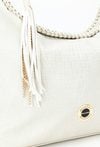 Damska torba typu worek o wymiarach 40 cm x 27,5 cm x 7 cm, idealna na co dzień. Jednokomorowa, z jasną, logowaną podszewką i praktycznymi kieszonkami na drobiazgi, oferuje wygodę i funkcjonalność. Torba jest zawieszona na regulowanej rączce. Całość dopełniają eleganckie detale – ozdobny warkoczykowy splot u góry oraz frędzle na rączce. Torbę należy przechowywać w załączonym woreczku.