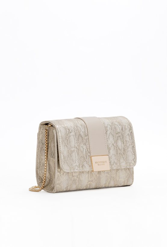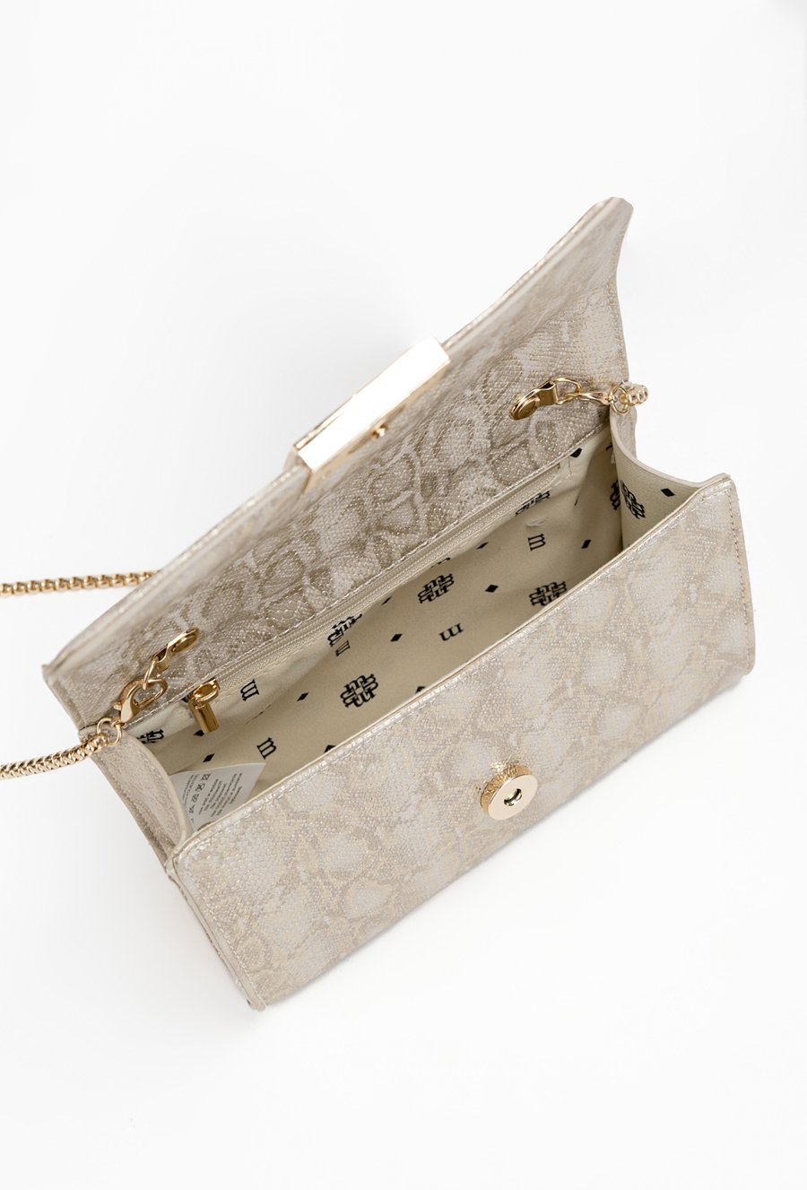 Wizytowa torba damska ze zwierzęcym wzorem. Torba z klapą zawieszona na łańcuszku, jednokomorowa z jasną, logowaną podszewką oraz kieszonką na drobiazgi. Torbę należy przechowywać w załączonym woreczku. Wymiary torby: 20 cm x 14,5 cm x 6 cm.