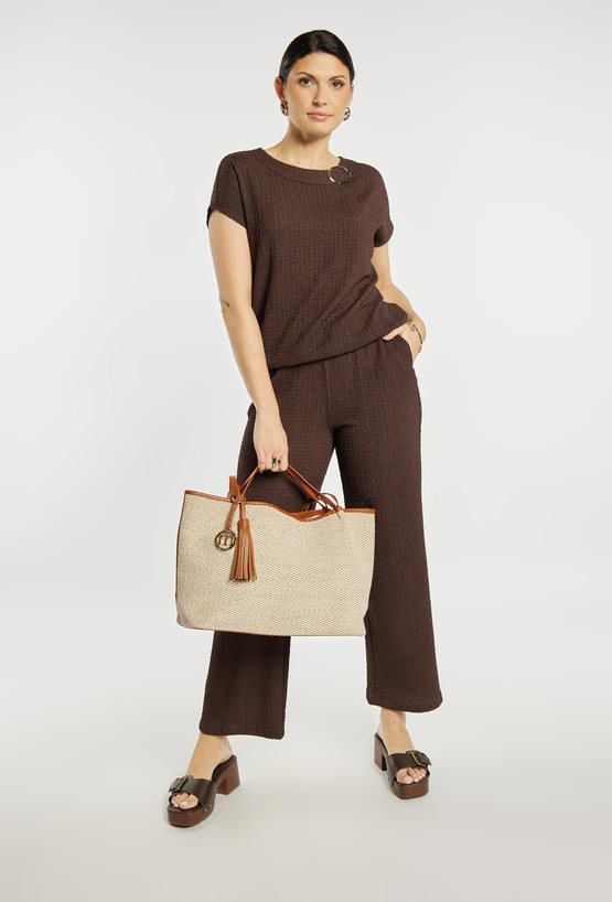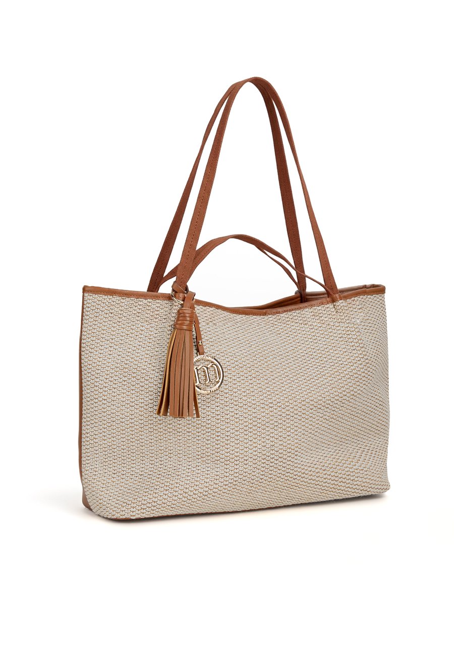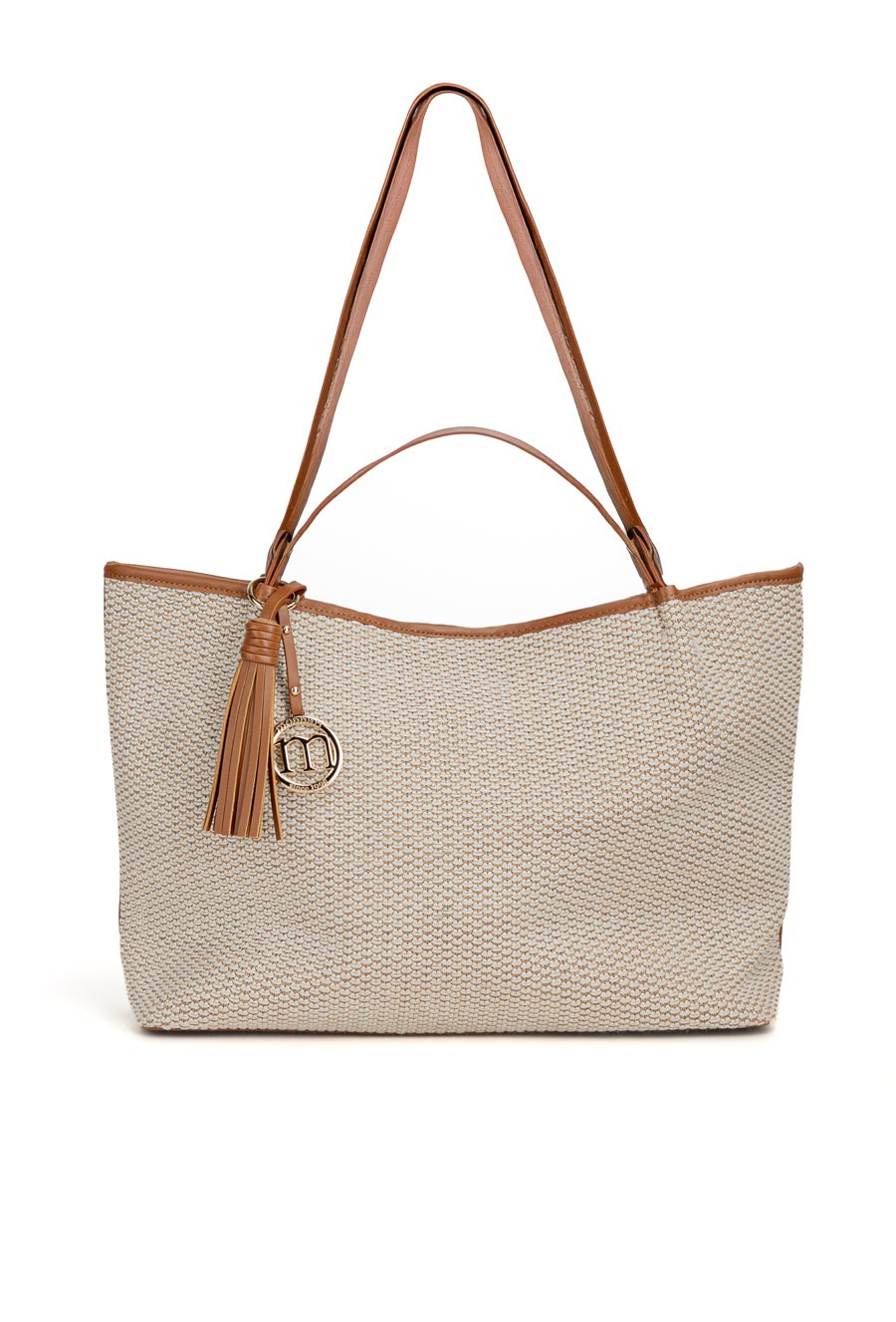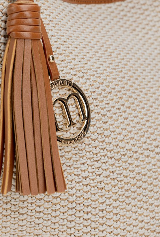 Torba damska typu shopper z plecionki to stylowy wybór na co dzień. Torba jest jednokomorowa, ma jasną, logowaną podszewkę oraz dodatkowe kieszonki na drobiazgi, a także rączki ozdobione frędzlami i logo marki Monnari; model zapinany jest na napę. Torbę należy przechowywać w dołączonym woreczku. Wymiary: 51 cm x 28 cm x 14 cm.