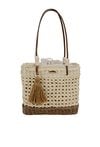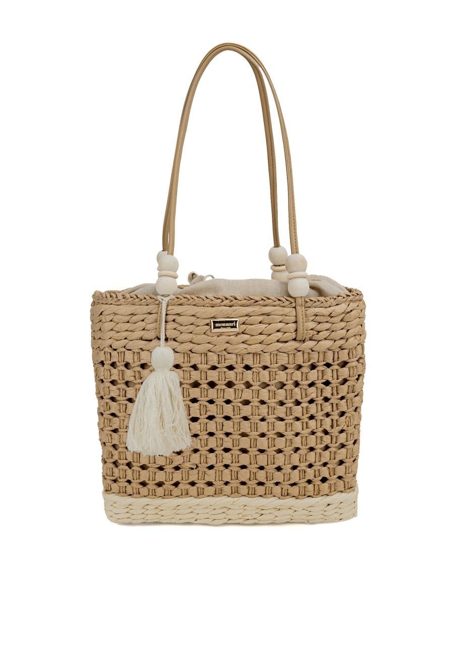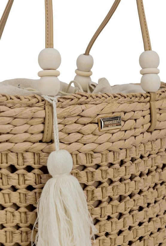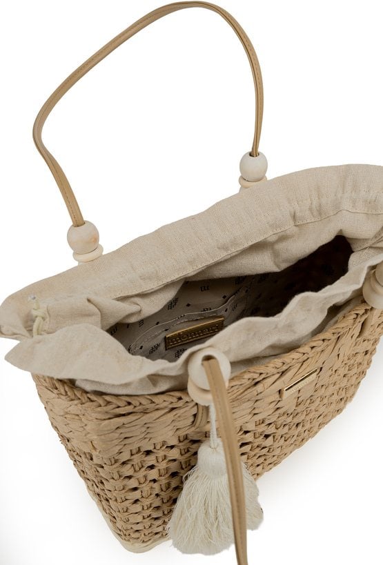 Koszyk damski o wymiarach 31,5 × 27 × 10 cm. Jednokomorowy model z jasną, logowaną podszewką oraz dodatkowymi kieszonkami na drobiazgi. Koszyk ze ściągaczem, zawieszony na rączkach ozdobionych koralikami. Torbę należy przechowywać w dołączonym woreczku.