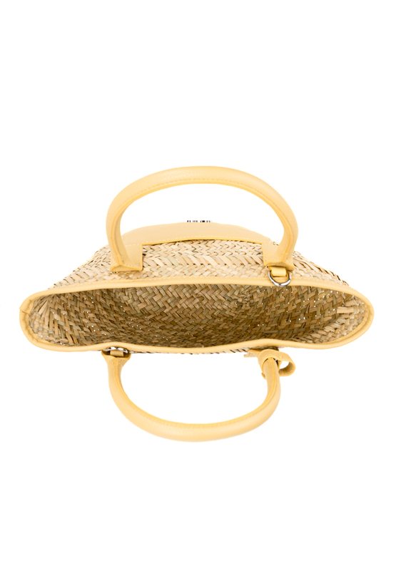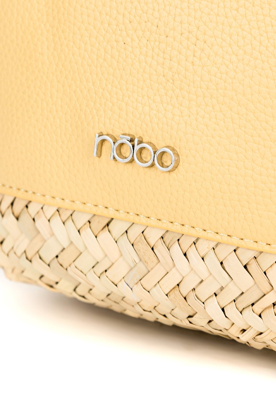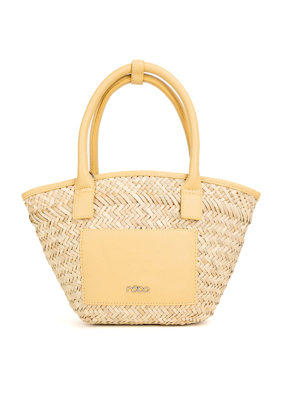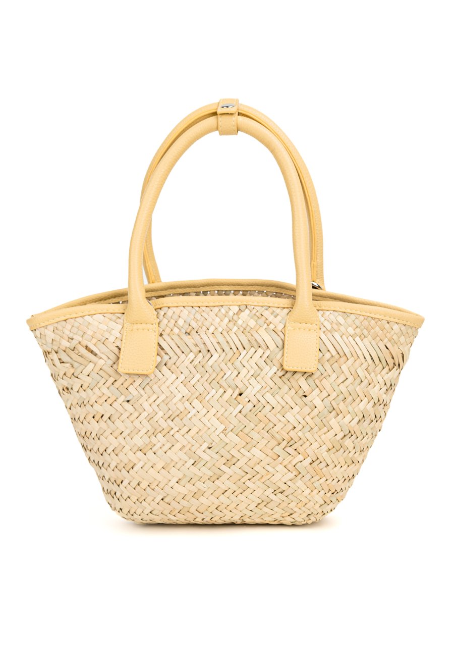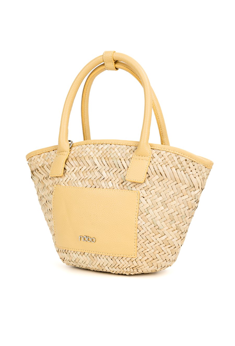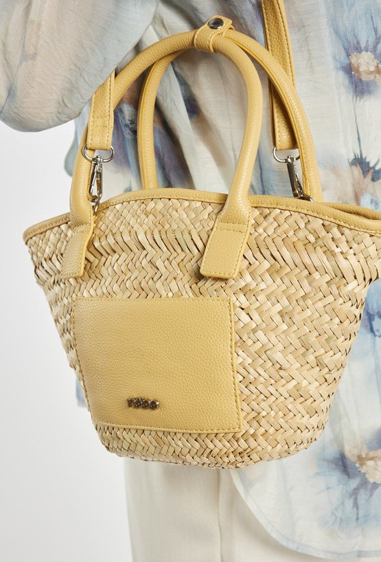 Koszyk damski z plecionką o wymiarach 30 × 21 × 9 cm. Jednokomorowy model bez zapięcia i podszewki. Torba zawieszona na rączkach w kolorze, z małymi kieszonkami z przodu. W zestawie znajduje się regulowany pasek.