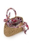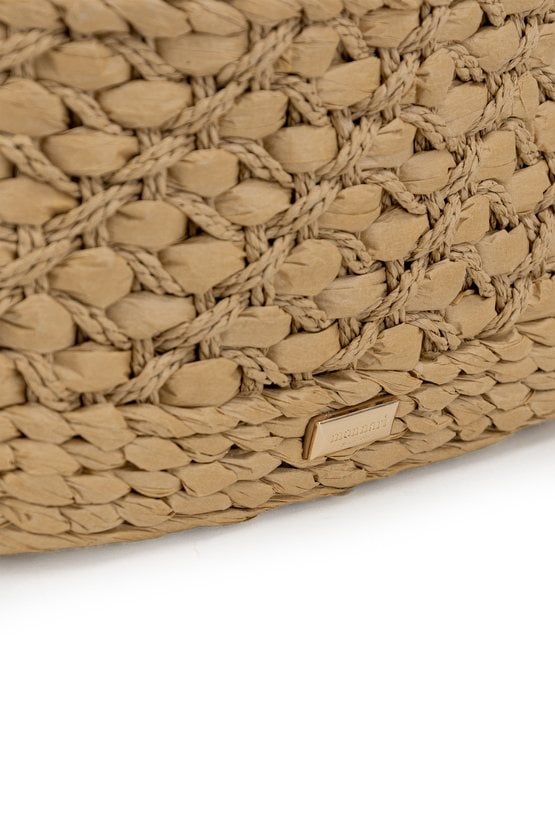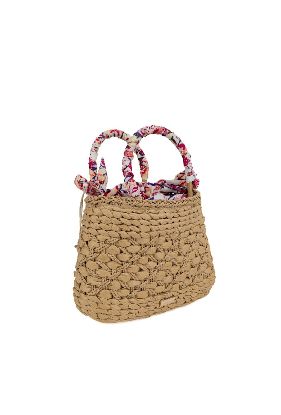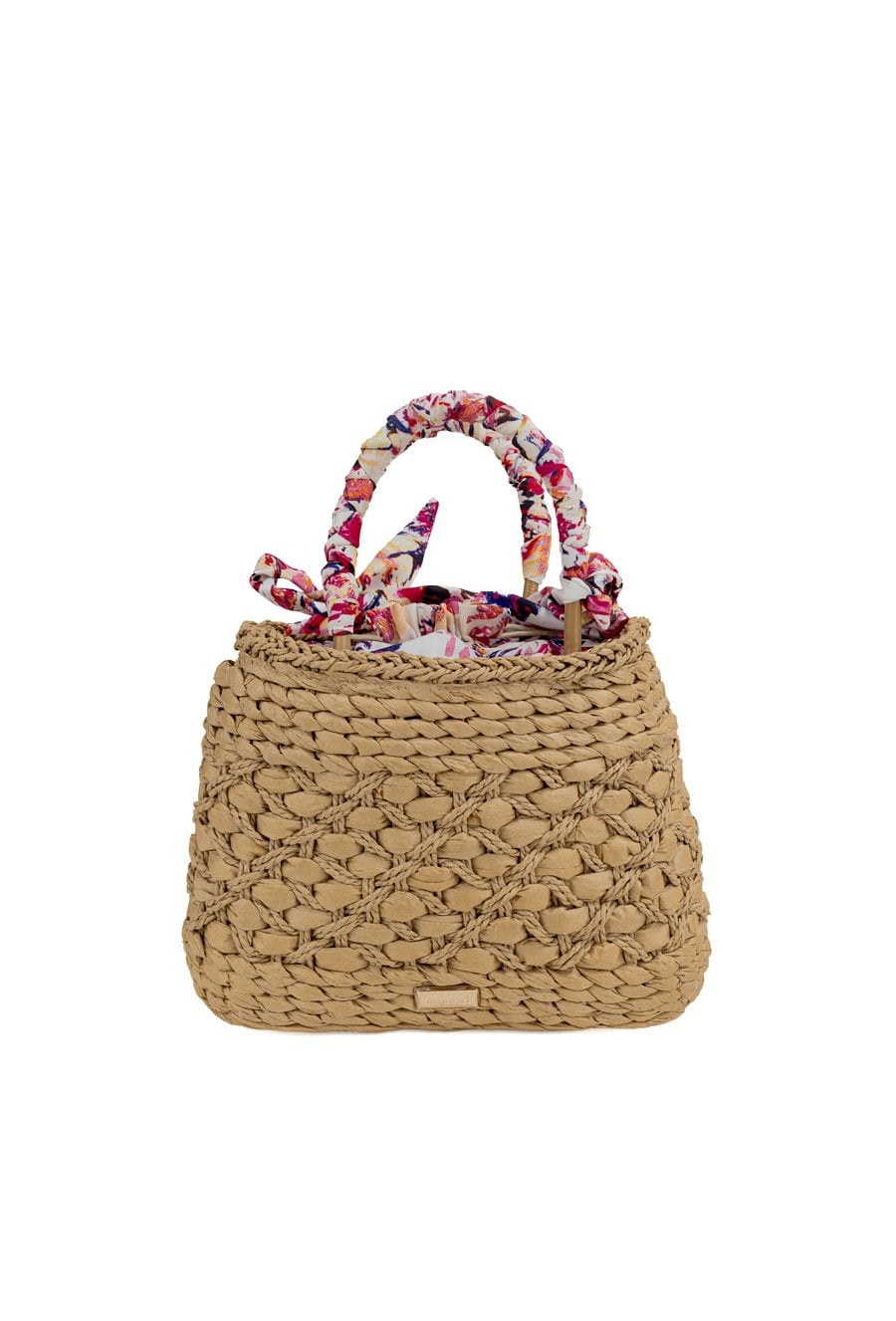 Torba damska z plecionką, idealna na letnie dni. Jednokomorowy model z jasną, logowaną podszewką oraz dodatkowymi kieszonkami na drobiazgi. Torba ze ściągaczem, zawieszona na rączkach ozdobionych kolorową chustą, którą można zawiązać na kokardkę. Torbę należy przechowywać w dołączonym woreczku. Wymiary: 30 cm x 21 cm x 10 cm.