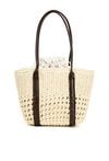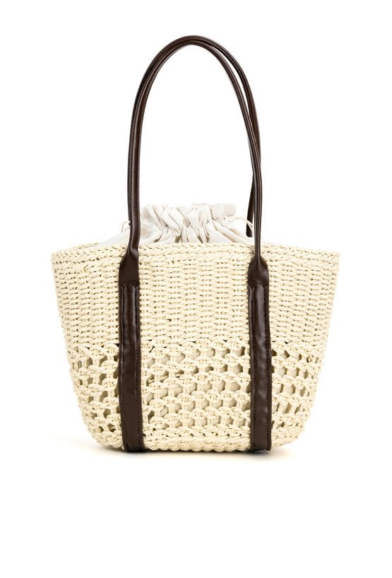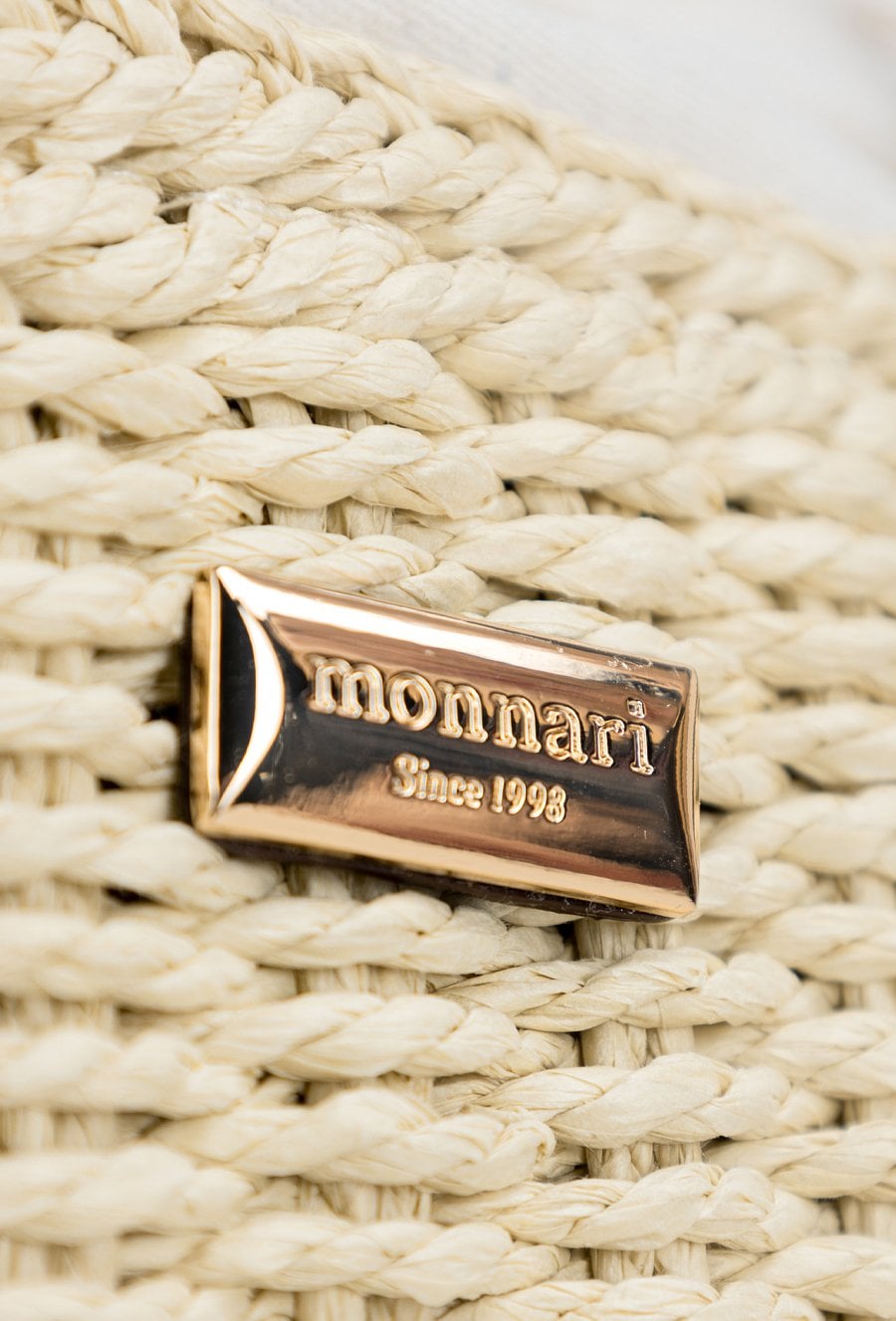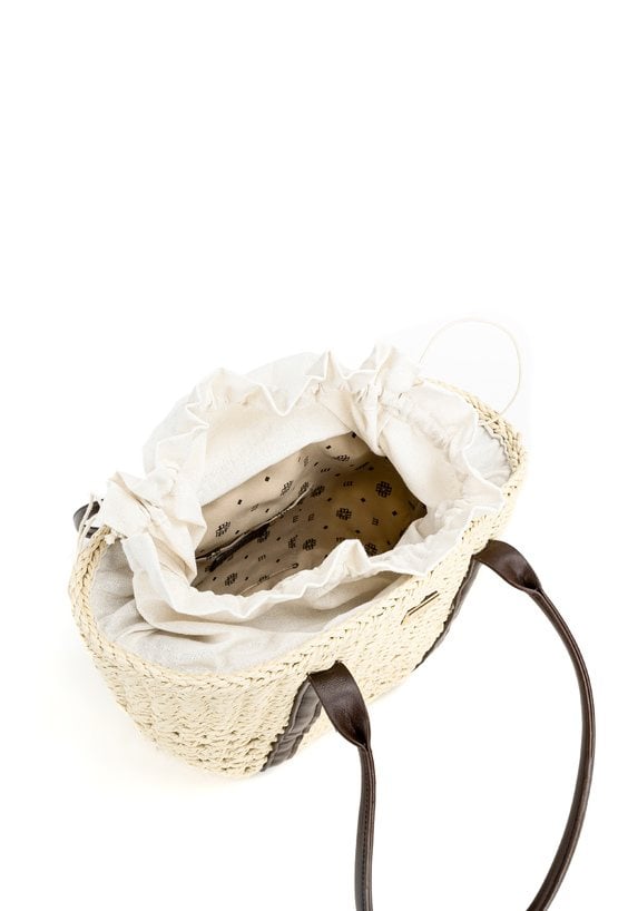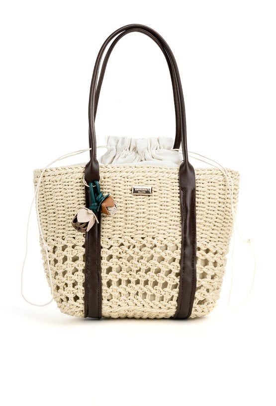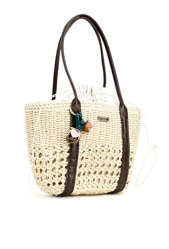 Torebka damska wykonana z plecionki o wymiarach 35 cm x 24,5 cm x 15 cm. Model jednokomorowy z jasną, logowaną podszewką. Zamykana na praktyczny ściągacz, który zapewnia wygodę użytkowania. Całość uzupełniają dekoracyjne zawieszki w formie kwiatków, dodające torebce uroku i letniego charakteru. Idealna do codziennych, letnich stylizacji.