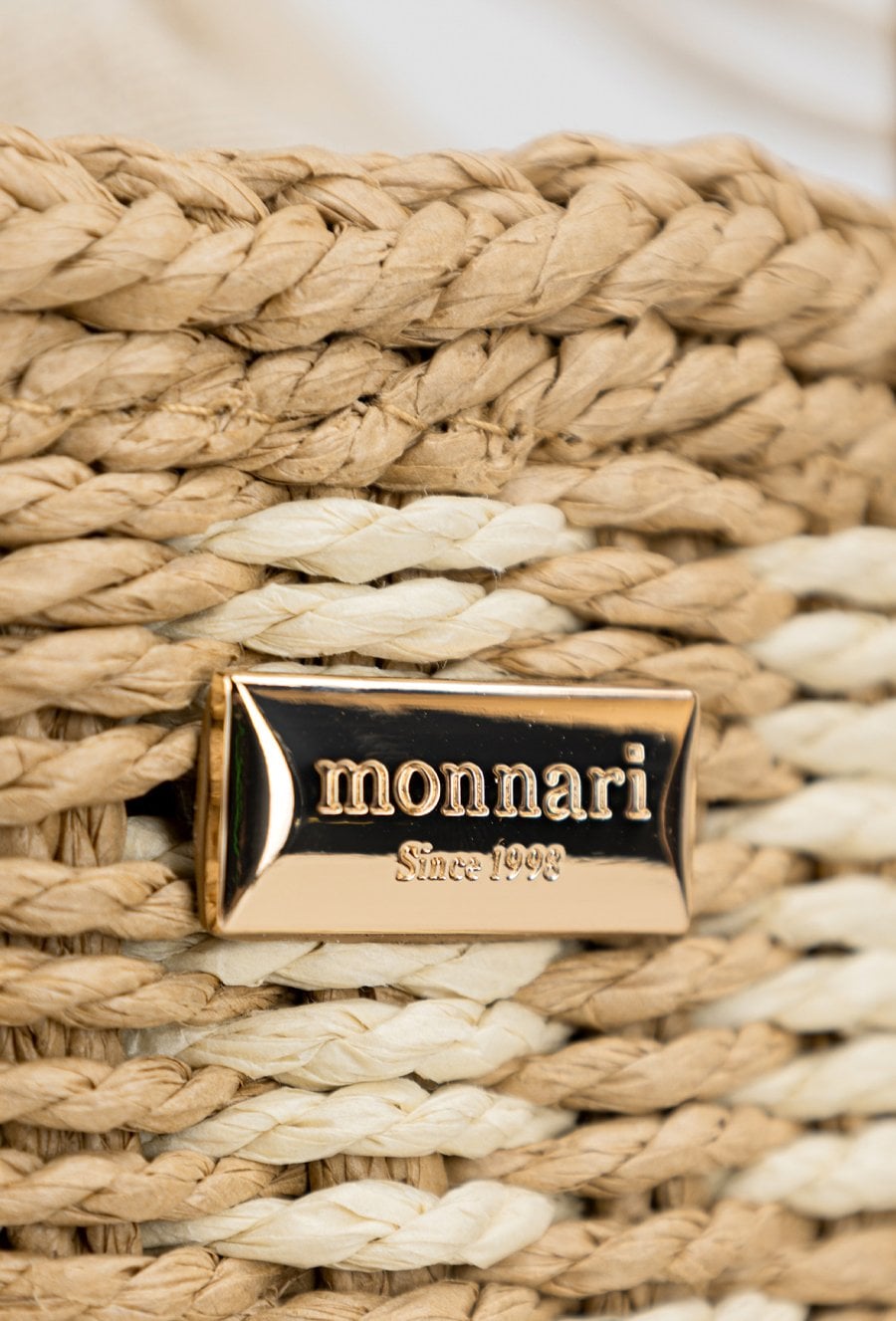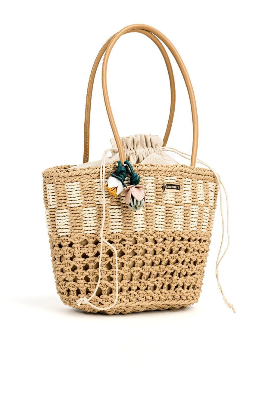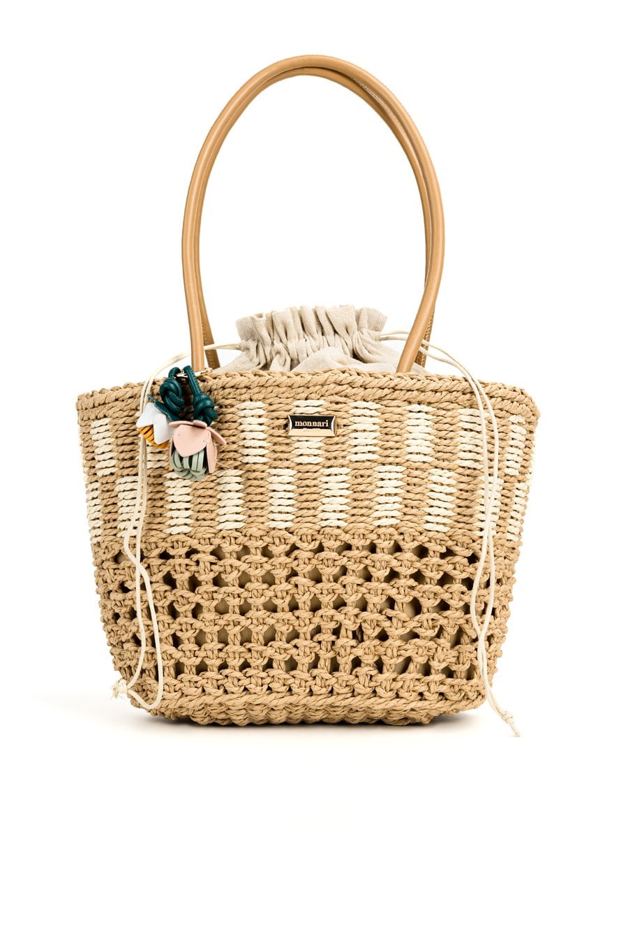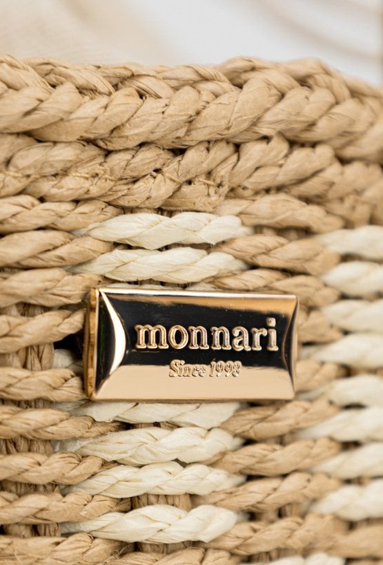 Torebka damska wykonana z plecionki o wymiarach 35 cm x 24,5 cm x 15 cm. Model jednokomorowy z jasną, logowaną podszewką. Zamykana na praktyczny ściągacz, który zapewnia wygodę użytkowania. Całość uzupełniają dekoracyjne zawieszki w formie kwiatków, dodające torebce uroku i letniego charakteru. Idealna do codziennych, letnich stylizacji.