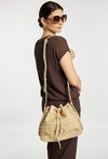 Torba damska typu koszyk z plecionką to modny dodatek na co dzień i na wyjścia. Torba jest jednokomorowa, ma jasną, logowaną podszewkę oraz dodatkowe kieszonki na drobiazgi, które ułatwiają organizację. Torba zawieszona na regulowanym pasku wyróżnia się praktycznym ściągaczem, który stanowi charakterystyczny akcent i pomaga zabezpieczyć zawartość. Torbę należy przechowywać w dołączonym woreczku. Wymiary: 35 cm x 26 cm x 12 cm.