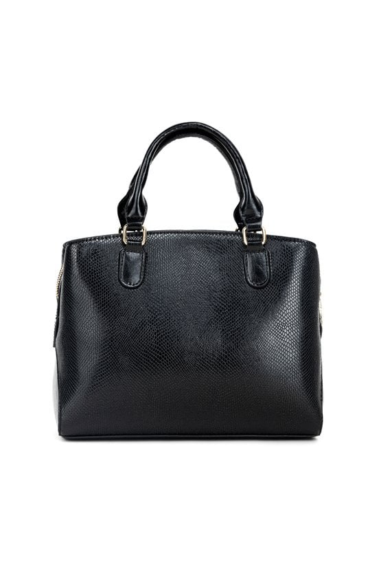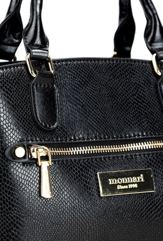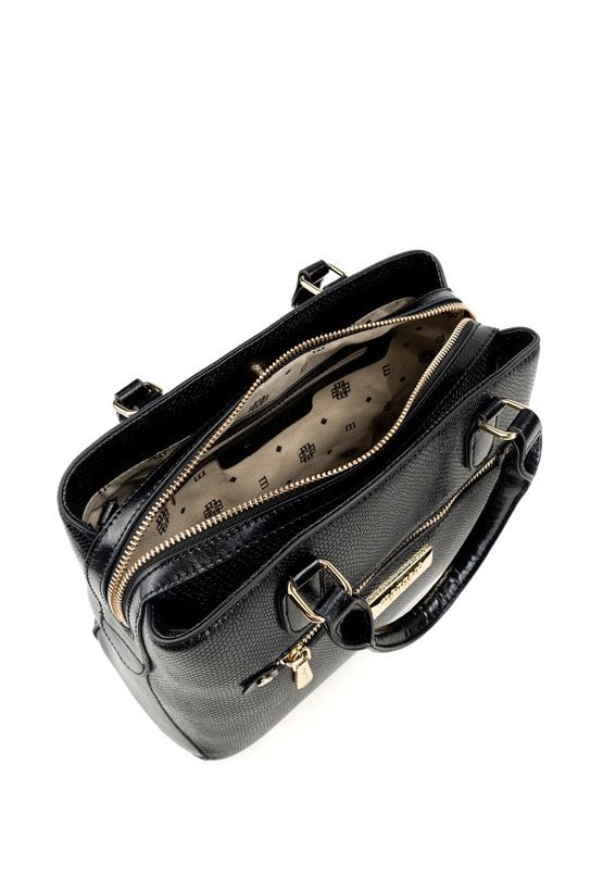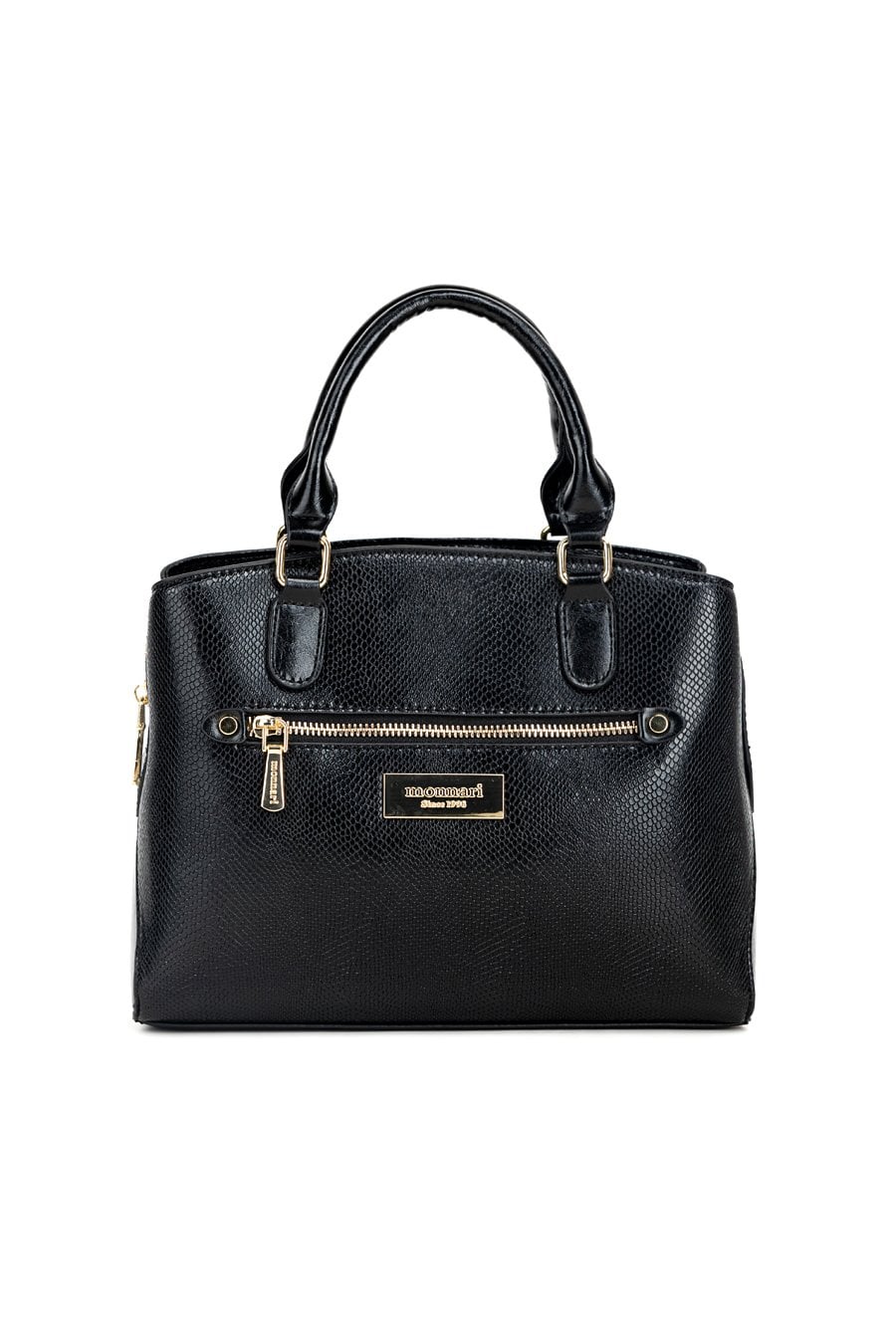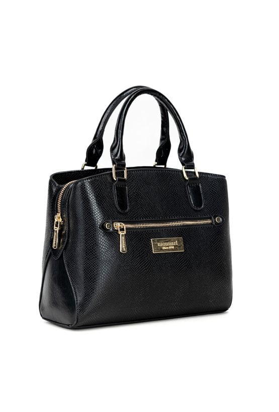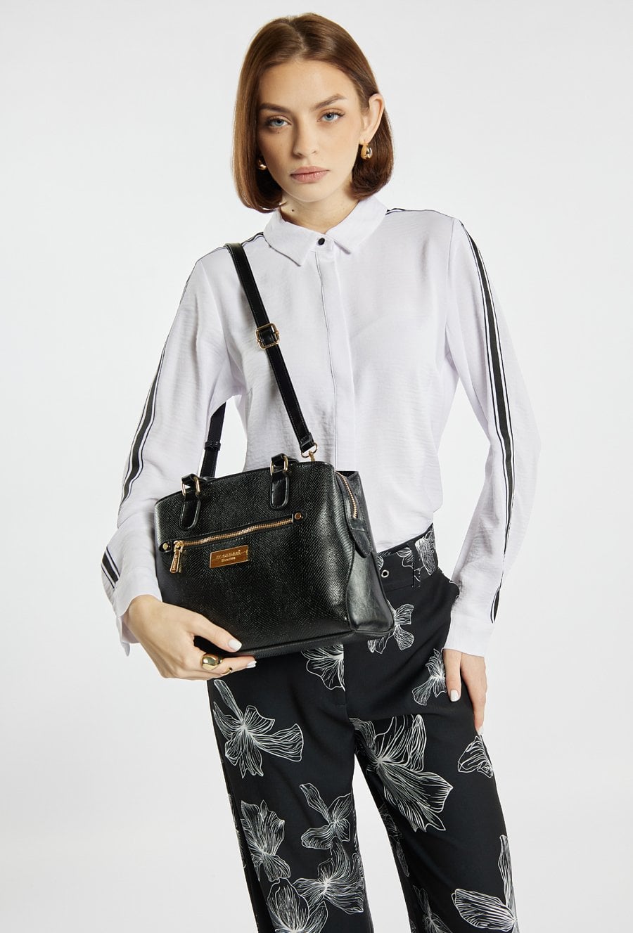 Kuferek damski z logowanym wzorem to elegancka i praktyczna torebka. Torba ma jedną główną komorę zapinaną na suwak oraz dwie dodatkowe komory zapinane na napy, co ułatwia organizację zawartości i szybki dostęp do najpotrzebniejszych rzeczy. Torba została wyposażona w dwie półokrągłe rączki do noszenia w dłoni, a także odpinany pasek na ramię z regulacją. Torbę należy przechowywać w dołączonym woreczku. Wymiary: 28 cm x 22 cm x 12 cm.