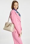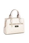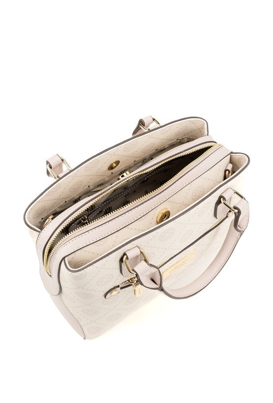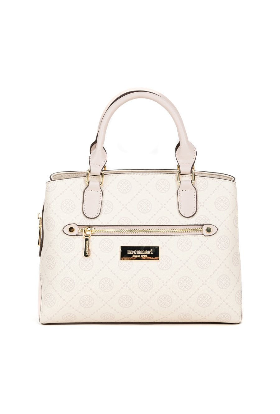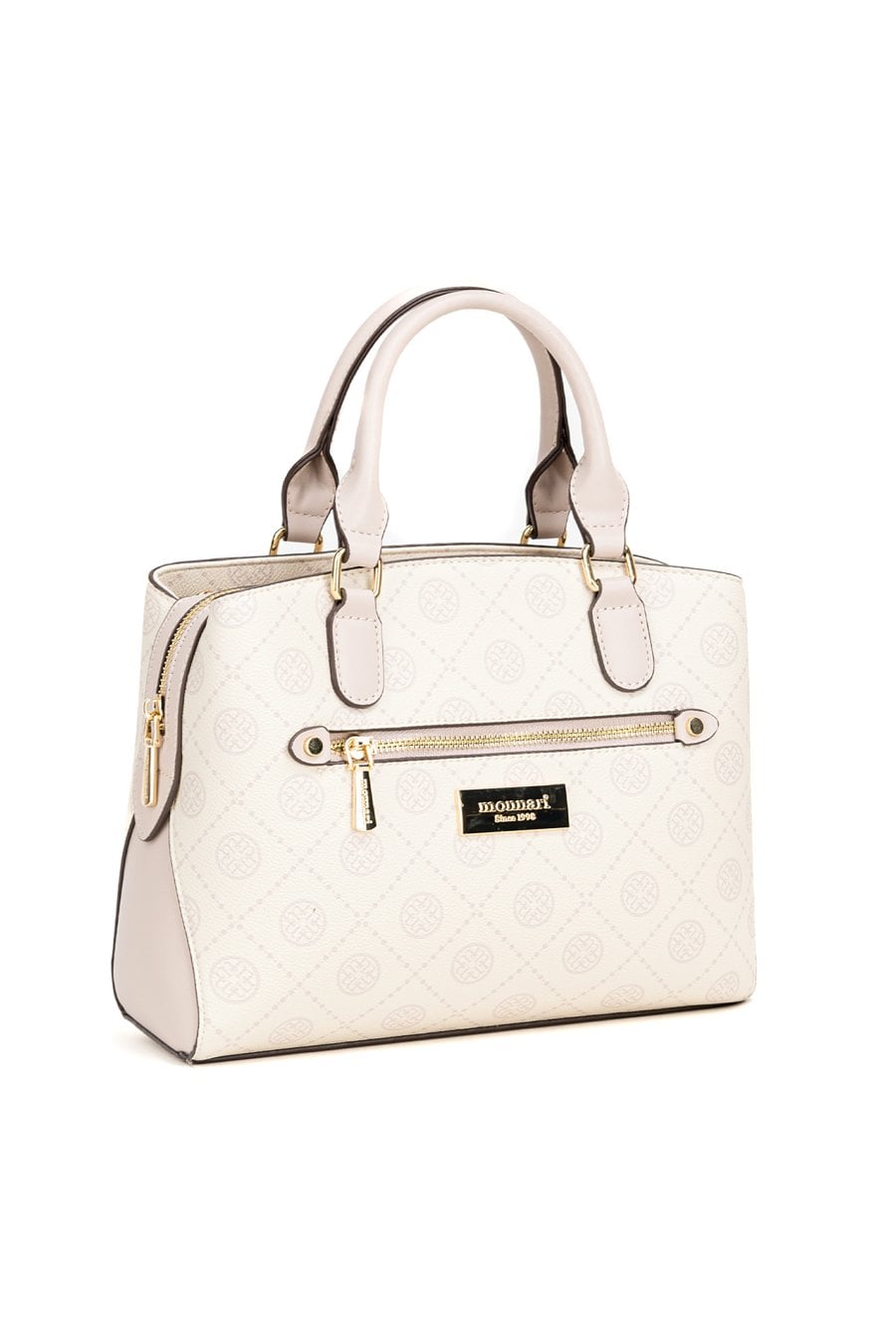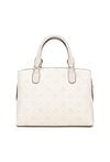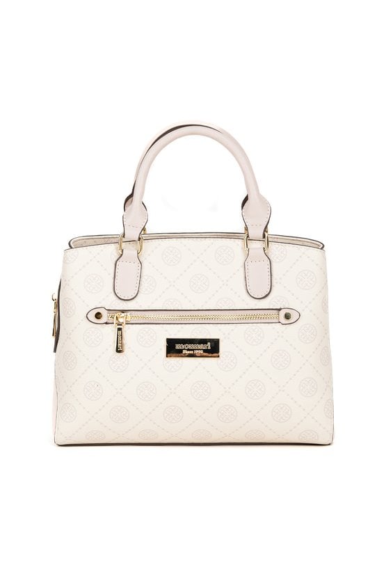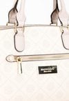 Kuferek damski z logowanym wzorem to elegancka i praktyczna torebka. Torba ma jedną główną komorę zapinaną na suwak oraz dwie dodatkowe komory zapinane na napy, co ułatwia organizację zawartości i szybki dostęp do najpotrzebniejszych rzeczy. Torba została wyposażona w dwie półokrągłe rączki do noszenia w dłoni, a także odpinany pasek na ramię z regulacją. Torbę należy przechowywać w dołączonym woreczku. Wymiary: 28 cm x 22 cm x 12 cm.
