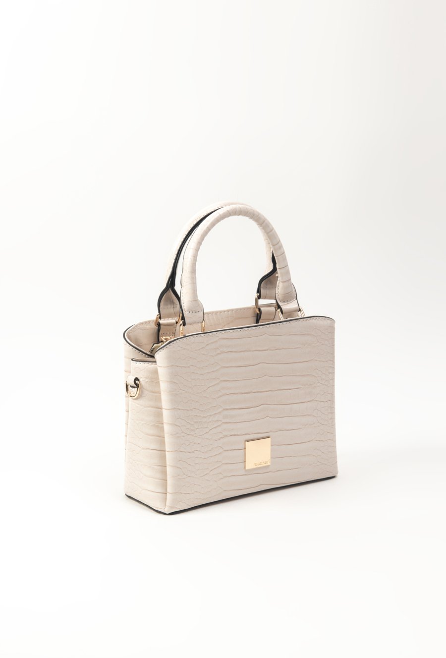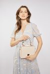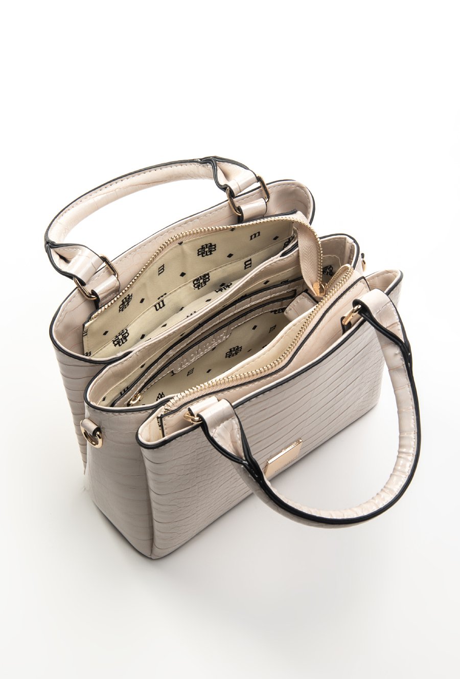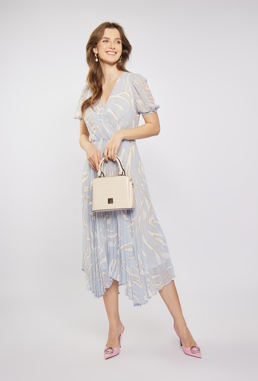 Kuferek damski z wzorem. Torba jednokomorowa o jasnej, logowanej podszewce z dodatkowymi kieszonkami na drobiazgi w środku oraz z tyłu. Torba zapinana na suwak, zawieszona na rączkach. Torba w zestawie ma regulowany pasek z łańcuszkiem. Torbę należy przechowywać w dołączonym woreczku. Wymiary Torby: 21,5 cm x 17,5 cm x 9 cm