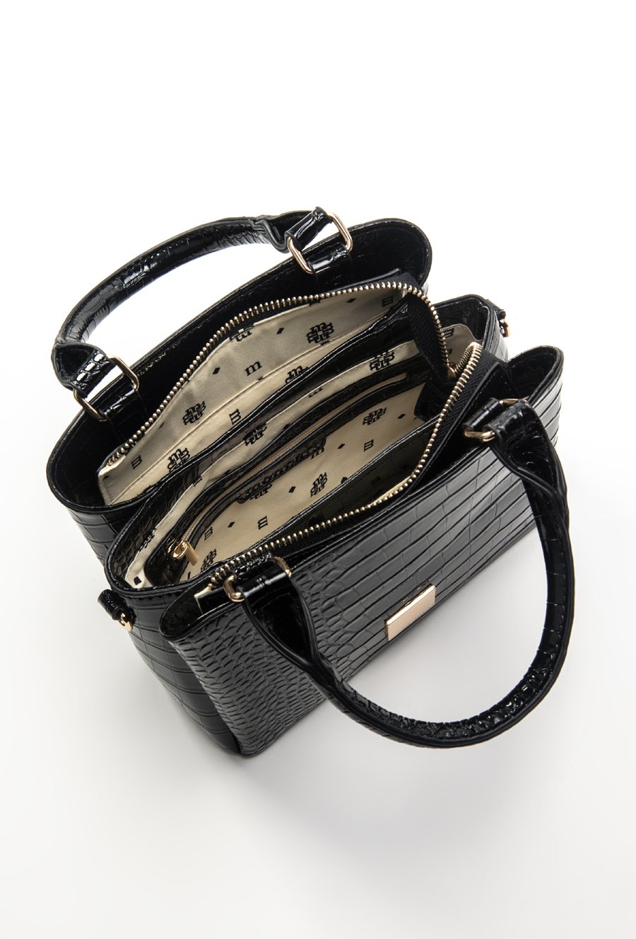 Kuferek damski z wzorem. Torba jednokomorowa o jasnej, logowanej podszewce z dodatkowymi kieszonkami na drobiazgi w środku oraz z tyłu. Torba zapinana na suwak, zawieszona na rączkach. Torba w zestawie ma regulowany pasek z łańcuszkiem. Torbę należy przechowywać w dołączonym woreczku. Wymiary Torby: 21,5 cm x 17,5 cm x 9 cm