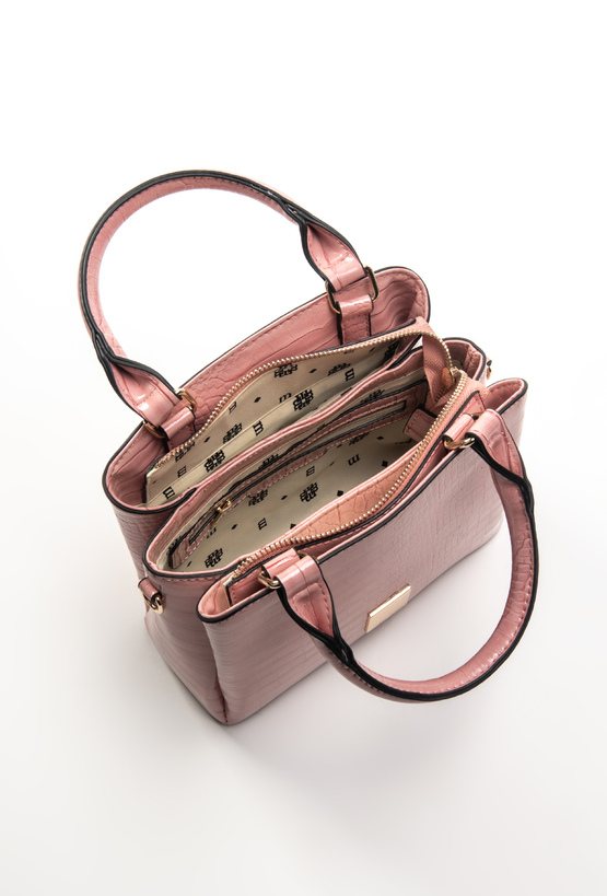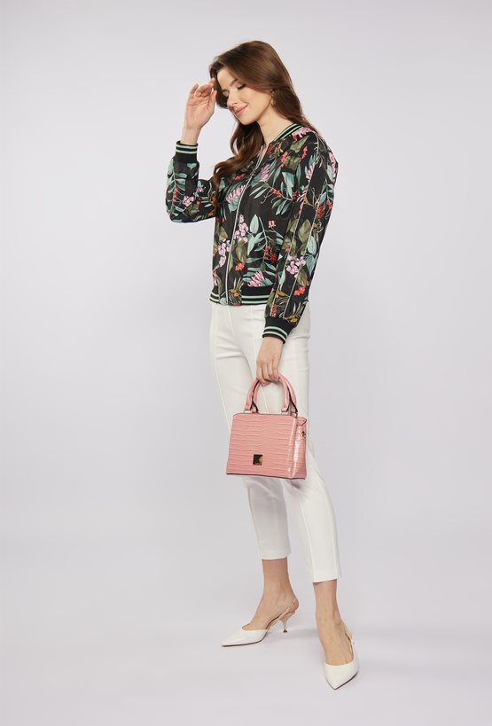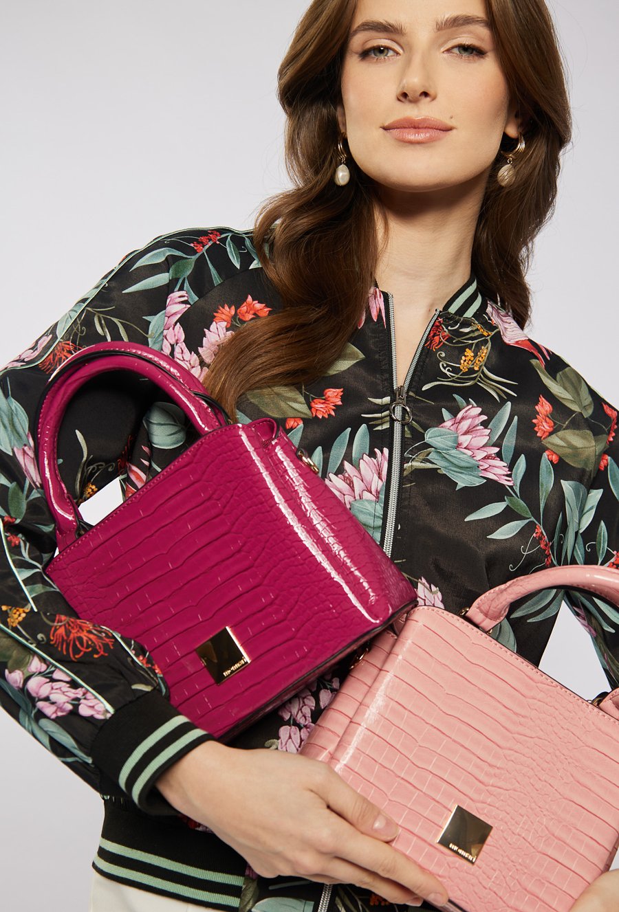Kuferek damski z wzorem. Torba jednokomorowa o jasnej, logowanej podszewce z dodatkowymi kieszonkami na drobiazgi w środku oraz z tyłu. Torba zapinana na suwak, zawieszona na rączkach. Torba w zestawie ma regulowany pasek z łańcuszkiem. Torbę należy przechowywać w dołączonym woreczku. Wymiary Torby: 21,5 cm x 17,5 cm x 9 cm