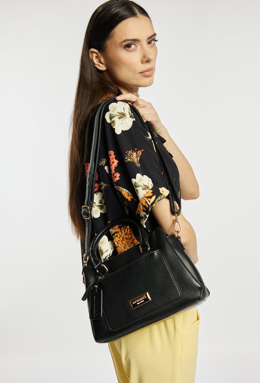 Kuferek damski z kolekcji Premium z ciekawym wzorem. Torba jest trzykomorowa, ma jasne, logowane podszewki oraz dodatkowe kieszonki, które ułatwiają organizację. Torba zawieszona na rączkach, w zestawie ma odpinany, regulowany pasek, a stylowym akcentem jest przywieszka z logo marki Monnari. Należy przechowywać w dołączonym woreczku. Wymiary: 24 cm x 19 cm x 11 cm.