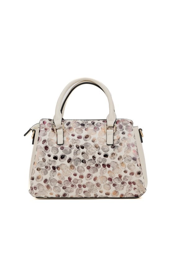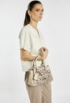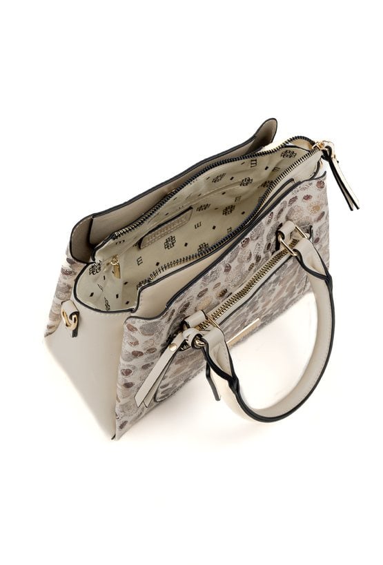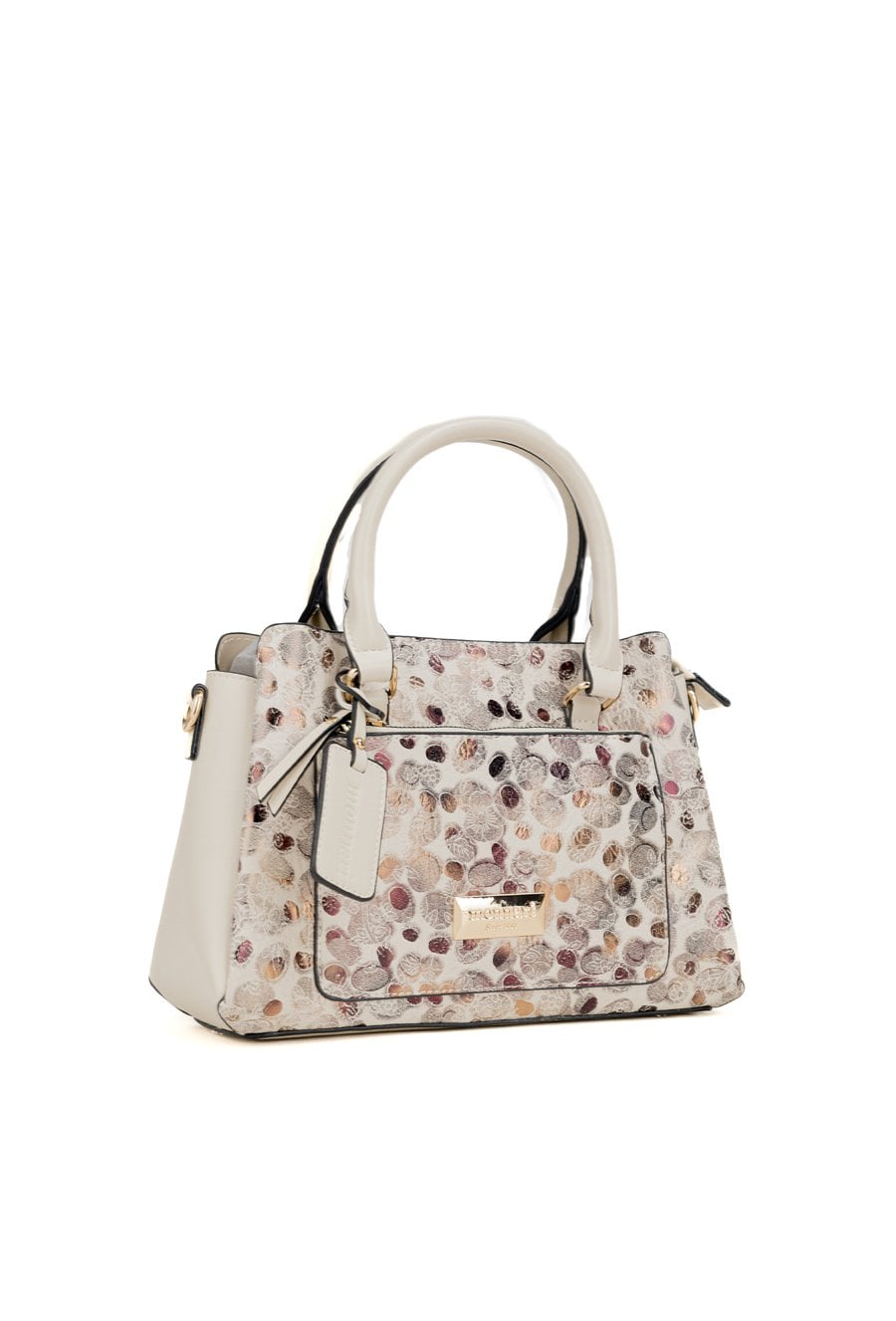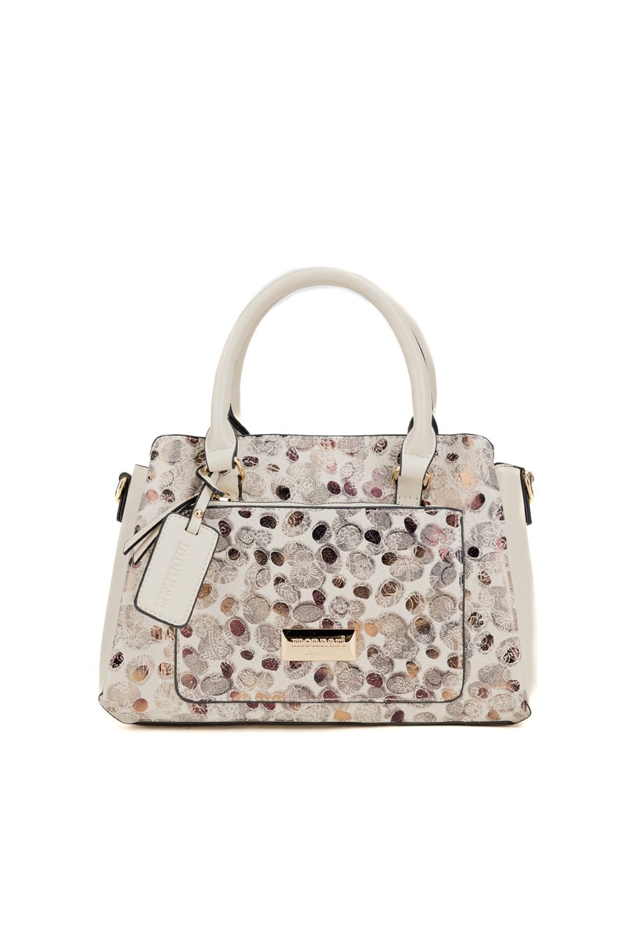 Kuferek damski z kolekcji Premium z ciekawym wzorem. Torba jest trzykomorowa, ma jasne, logowane podszewki oraz dodatkowe kieszonki, które ułatwiają organizację. Torba zawieszona na rączkach, w zestawie ma odpinany, regulowany pasek, a stylowym akcentem jest przywieszka z logo marki Monnari. Należy przechowywać w dołączonym woreczku. Wymiary: 24 cm x 19 cm x 11 cm.
