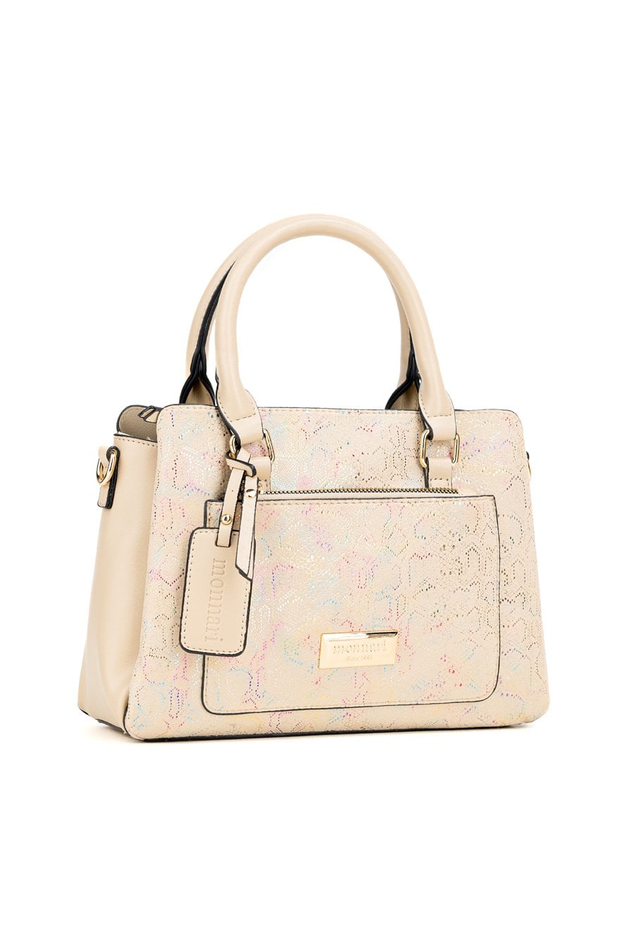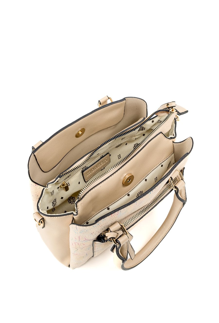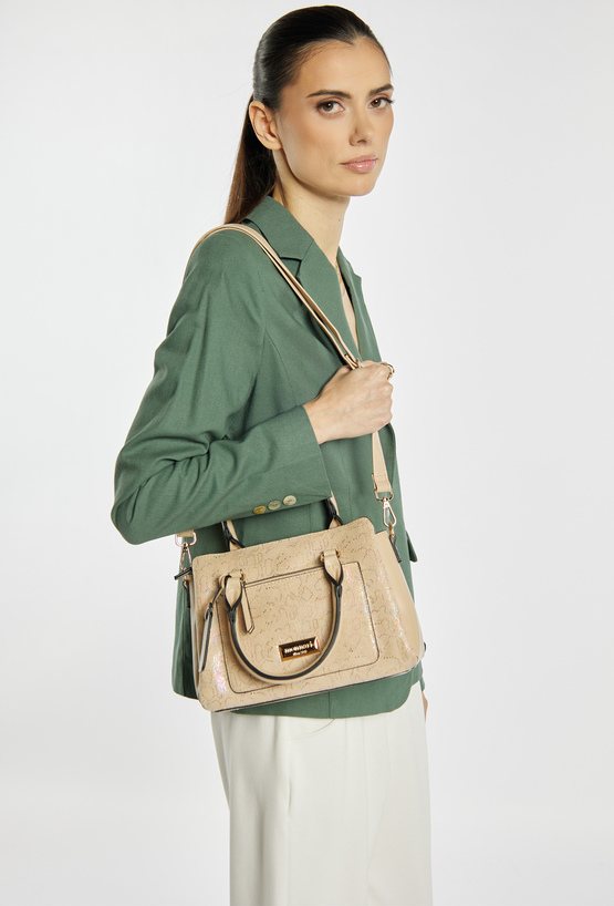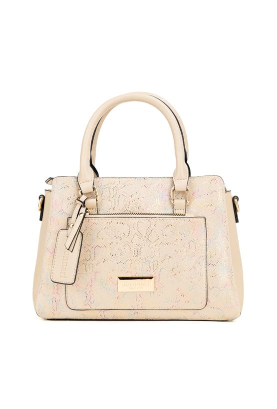 Kuferek damski z kolekcji Premium z ciekawym wzorem. Torba jest trzykomorowa, ma jasne, logowane podszewki oraz dodatkowe kieszonki, które ułatwiają organizację. Torba zawieszona na rączkach, w zestawie ma odpinany, regulowany pasek, a stylowym akcentem jest przywieszka z logo marki Monnari. Należy przechowywać w dołączonym woreczku. Wymiary: 24 cm x 19 cm x 11 cm.