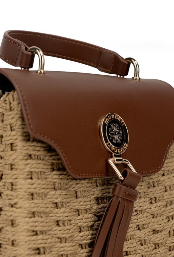 Mała torebka damska z plecionką o wymiarach: 20 cm x 17 cm x 8 cm. Torba jednokomorowa o jasnej, logowanej podszewce z dodatkową kieszonką w środku. Torebka z klapą ozdobioną logo marki Monnari oraz frędzlami. Model zawieszony na rączce, w zestawie regulowany pasek. Torbę należy przechowywać w dołączonym woreczku.